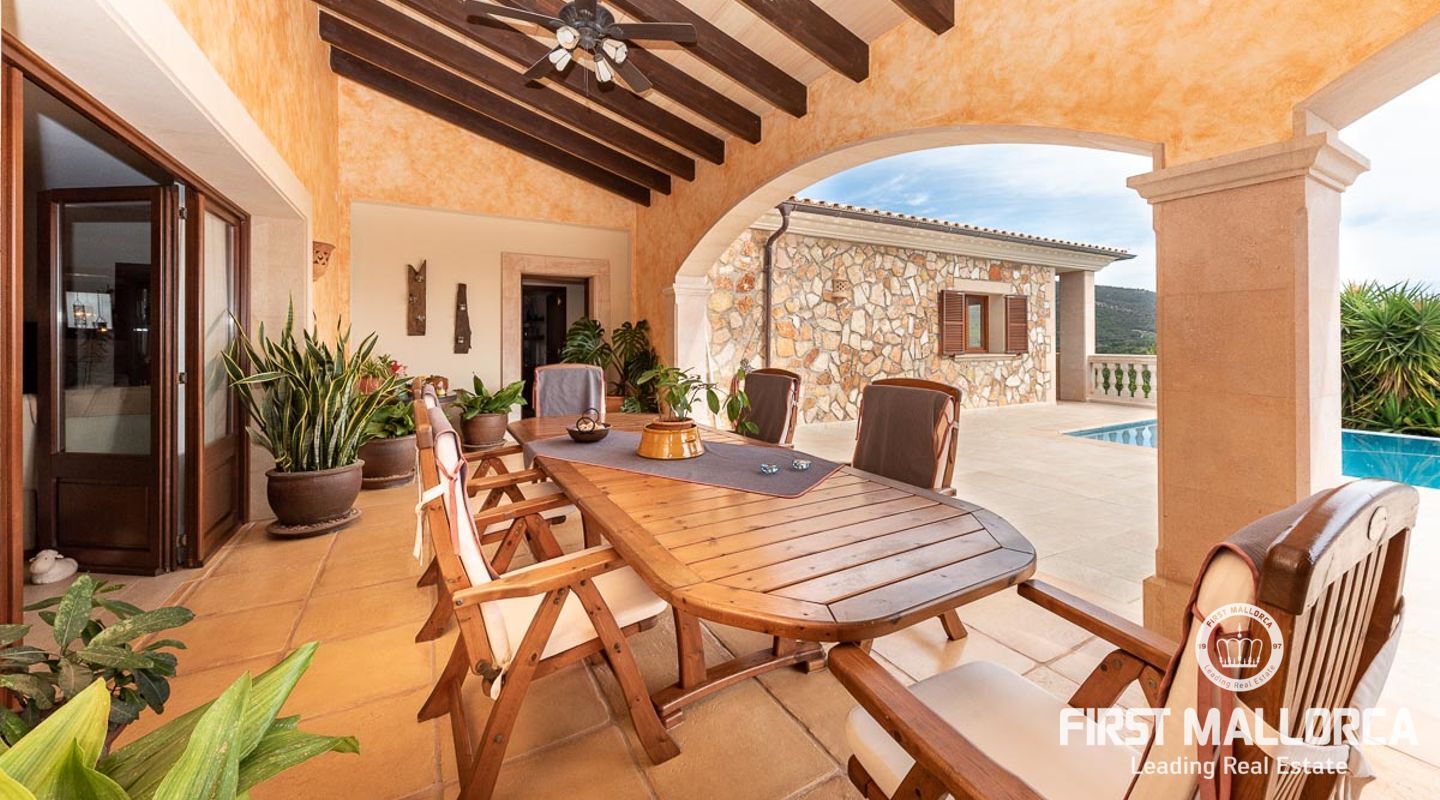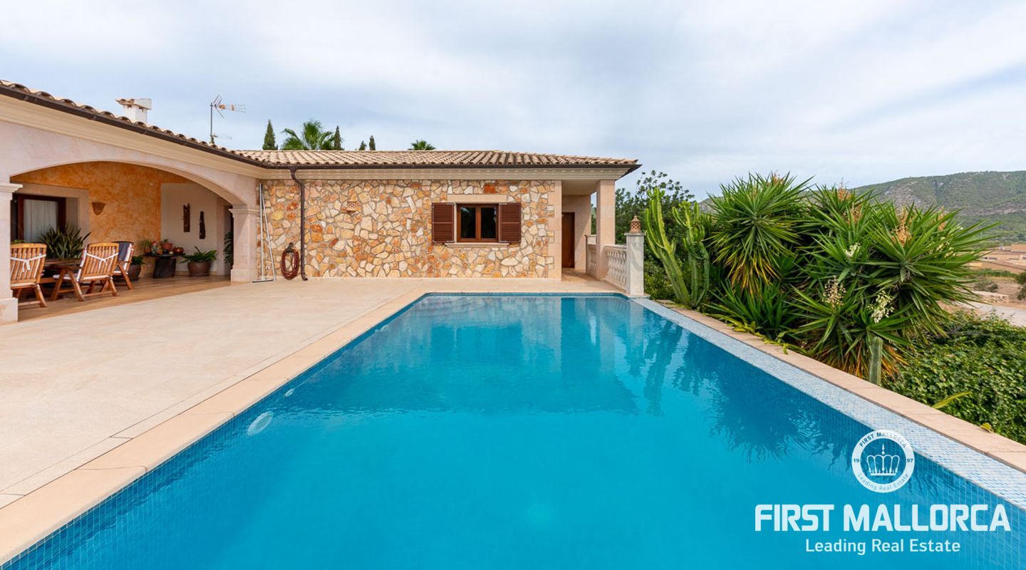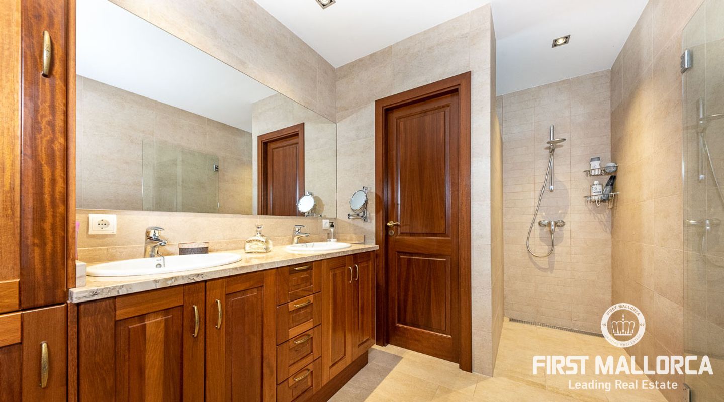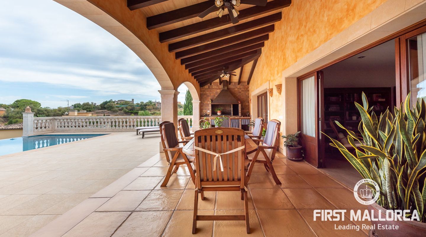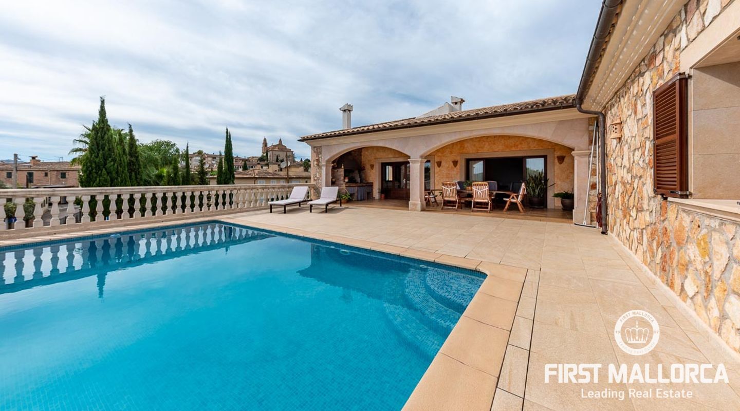 This attractive country house is situated in a peaceful, yet central part of the dynamic village of Calviá which is nestled between the mountains and the sea along the sought-after southwest coast of Mallorca. The property enjoys a very comfortable and attractive layout where the living room, dining room and spacious kitchen together with the three double bedrooms, whereof two have en-suite bathrooms, are all situated on one level with direct access to the swimming pool and surrounding terrace as well as a barrier-free access from the street. On the lower garden level one finds a spacious one bedroom guest apartment with separate living room and en-suite bathroom as well as an office and a large store room. The spacious garage offers 3 parkings and has an easy access. The natural gathering point is on the pool terrace where there is a big porch with space for a large dining table and with a barbecue, adapted for preparingbig family meals. The front garden has a pond and some fruit trees. Additional features of this fine home include hot & cold air conditioning, central oil heating with radiators, high ceilings with exposed wodden beams, fully equipped kitchen with high-end utilities and a laundry room. The Calvià village is very popular both permanent residents and holiday home owners thanks to its lively atmosphere with a good selection of restaurants, cafeterias and shops. The beaches of Palmanova and Portals are less than a 10-minute drive away and so if the marina of Puerto Portals. The city centre of Palma is reached in just over 15 minutes and the international airport in 20 minutes.
