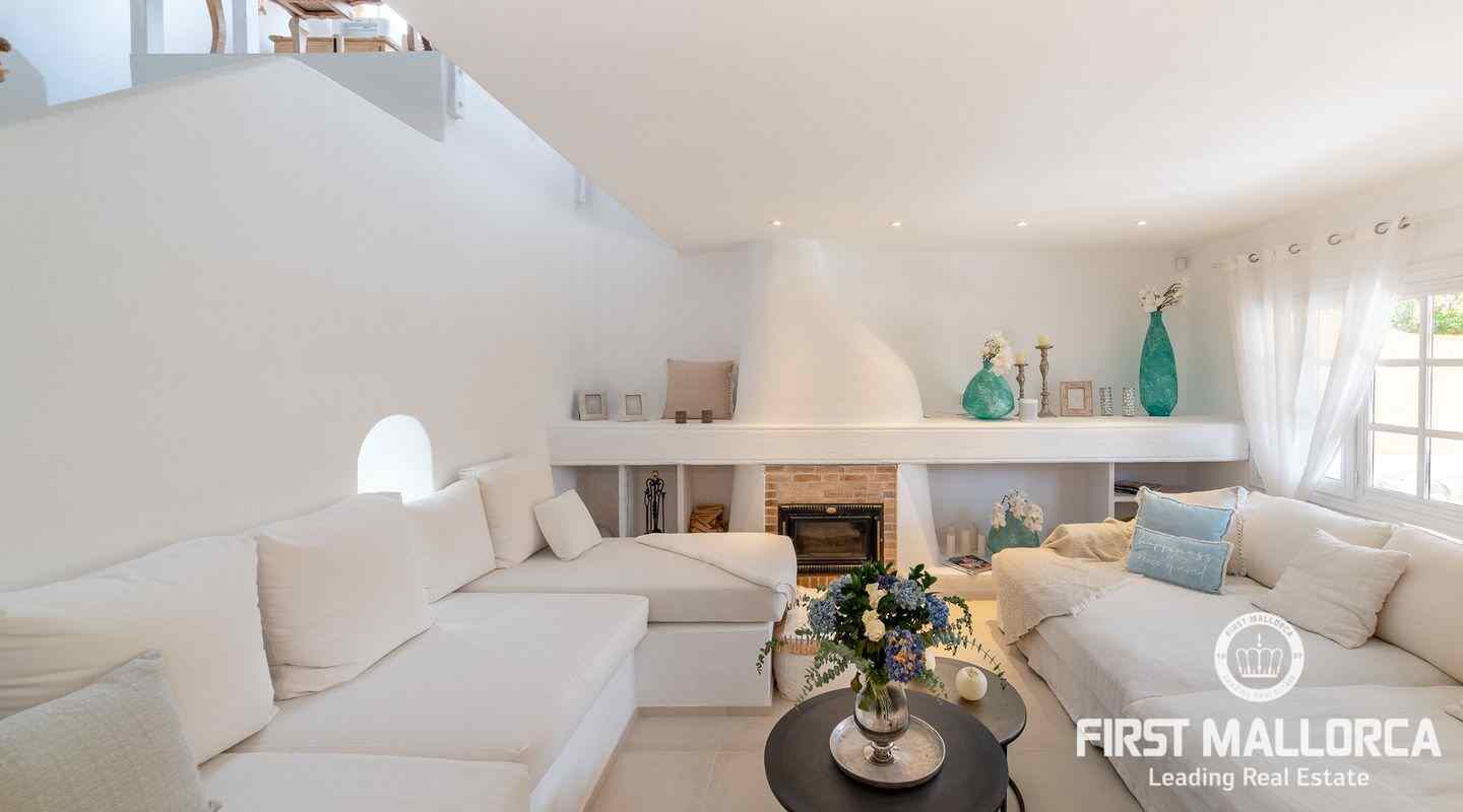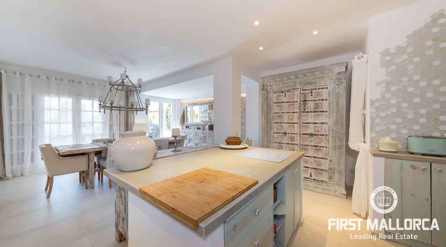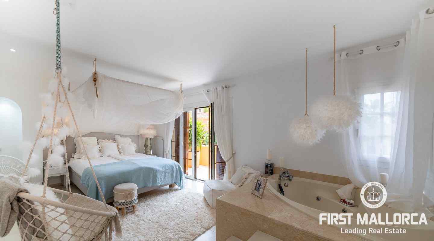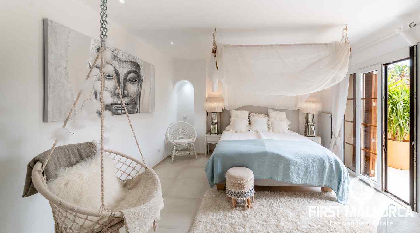 The villa that shines on two levels with an Ibiza-Style interior offers a constructed area of 186 m2 and comes with 3 bedrooms, 2 bathrooms, one of them ensuite and a seperate guest WC. There is a bright open living-dining area and an inviting open plan kitchen with cooking island. In the exterior part you can enjoy the beautiful terrace with lounge area and private jacuzzi. From the roof top terrace you there are magnificent views.