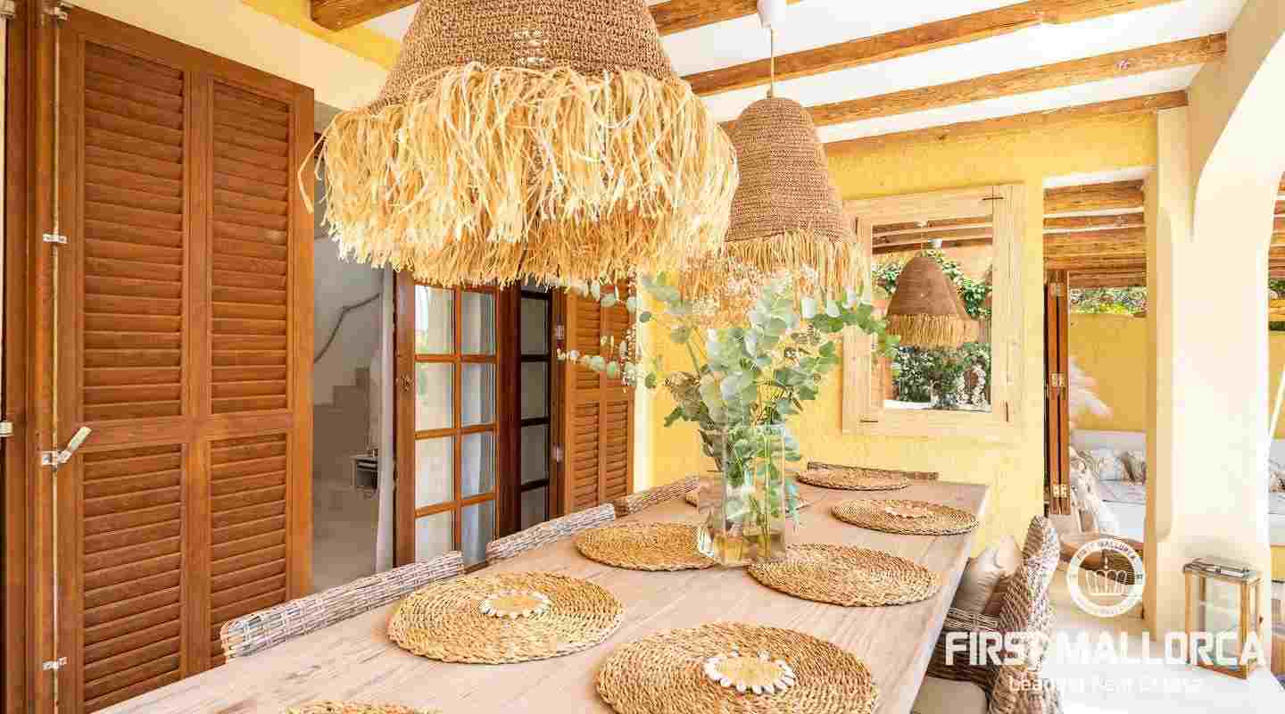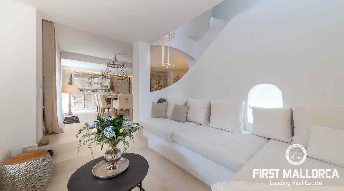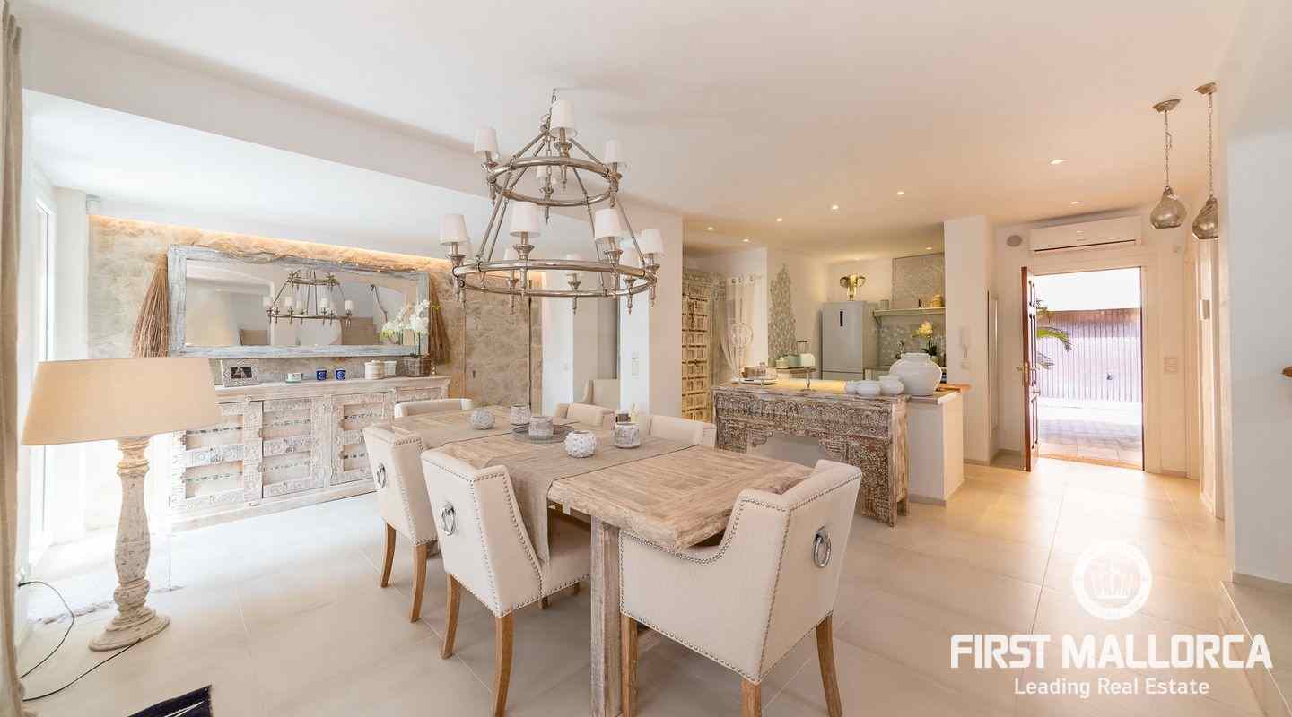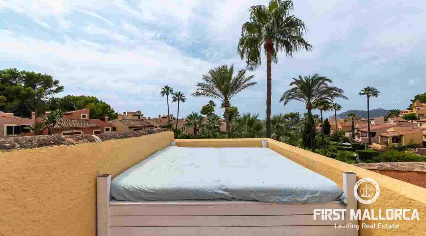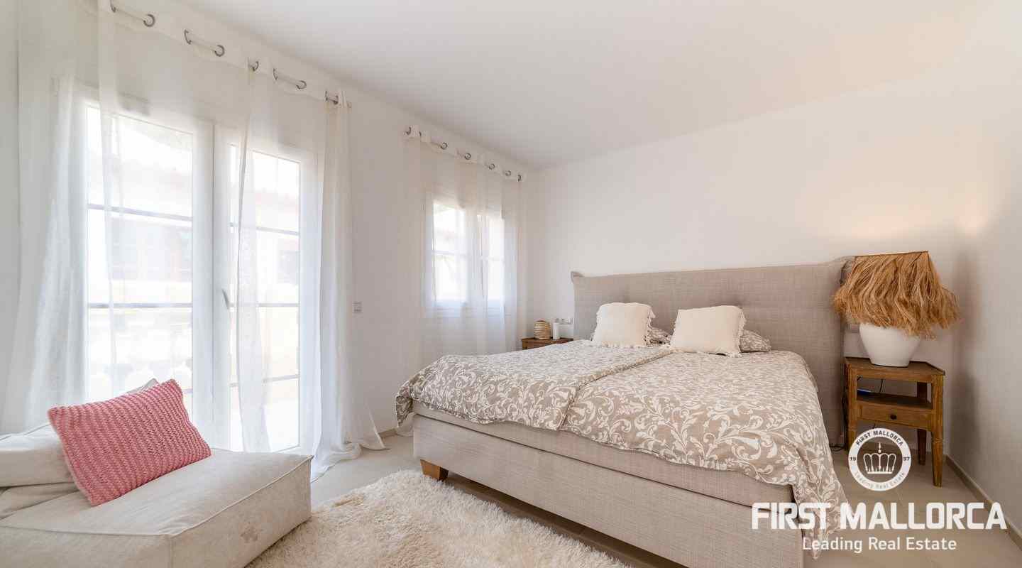 The villa that shines on two levels with an Ibiza-Style interior offers a constructed area of 186 m2 and comes with 3 bedrooms, 2 bathrooms, one of them ensuite and a seperate guest WC. There is a bright open living-dining area and an inviting open plan kitchen with cooking island. In the exterior part you can enjoy the beautiful terrace with lounge area and private jacuzzi. From the roof top terrace you there are magnificent views.