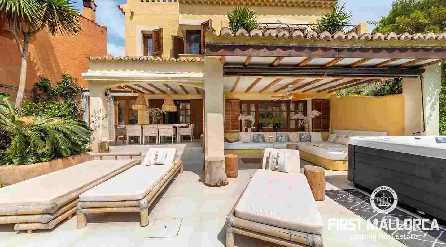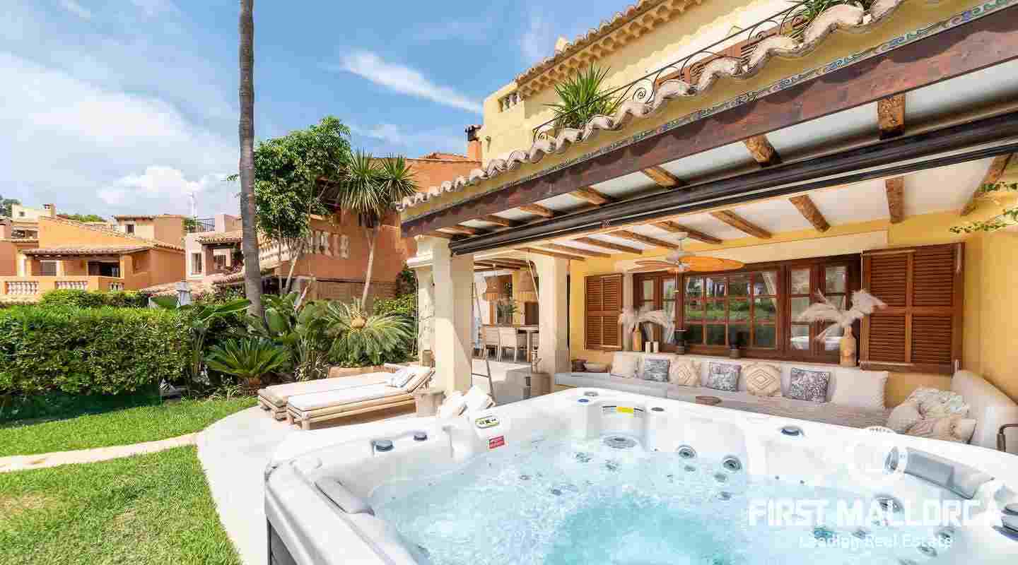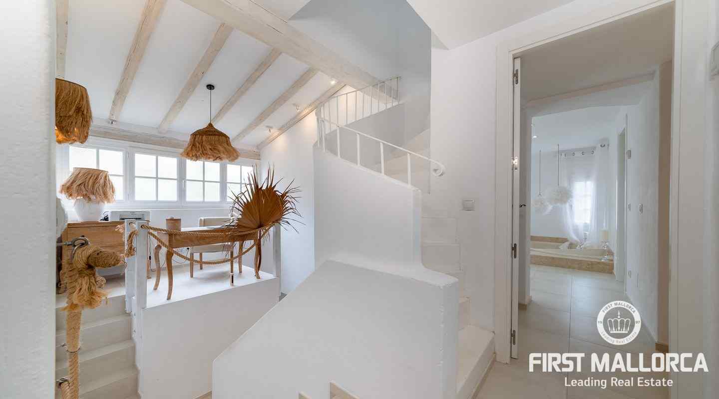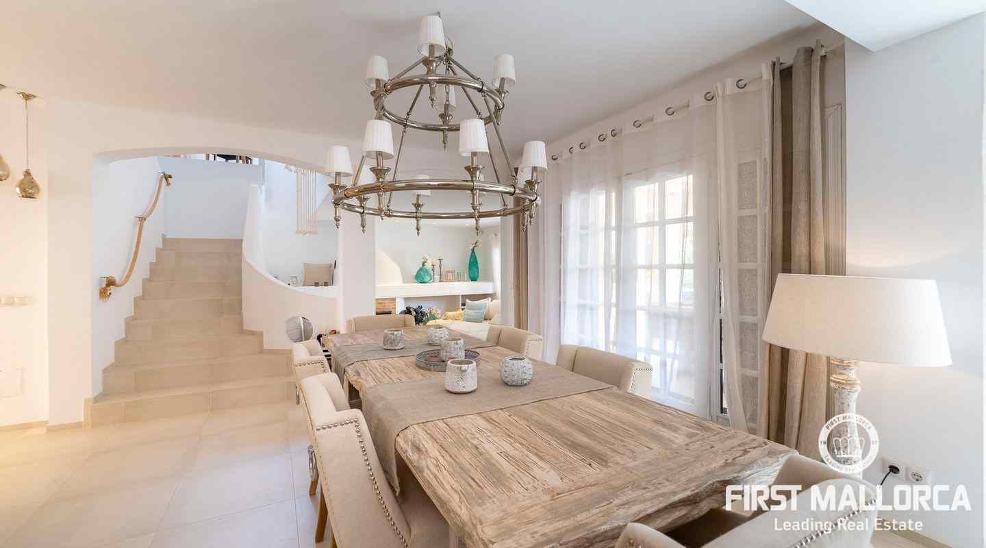 The villa that shines on two levels with an Ibiza-Style interior offers a constructed area of 186 m2 and comes with 3 bedrooms, 2 bathrooms, one of them ensuite and a seperate guest WC. There is a bright open living-dining area and an inviting open plan kitchen with cooking island. In the exterior part you can enjoy the beautiful terrace with lounge area and private jacuzzi. From the roof top terrace you there are magnificent views.