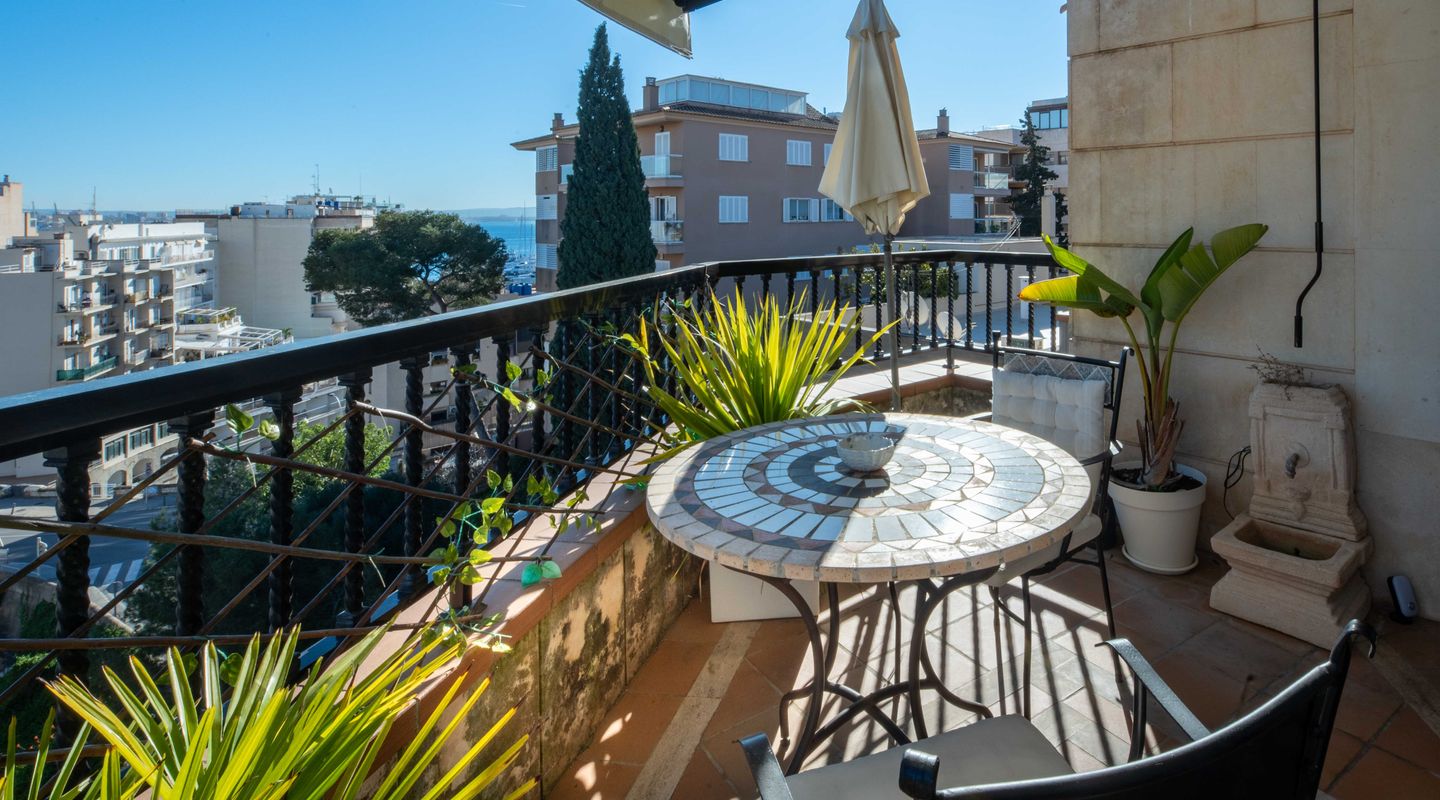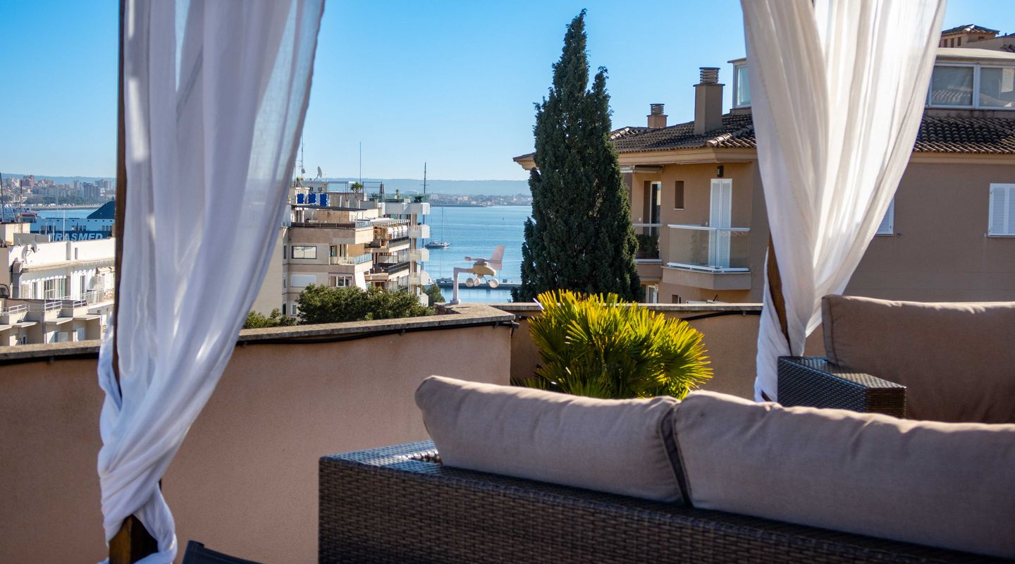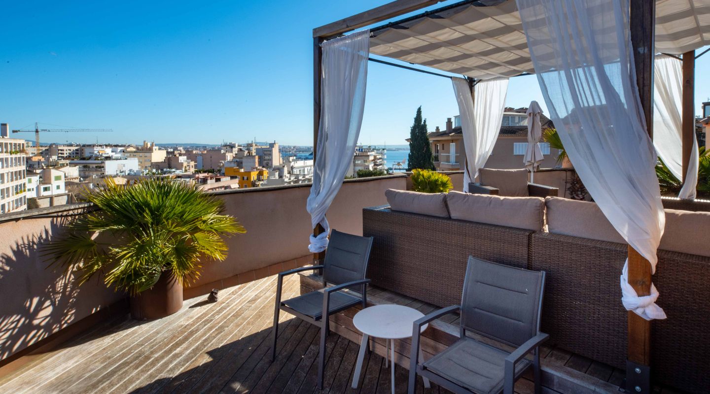 An absolute highlight is the spacious roof terrace with its magnificent views of the city and the port of Palma de Mallorca. From here, you can also enjoy a partial sea view – the perfect place to relax or watch the sunset.