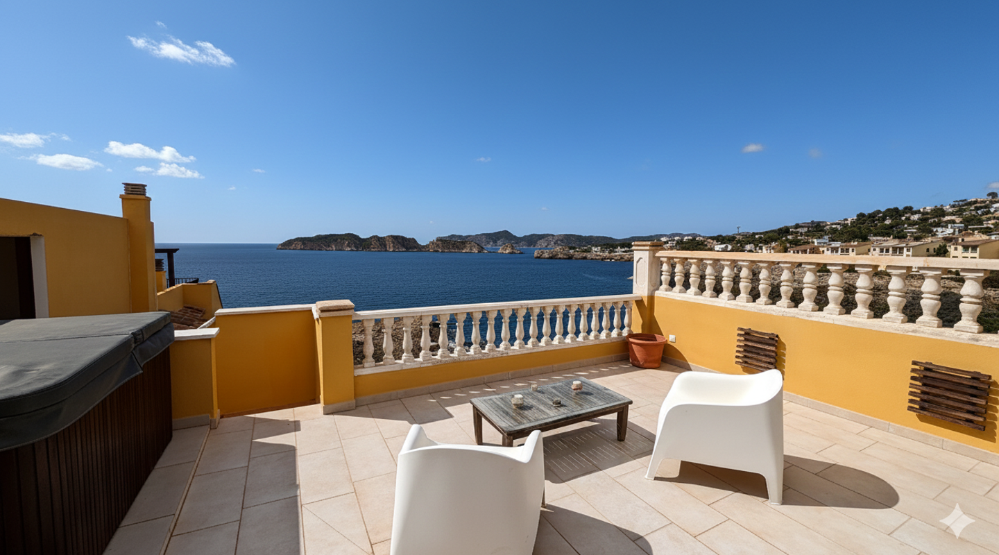 This exclusive penthouse for sale is located in Nova Santa Ponsa, one of the most sought-after areas of Calvià. It is a modern property with spacious terraces arranged over two levels and an approximate built area of 100 m².