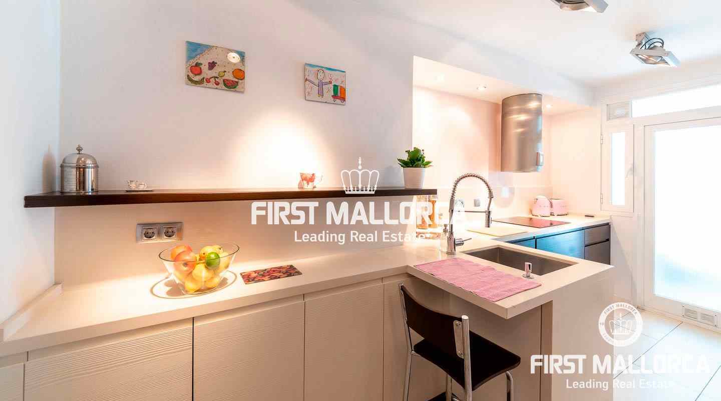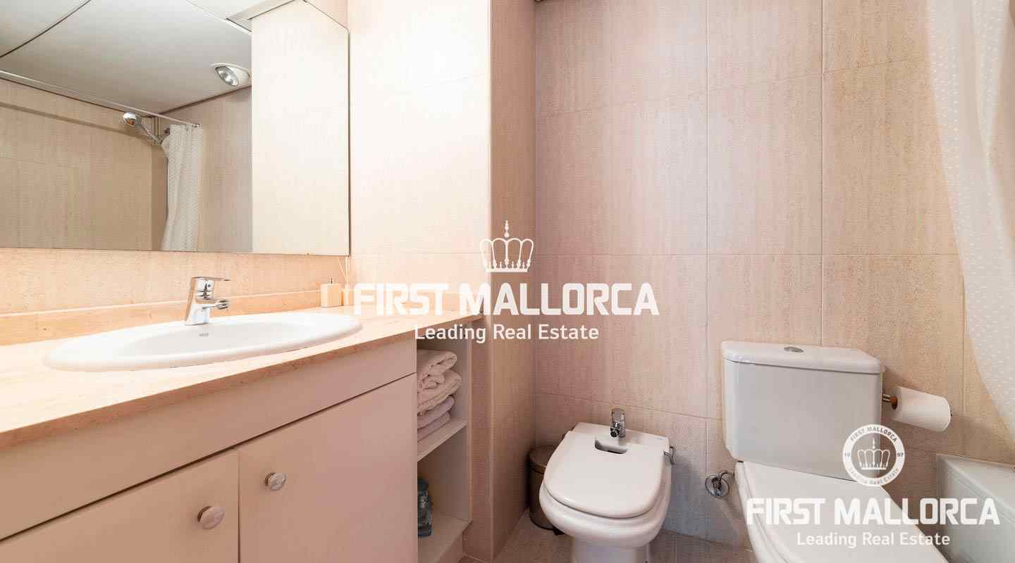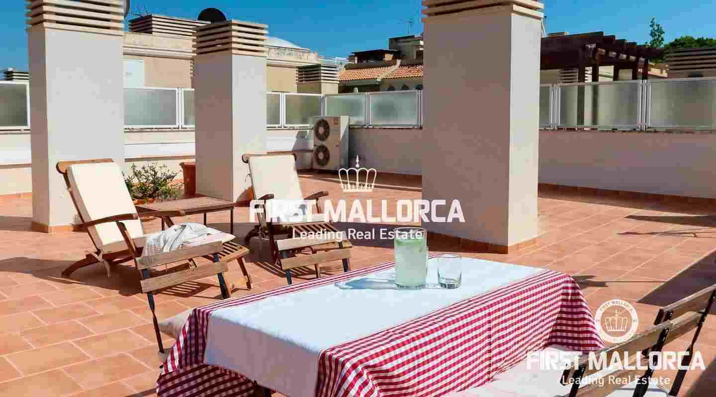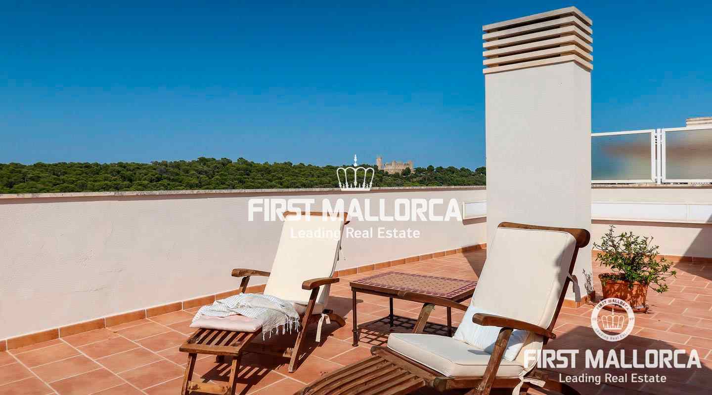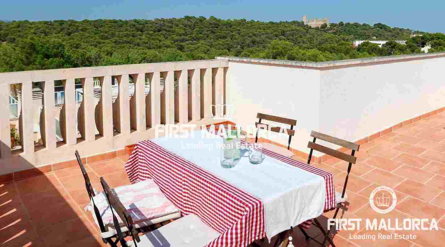 This penthouse in a well-kept, popular complex in the Bonanova district of Palma impresses with its large roof terrace and the view of the Castell Bellver. The east-facing apartment offers 3 bedrooms, 2 bathrooms, an equipped kitchen, living room, a utility room and a guest toilet. The residential complex offers 2 community pools with an outside toilet.