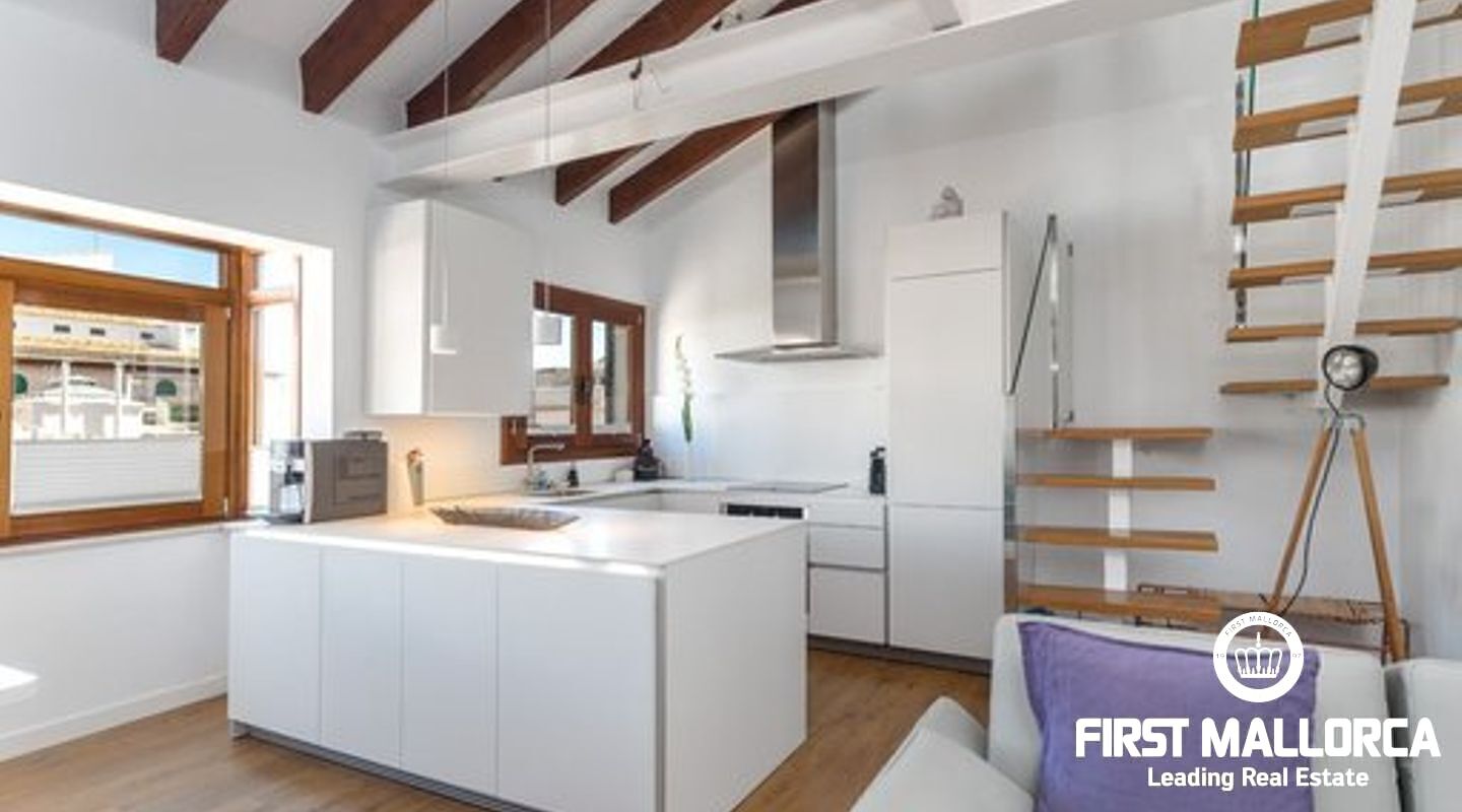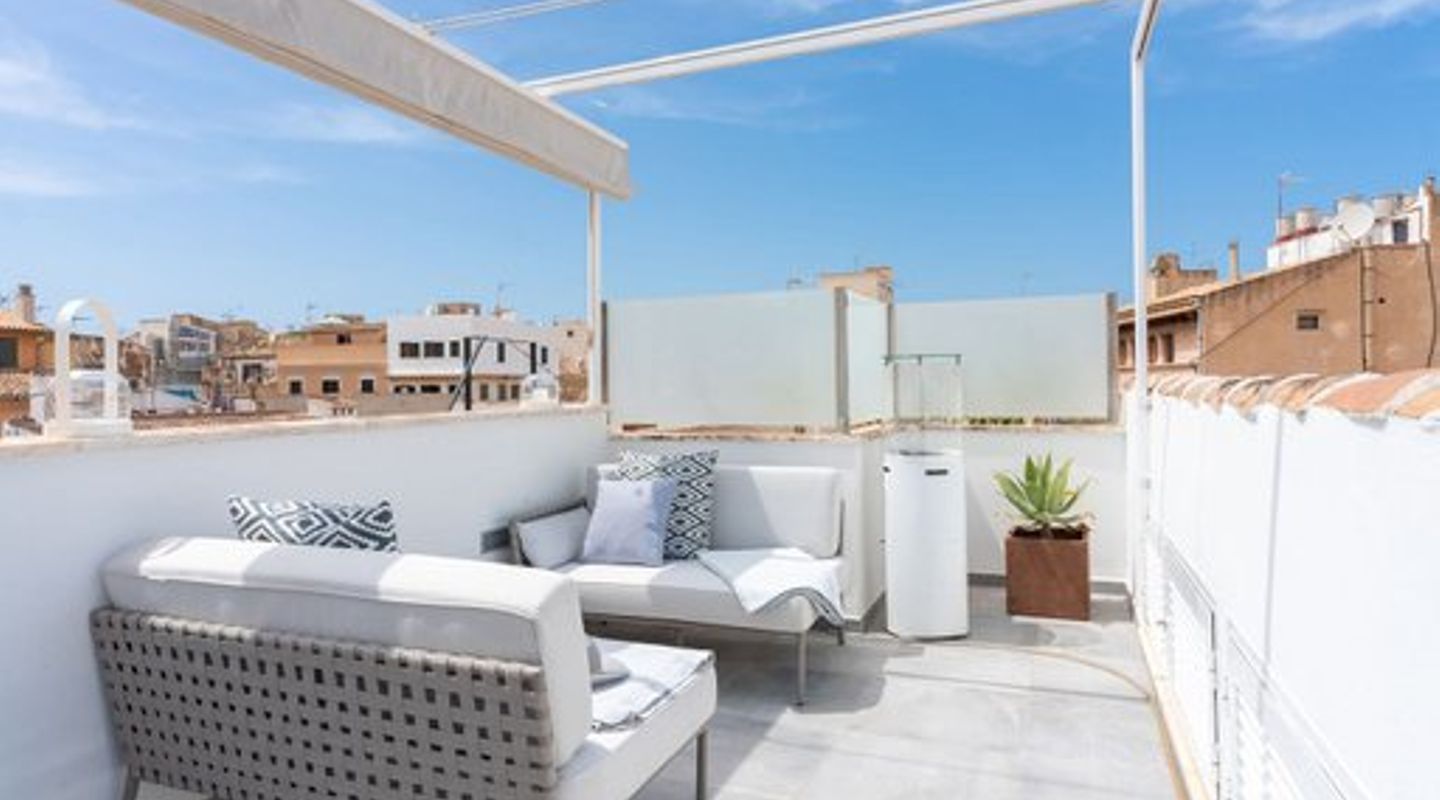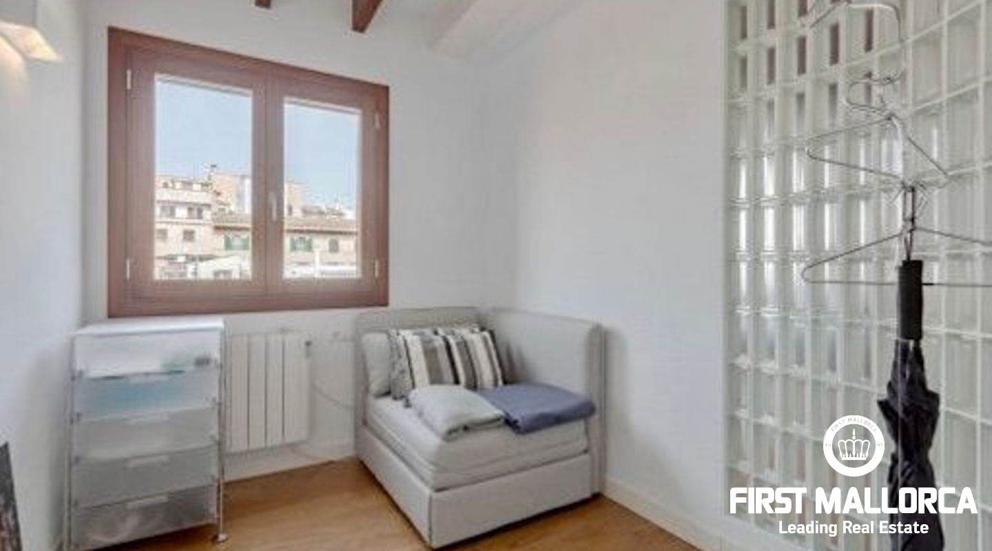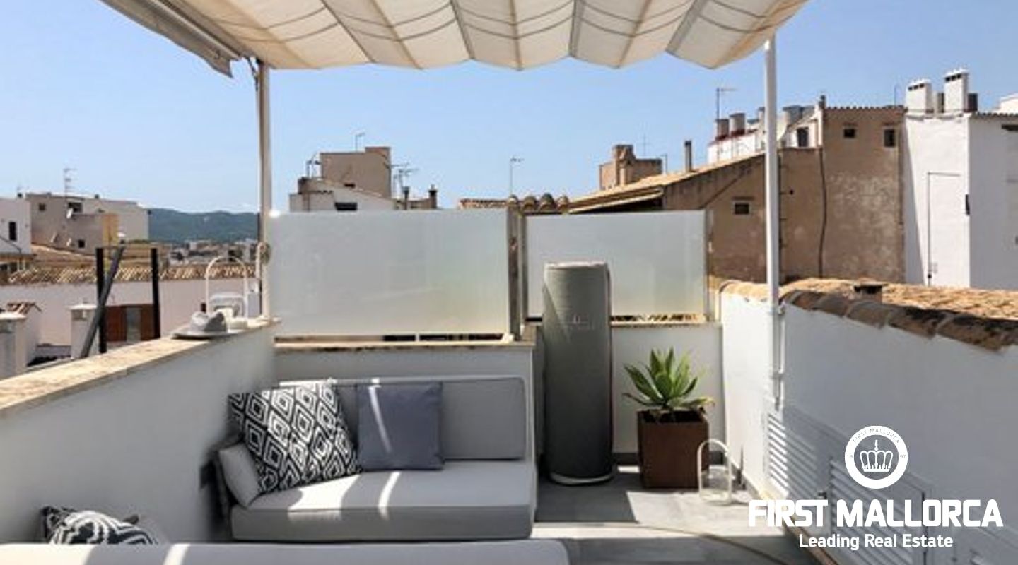 This duplex penthouse is situated in a quiet side street in one of the most popular areas of Palma Old Town, only a few steps away from the Plaza Mayor and the famous shopping street Calle Sant Miguel. The flat was completely refurbished in 2017, is located on the third floor without lift of a Mallorcan palace with the characteristic patio and is developed on two levels On the main level there is the spacious living/dining room with fireplace and the bright open plan Bulthaup kitchen. There is also the master bedroom with en suite bathroom with underfloor heating. Guest bathroom with a small shower room and a further small, bright room which can be used as a bedroom or office. A staircase leads to the upper floor consisting of a single open room with sloping ceiling from which you access the sunny private roof terrace (approx. 13 m²). The roof terrace offers a fantastic view over the rooftops of the old town. Some extra details: