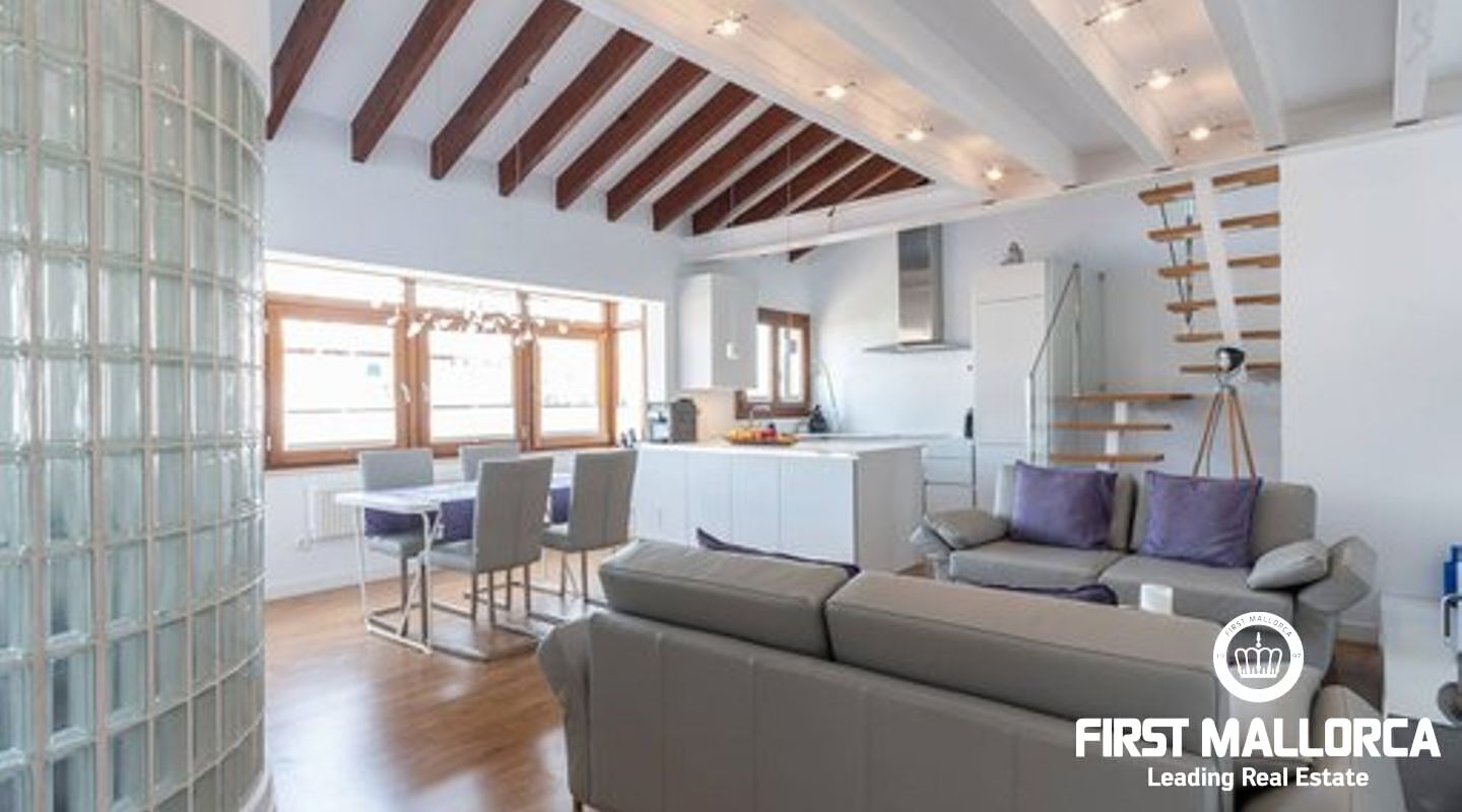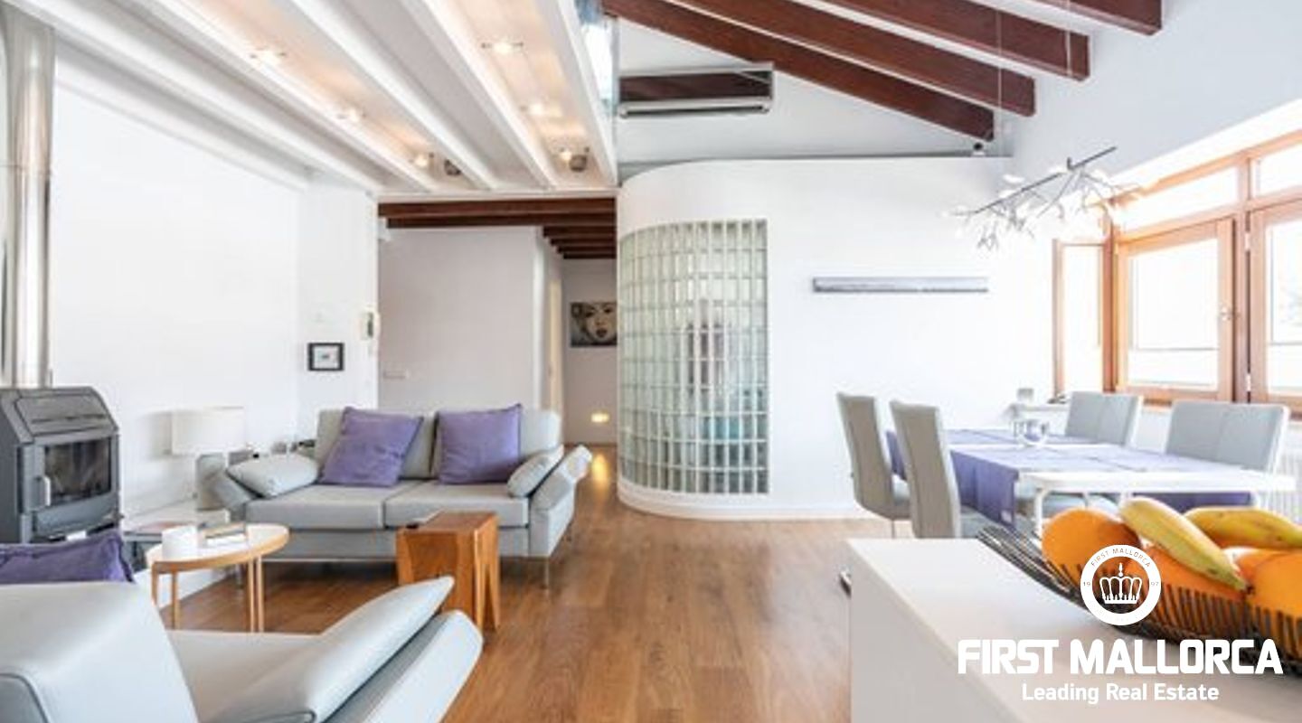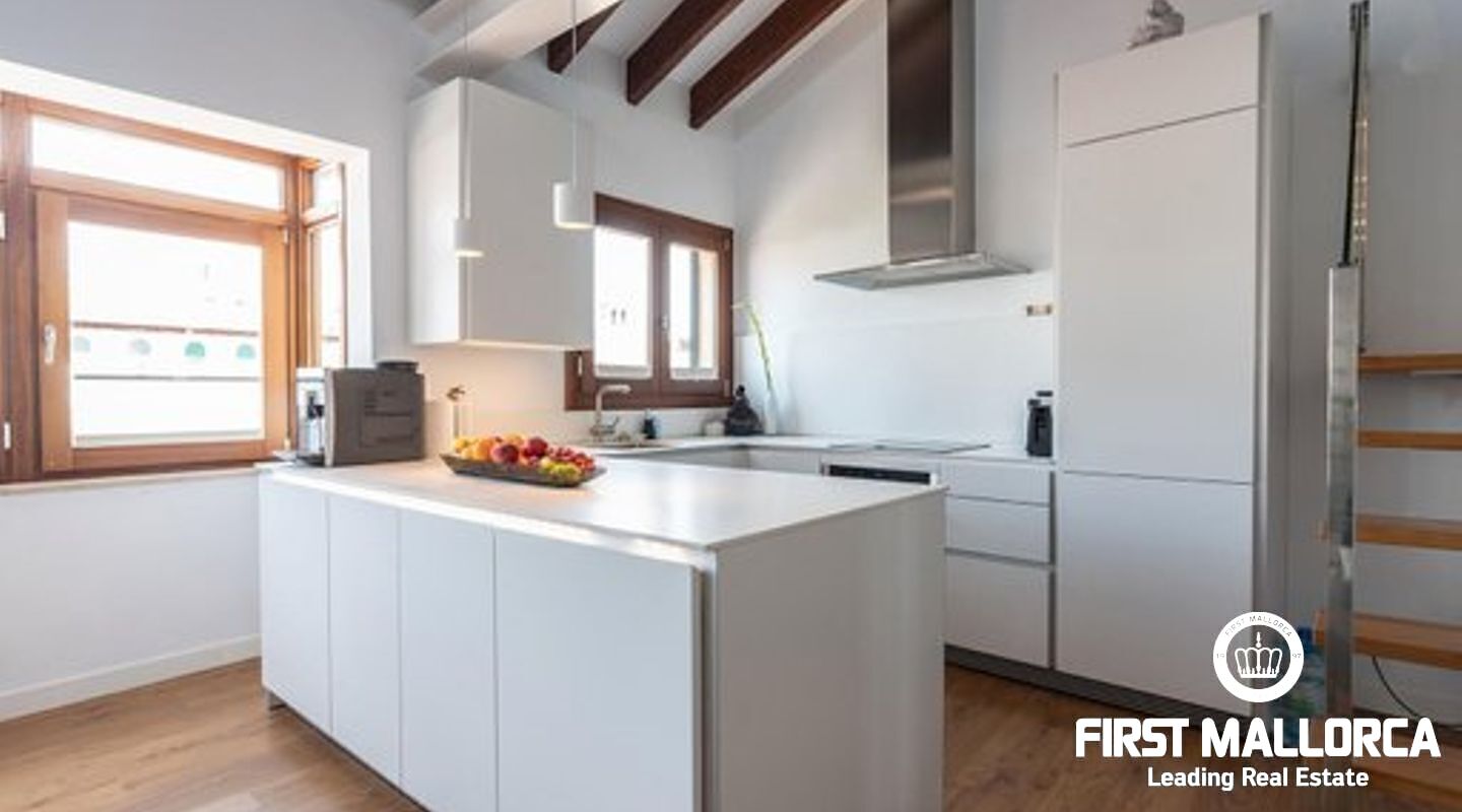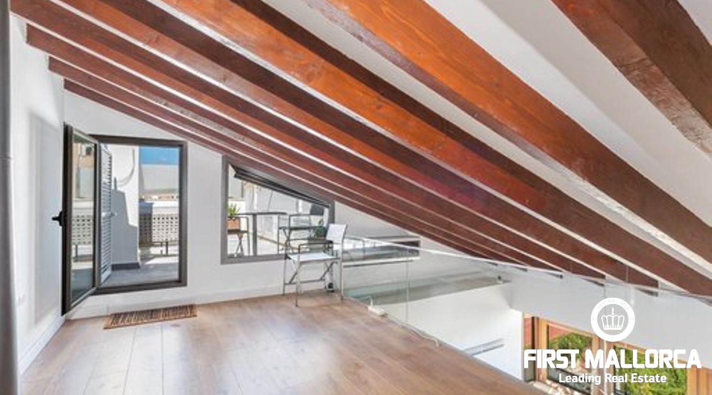 This duplex penthouse is situated in a quiet side street in one of the most popular areas of Palma Old Town, only a few steps away from the Plaza Mayor and the famous shopping street Calle Sant Miguel. The flat was completely refurbished in 2017, is located on the third floor without lift of a Mallorcan palace with the characteristic patio and is developed on two levels On the main level there is the spacious living/dining room with fireplace and the bright open plan Bulthaup kitchen. There is also the master bedroom with en suite bathroom with underfloor heating. Guest bathroom with a small shower room and a further small, bright room which can be used as a bedroom or office. A staircase leads to the upper floor consisting of a single open room with sloping ceiling from which you access the sunny private roof terrace (approx. 13 m²). The roof terrace offers a fantastic view over the rooftops of the old town. Some extra details: