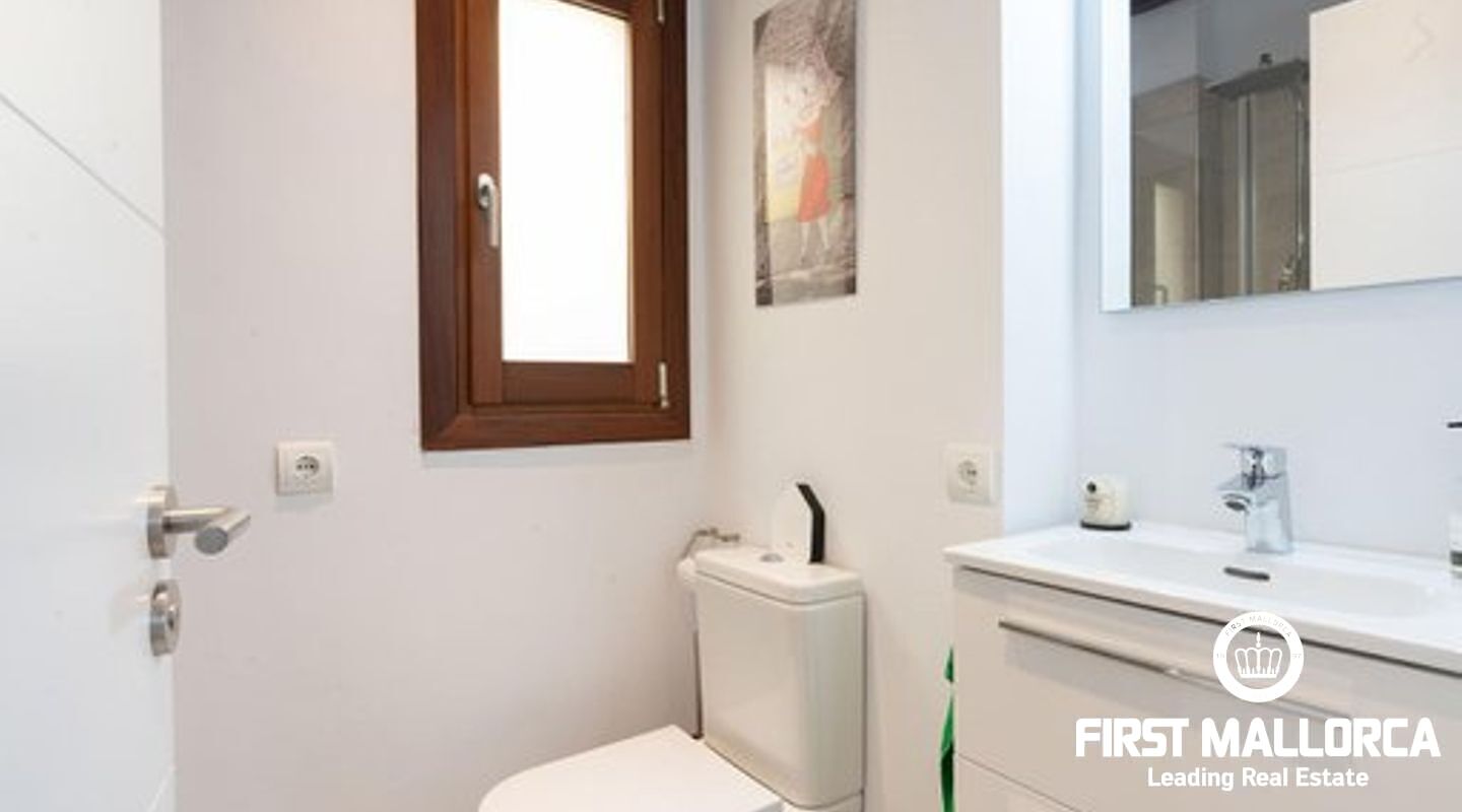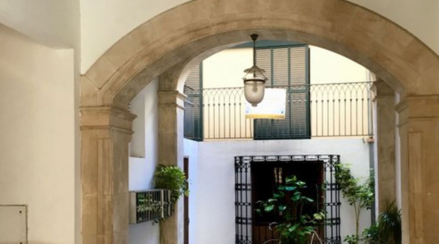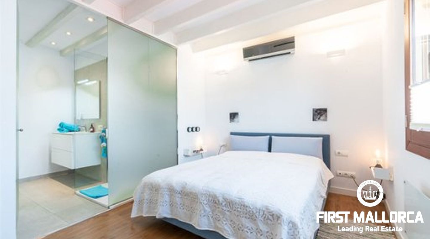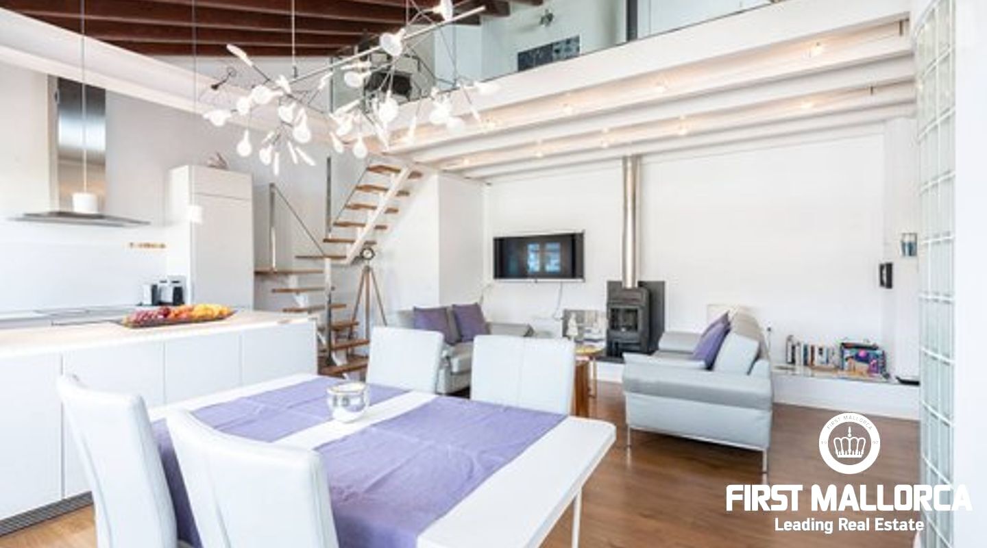 This duplex penthouse is situated in a quiet side street in one of the most popular areas of Palma Old Town, only a few steps away from the Plaza Mayor and the famous shopping street Calle Sant Miguel. The flat was completely refurbished in 2017, is located on the third floor without lift of a Mallorcan palace with the characteristic patio and is developed on two levels On the main level there is the spacious living/dining room with fireplace and the bright open plan Bulthaup kitchen. There is also the master bedroom with en suite bathroom with underfloor heating. Guest bathroom with a small shower room and a further small, bright room which can be used as a bedroom or office. A staircase leads to the upper floor consisting of a single open room with sloping ceiling from which you access the sunny private roof terrace (approx. 13 m²). The roof terrace offers a fantastic view over the rooftops of the old town. Some extra details: