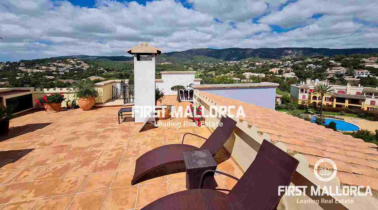 The property is on 2 levels with generous rooms, quality finishes, covered terraces and a lovely homely ambience with a bright kitchen enjoying sunshine and a view to the sea. The entrance level has an open plan living and dining room with a fireplace with doors onto the covered terrace with superb views of the neighbouring hills and access via a spiral staircase to the spacious roof terrace with a brick built barbecue and several relaxing corners to enjoy throughout the entire year. In addition there is a double bedroom and a bathroom ensuite. Stairs lead to the lower level with 3 bedroom suites and the master has its own covered terrace of approximately 32m2.