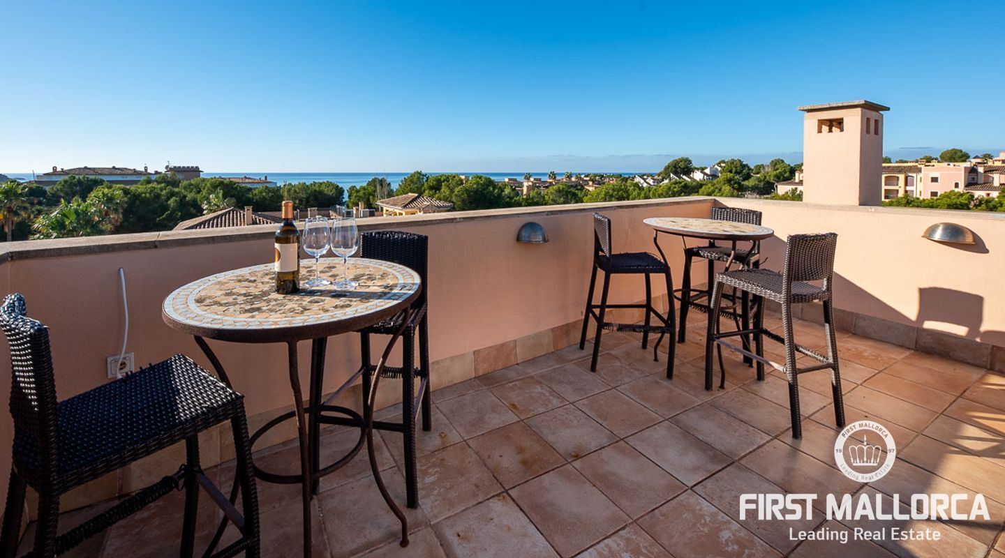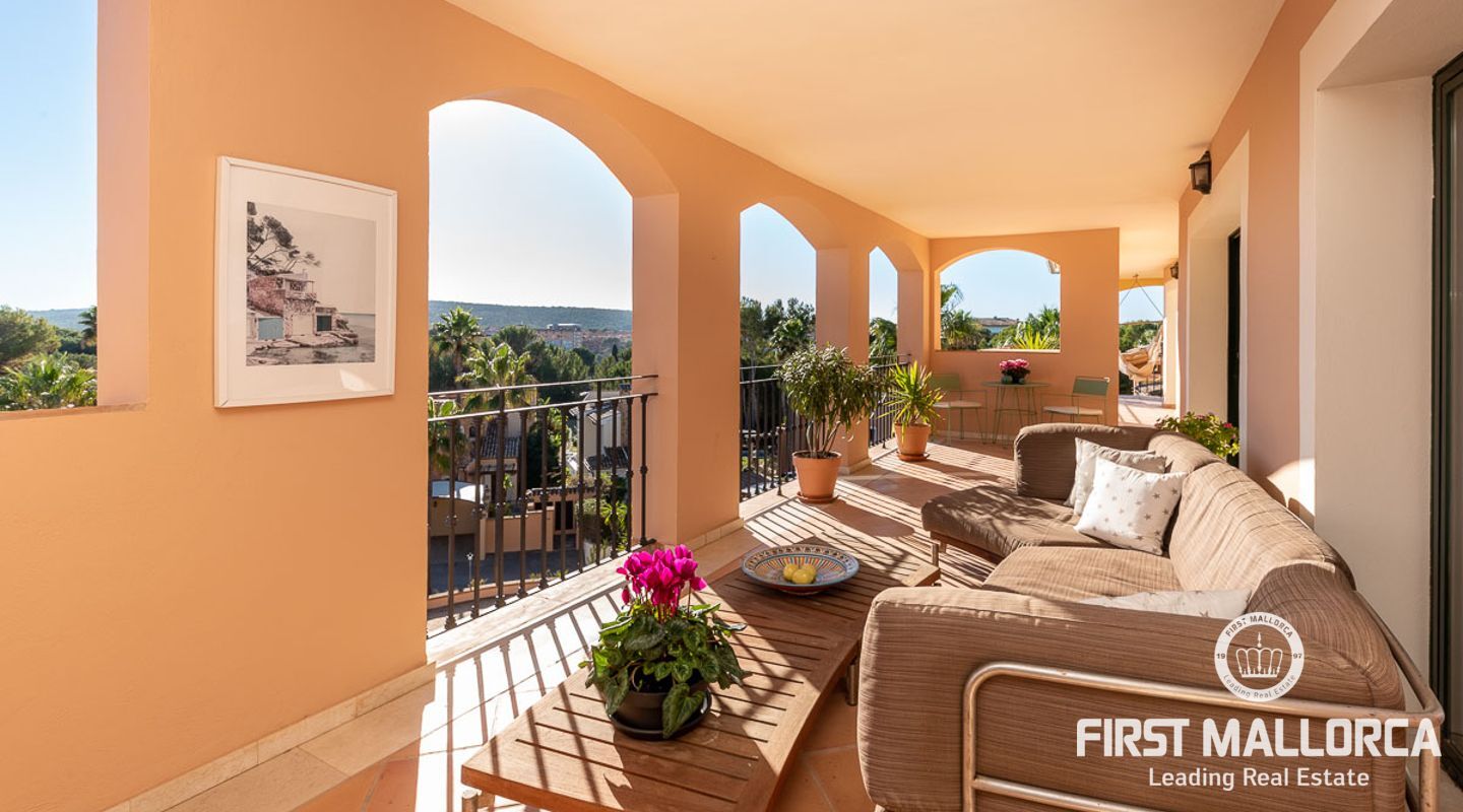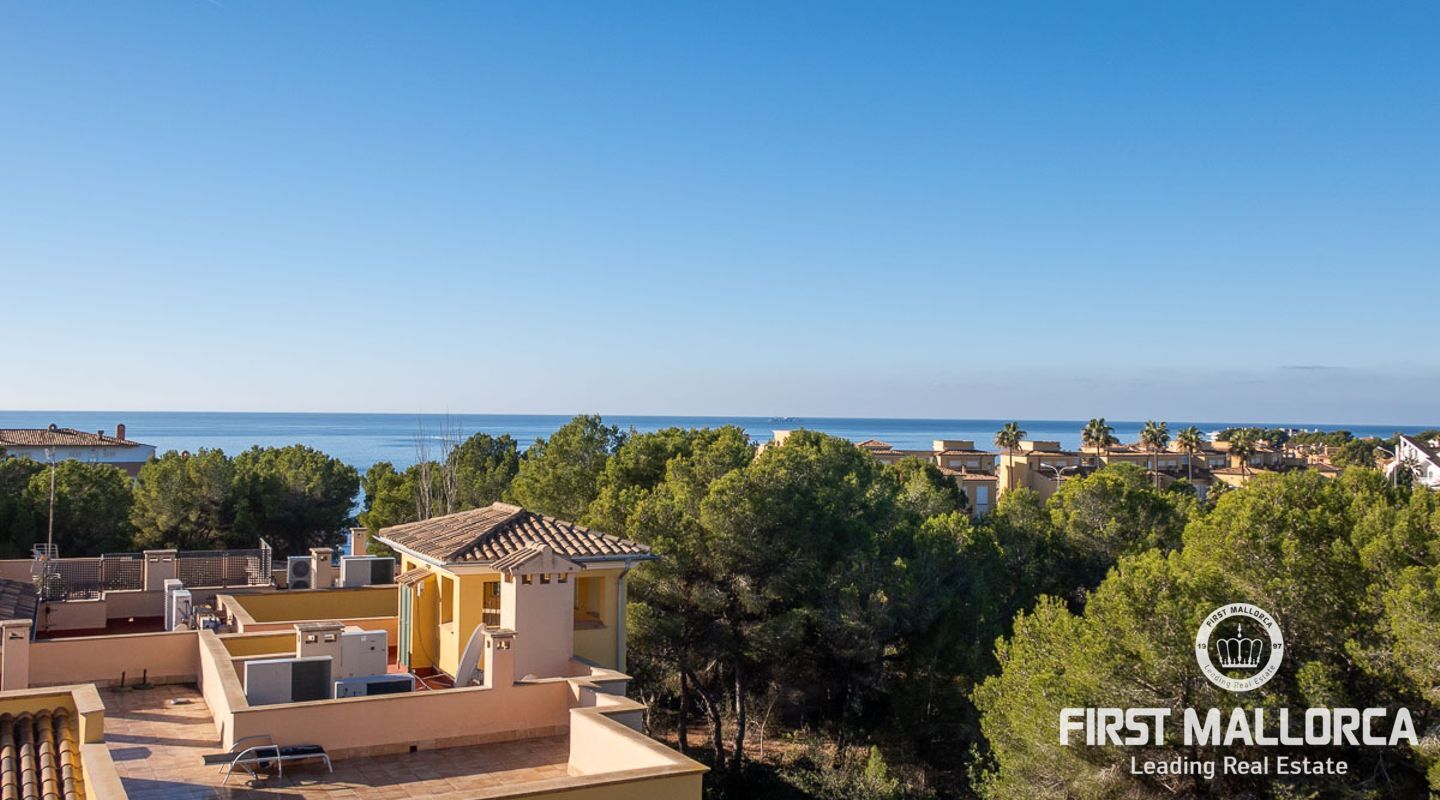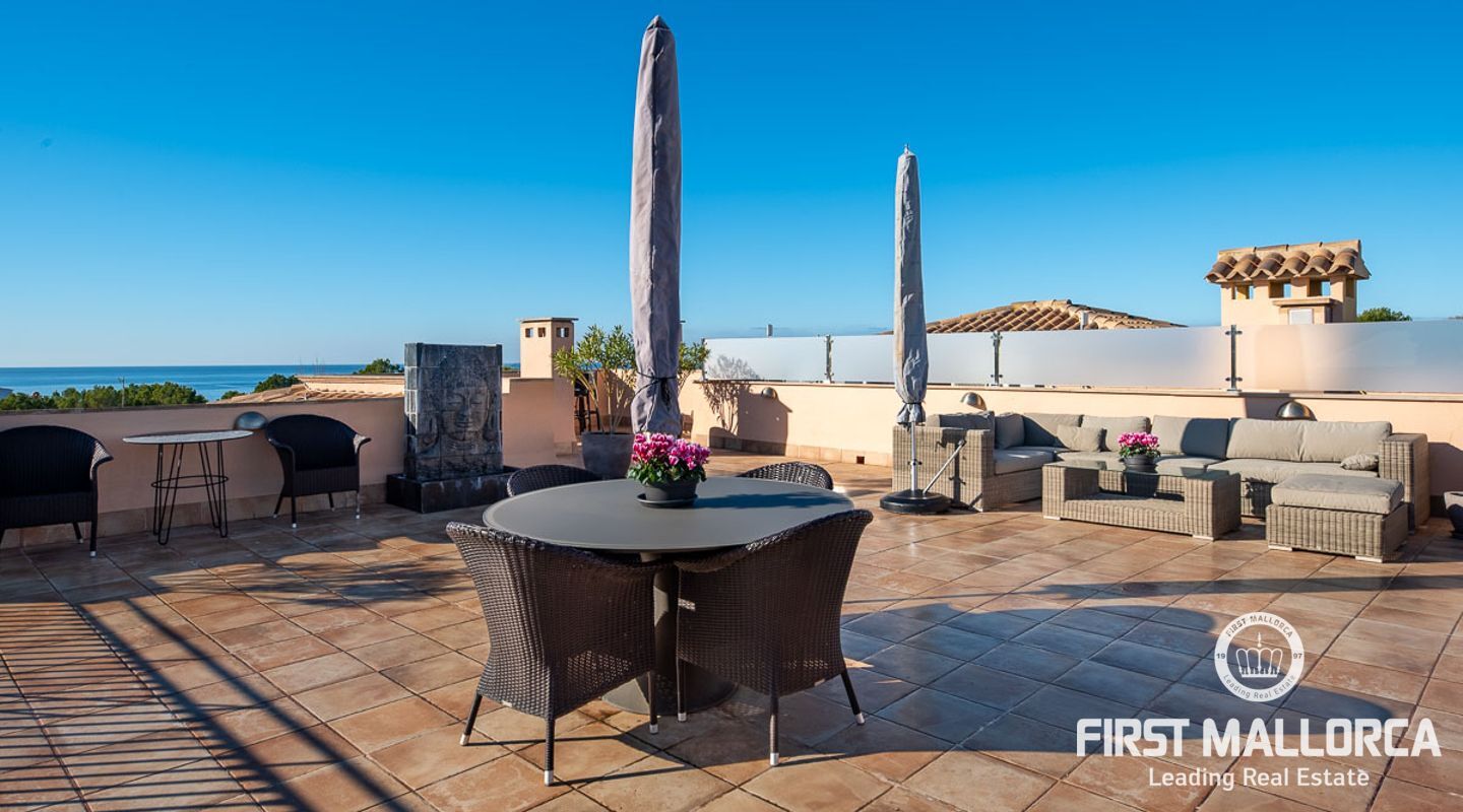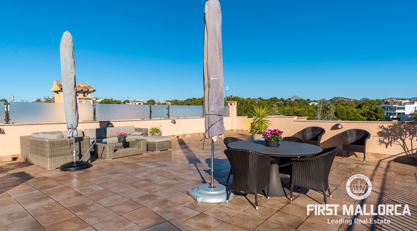 This 4 bedroom penthouse within walking distance of Port Adriano harbour truly deserves to be called "unique", properties of this type are few and far between and rarely, if ever, come on the market. With approx. 240 m² living space, 4 bedrooms and 4 bathrooms, 3 of them ensuite, it offers the comfort of a villa, but is much easier to maintain. From the underground car park, the lift takes you directly to the flat, which occupies the entire top floor in the building. The property radiates an overwhelming elegance and exclusivity as soon as you enter, with high ceilings and lots of light. The room concept is open plan, including a luxury fitted kitchen with breakfast bar, a large dining area and the living room. From everywhere you can enjoy the view towards the golf course and over the charming residence with the beautiful swimming pool area. Numerous open and covered terraces provide ample space for relaxing or dining with family and friends. Very sun-seekers walk up a comfortable stone staircase to the approx. 300 m² roof terrace, which offers 360 degree views of the sea, mountains, golf courses and surrounding area. The equipment of this fantastic penthouse includes: Air conditioning hot/cold, aluminium windows with double glazing, marble floors, utility room, 2 underground parking spaces, 2 storage rooms. Please do not hesitate to contact our friendly team at Port Adriano for a viewing.
