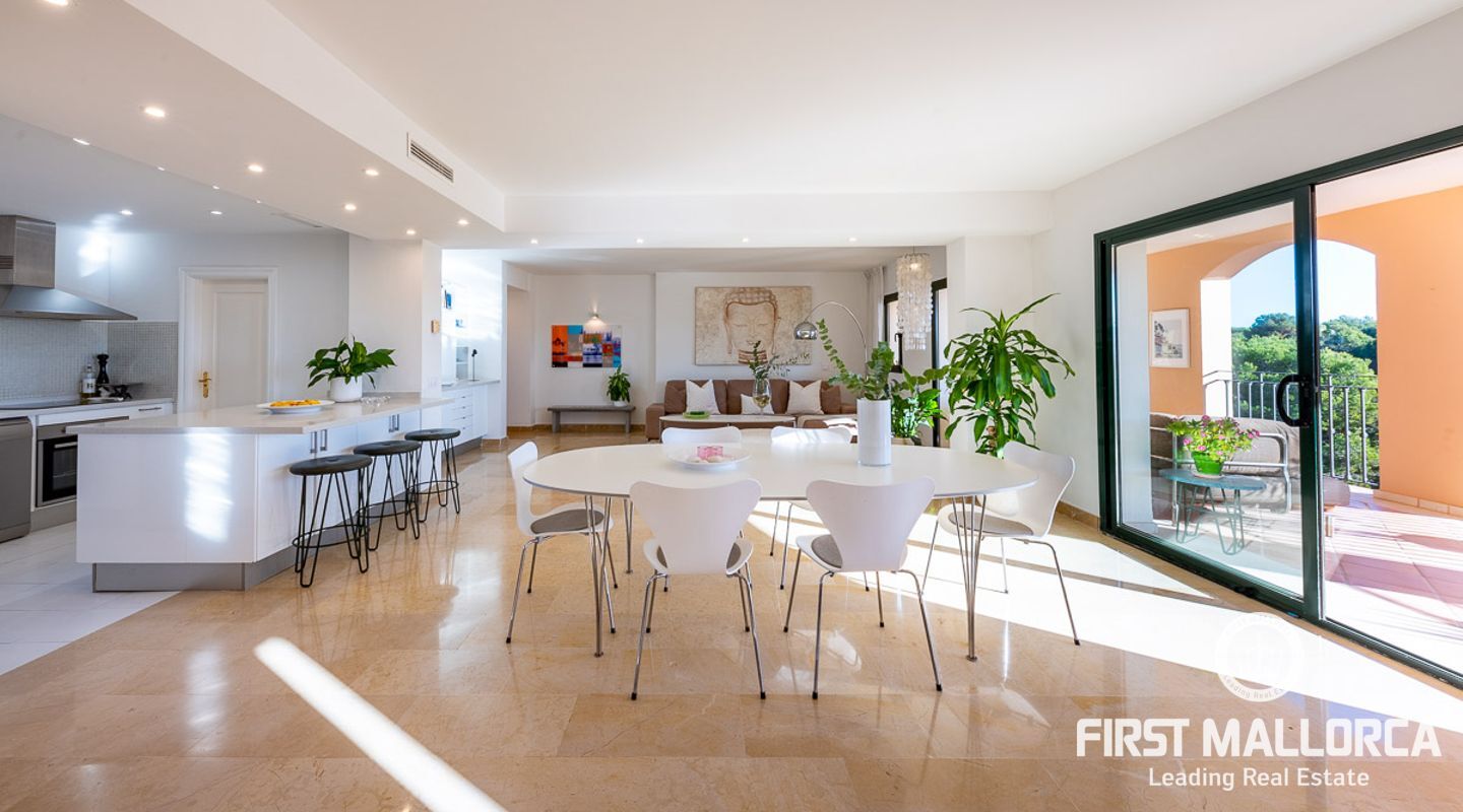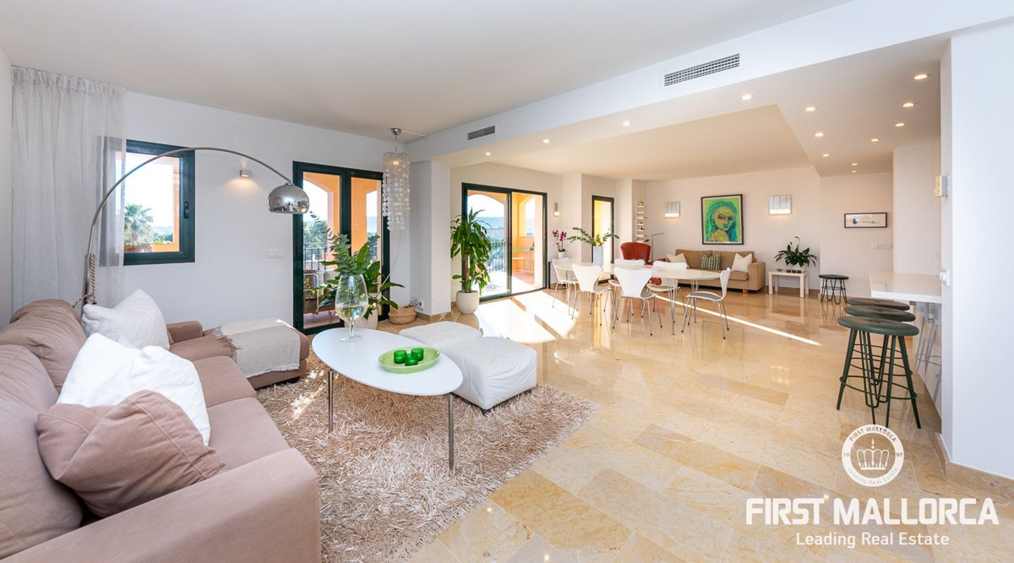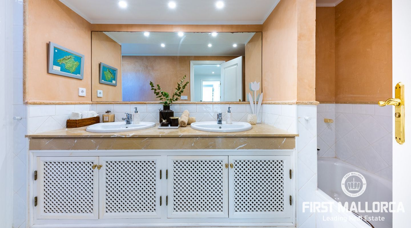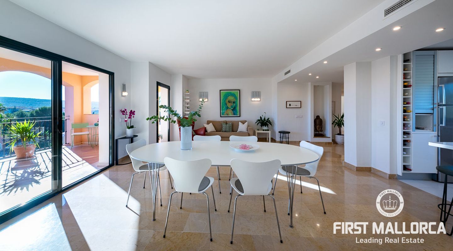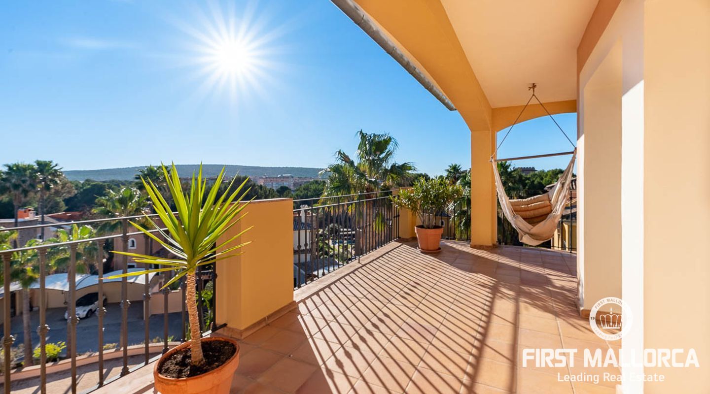 This 4 bedroom penthouse within walking distance of Port Adriano harbour truly deserves to be called "unique", properties of this type are few and far between and rarely, if ever, come on the market. With approx. 240 m² living space, 4 bedrooms and 4 bathrooms, 3 of them ensuite, it offers the comfort of a villa, but is much easier to maintain. From the underground car park, the lift takes you directly to the flat, which occupies the entire top floor in the building. The property radiates an overwhelming elegance and exclusivity as soon as you enter, with high ceilings and lots of light. The room concept is open plan, including a luxury fitted kitchen with breakfast bar, a large dining area and the living room. From everywhere you can enjoy the view towards the golf course and over the charming residence with the beautiful swimming pool area. Numerous open and covered terraces provide ample space for relaxing or dining with family and friends. Very sun-seekers walk up a comfortable stone staircase to the approx. 300 m² roof terrace, which offers 360 degree views of the sea, mountains, golf courses and surrounding area. The equipment of this fantastic penthouse includes: Air conditioning hot/cold, aluminium windows with double glazing, marble floors, utility room, 2 underground parking spaces, 2 storage rooms. Please do not hesitate to contact our friendly team at Port Adriano for a viewing.