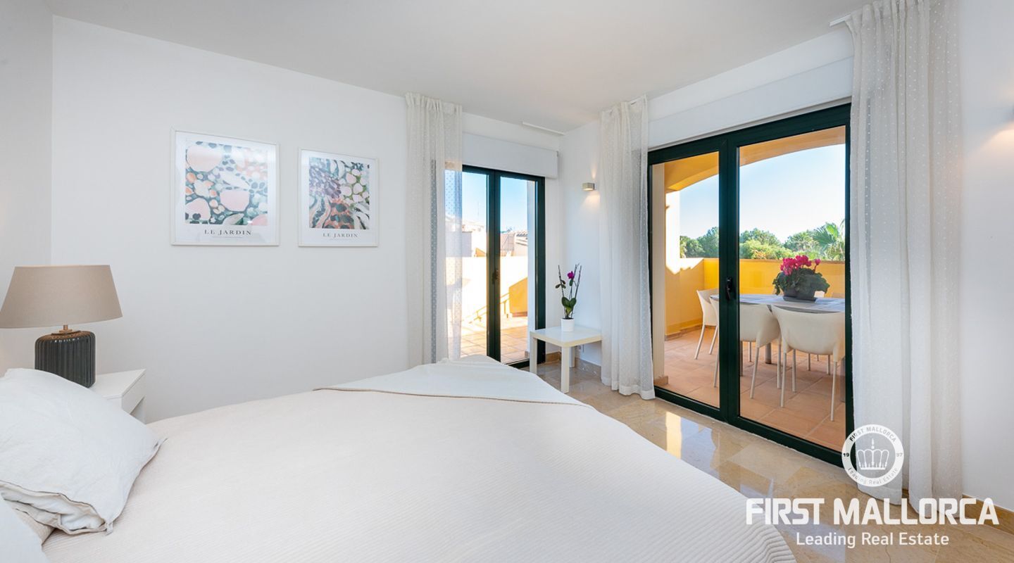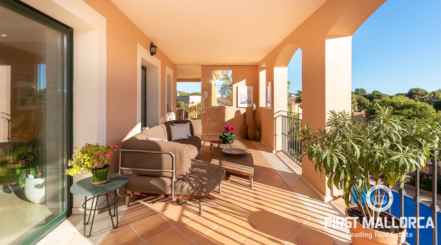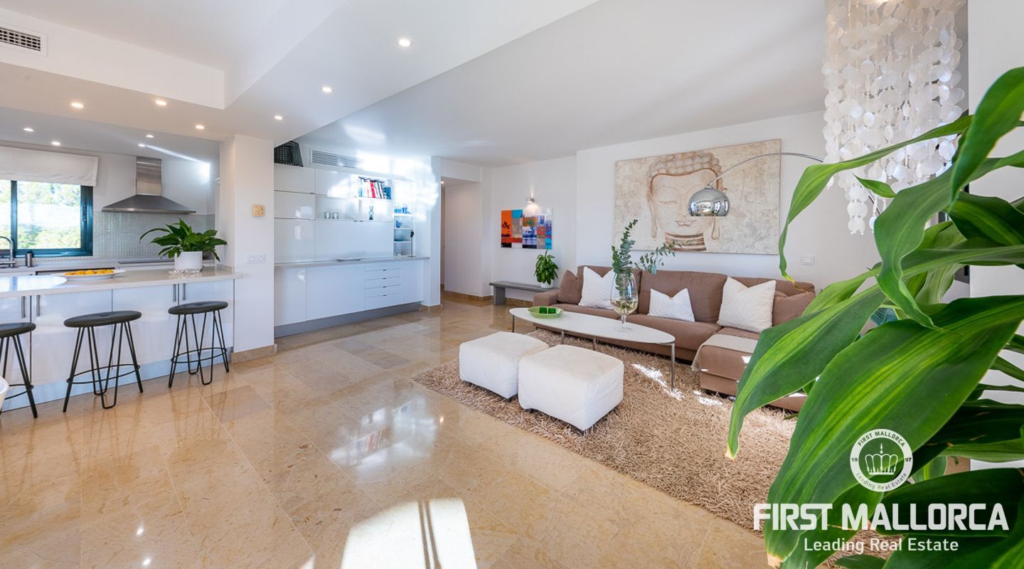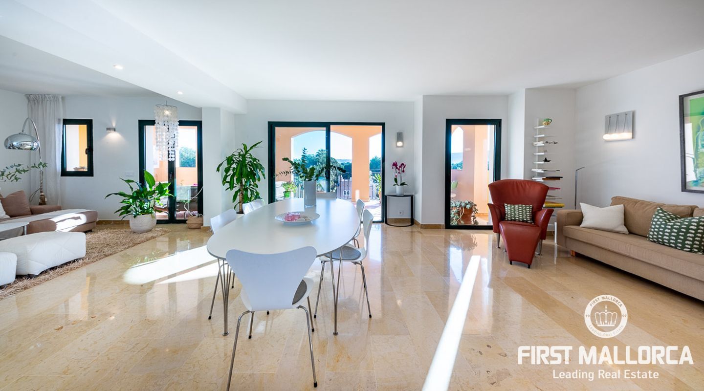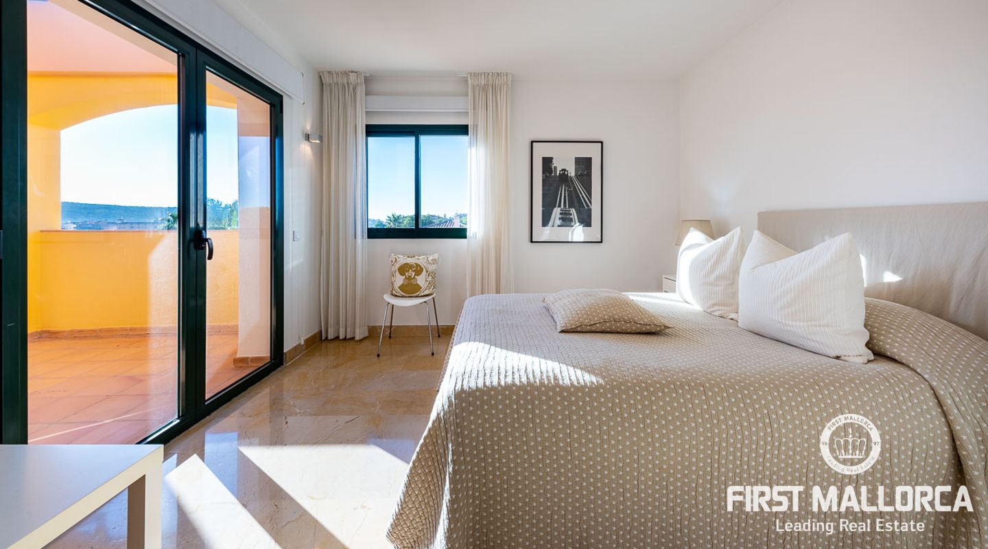 This 4 bedroom penthouse within walking distance of Port Adriano harbour truly deserves to be called "unique", properties of this type are few and far between and rarely, if ever, come on the market. With approx. 240 m² living space, 4 bedrooms and 4 bathrooms, 3 of them ensuite, it offers the comfort of a villa, but is much easier to maintain. From the underground car park, the lift takes you directly to the flat, which occupies the entire top floor in the building. The property radiates an overwhelming elegance and exclusivity as soon as you enter, with high ceilings and lots of light. The room concept is open plan, including a luxury fitted kitchen with breakfast bar, a large dining area and the living room. From everywhere you can enjoy the view towards the golf course and over the charming residence with the beautiful swimming pool area. Numerous open and covered terraces provide ample space for relaxing or dining with family and friends. Very sun-seekers walk up a comfortable stone staircase to the approx. 300 m² roof terrace, which offers 360 degree views of the sea, mountains, golf courses and surrounding area. The equipment of this fantastic penthouse includes: Air conditioning hot/cold, aluminium windows with double glazing, marble floors, utility room, 2 underground parking spaces, 2 storage rooms. Please do not hesitate to contact our friendly team at Port Adriano for a viewing.