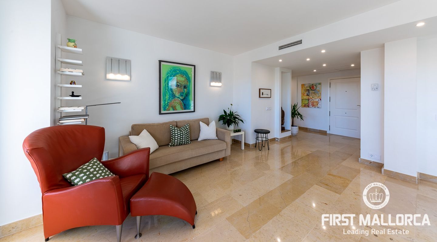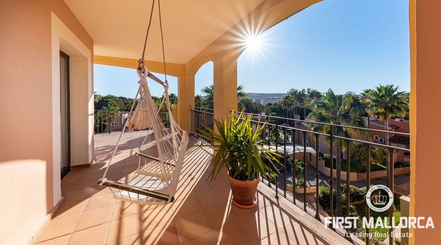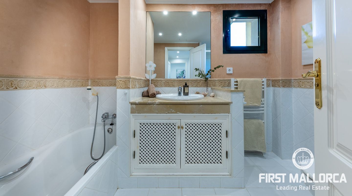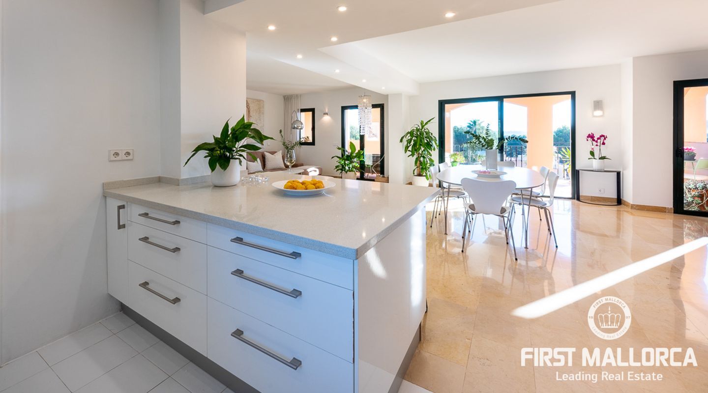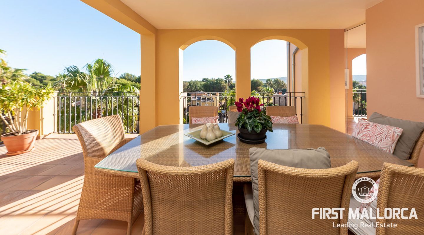 This 4 bedroom penthouse within walking distance of Port Adriano harbour truly deserves to be called "unique", properties of this type are few and far between and rarely, if ever, come on the market. With approx. 240 m² living space, 4 bedrooms and 4 bathrooms, 3 of them ensuite, it offers the comfort of a villa, but is much easier to maintain. From the underground car park, the lift takes you directly to the flat, which occupies the entire top floor in the building. The property radiates an overwhelming elegance and exclusivity as soon as you enter, with high ceilings and lots of light. The room concept is open plan, including a luxury fitted kitchen with breakfast bar, a large dining area and the living room. From everywhere you can enjoy the view towards the golf course and over the charming residence with the beautiful swimming pool area. Numerous open and covered terraces provide ample space for relaxing or dining with family and friends. Very sun-seekers walk up a comfortable stone staircase to the approx. 300 m² roof terrace, which offers 360 degree views of the sea, mountains, golf courses and surrounding area. The equipment of this fantastic penthouse includes: Air conditioning hot/cold, aluminium windows with double glazing, marble floors, utility room, 2 underground parking spaces, 2 storage rooms. Please do not hesitate to contact our friendly team at Port Adriano for a viewing.