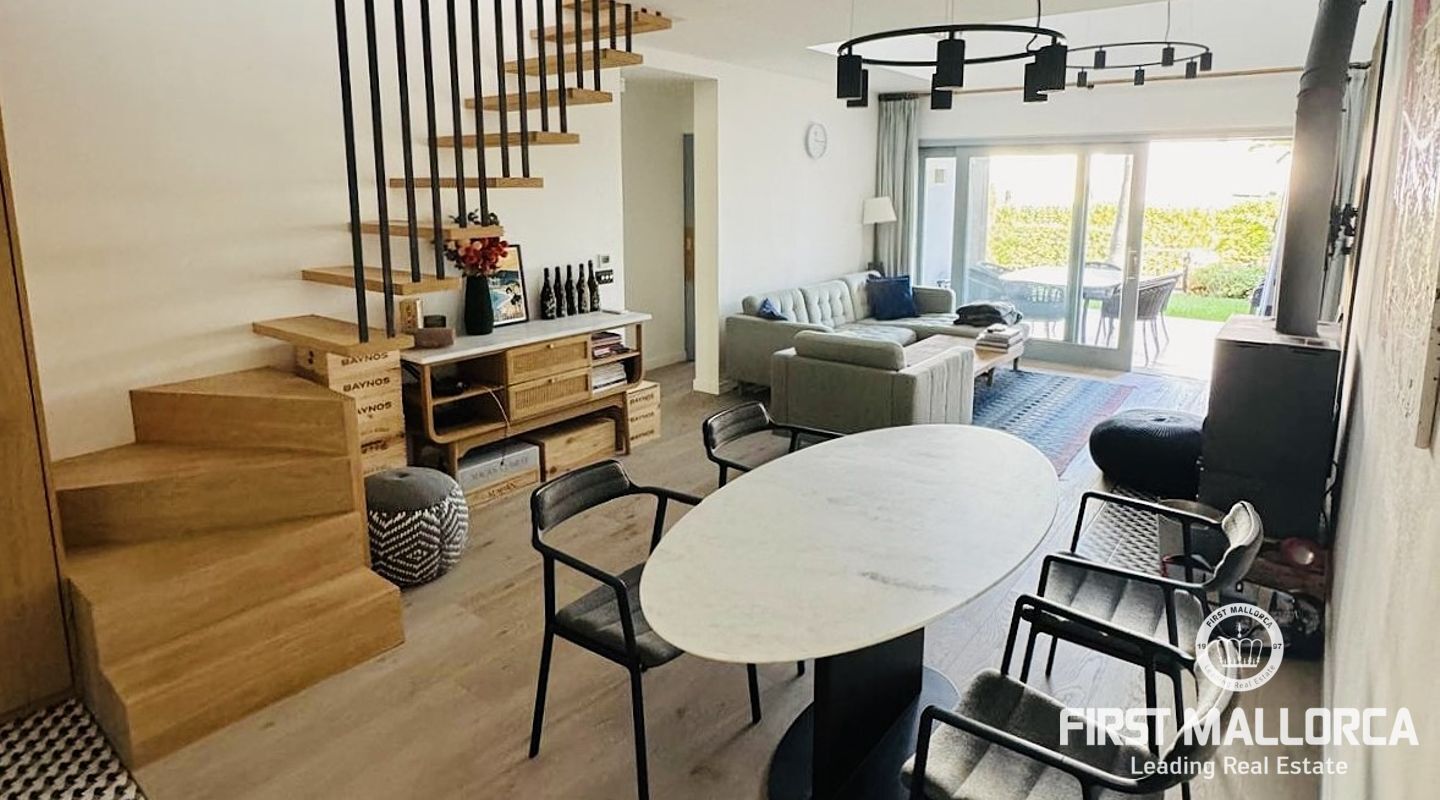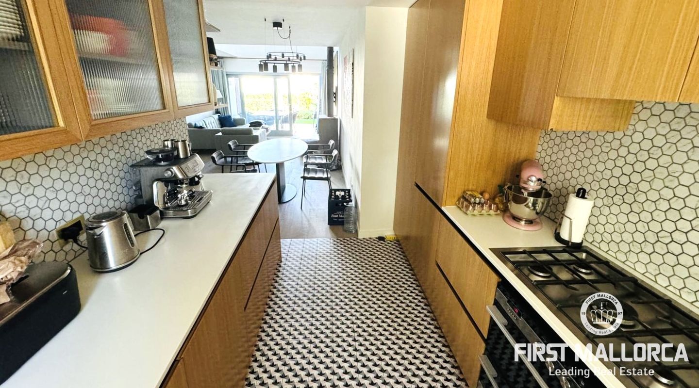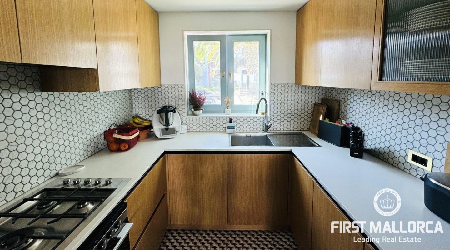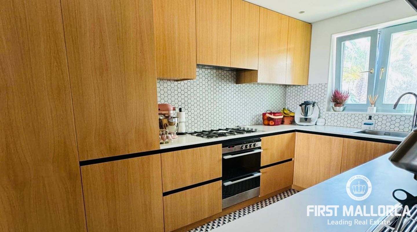 On the first floor you will find a spacious living-dining room with direct access to one of the two private terraces, perfect for outdoor dining or relaxing in the sun. The fully equipped kitchen has a functional and elegant design.