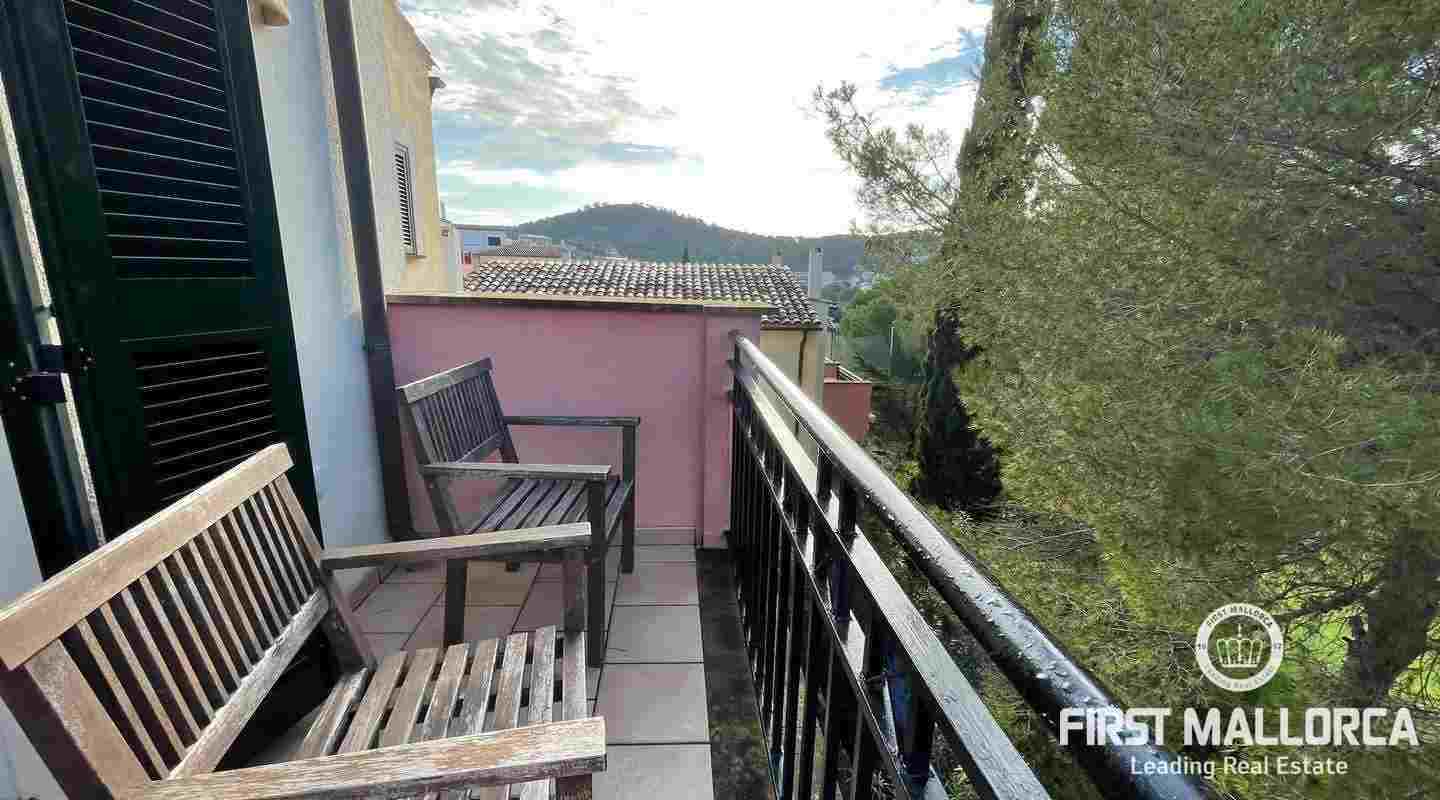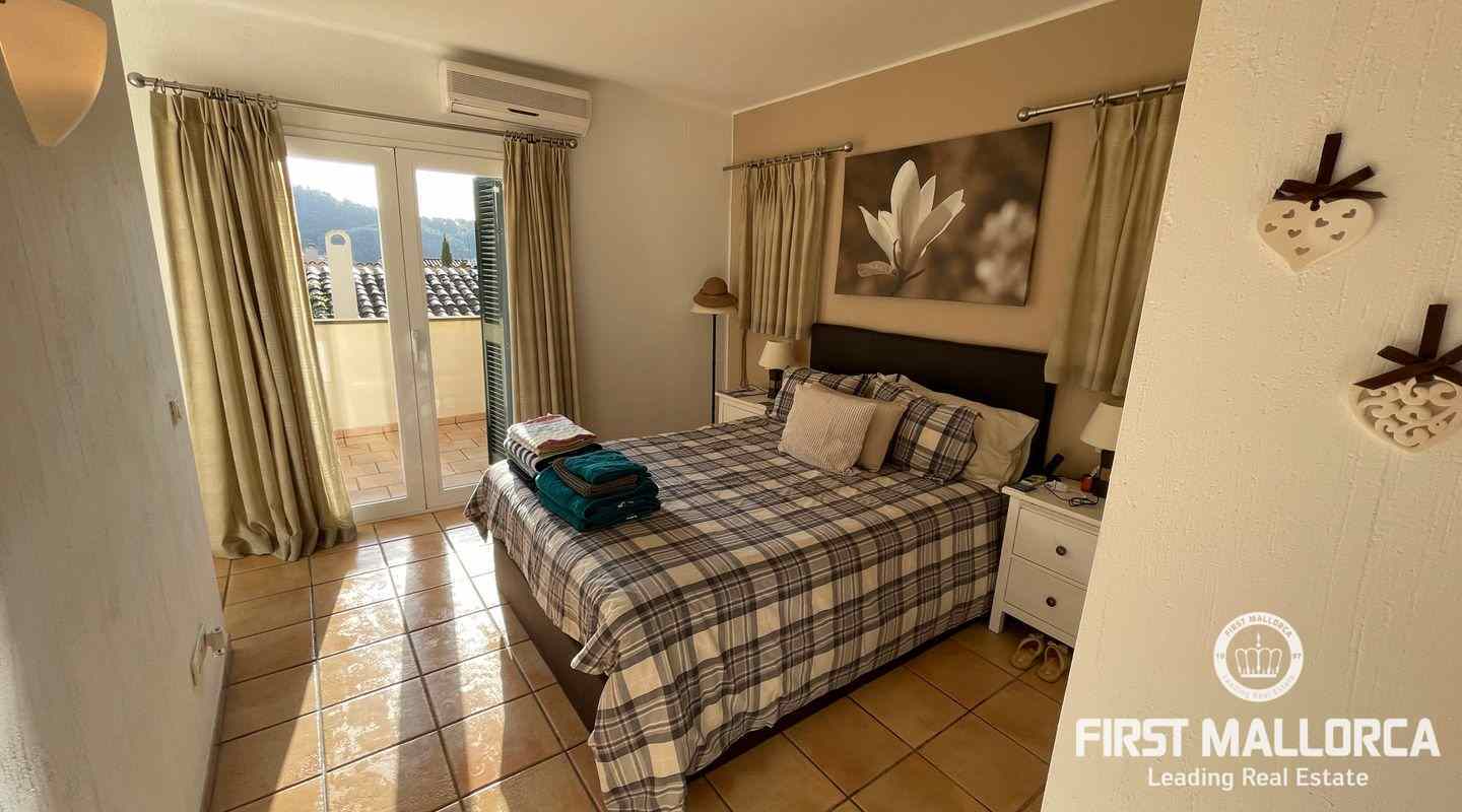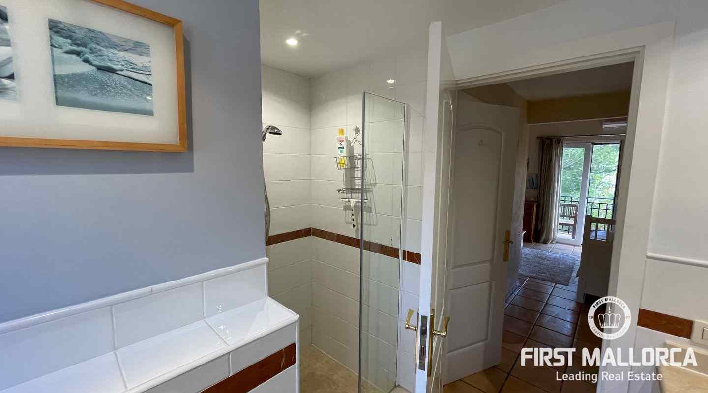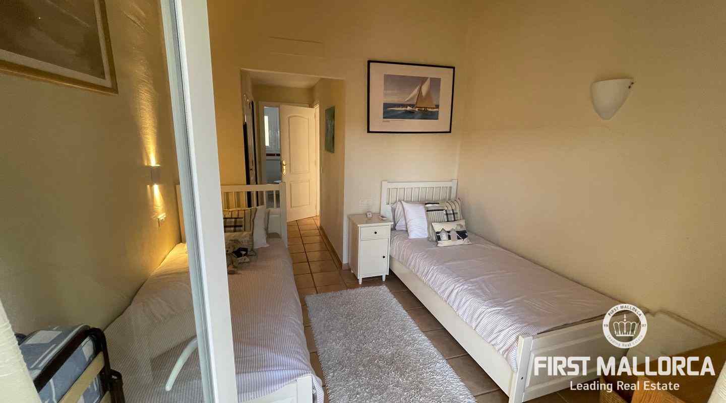Very well kept beautiful and sunny 2 bedroom house just a few minutes walk to the blue azure mediterranean sea and golden sandy beach at Camp de Mar! This terraced house is located in a gated community with 3 community swimming pools. On the ground floor you have a guest toilet, kitchen, open plan lounge/dining room with fireplace which leads out to the spacious live out terrace area. There is also a large storage room on this level. On the second floor there are 2 spacious bedrooms with high ceilings with beams both of which have an ensuite bathroom and private terrace space! Further features of this property include: airconditioning hot/cold, underfloor heating, alarm system, aluminium shutters, double glazed windows and allocated exterior parking space. Camp de Mar has a good selection of restaurants, cafés and shops and is just a short drive to both Puerto de Andratx, Paguera and Cala Fornells.