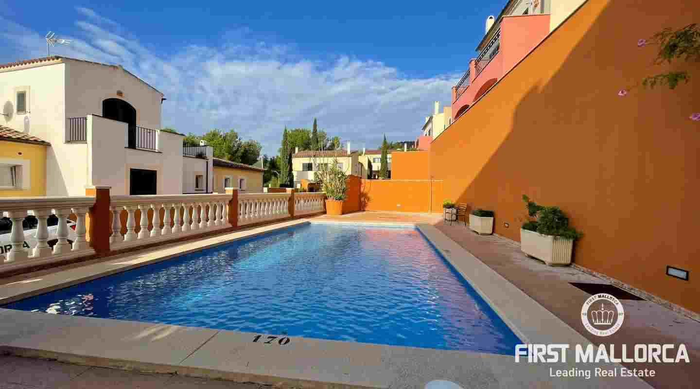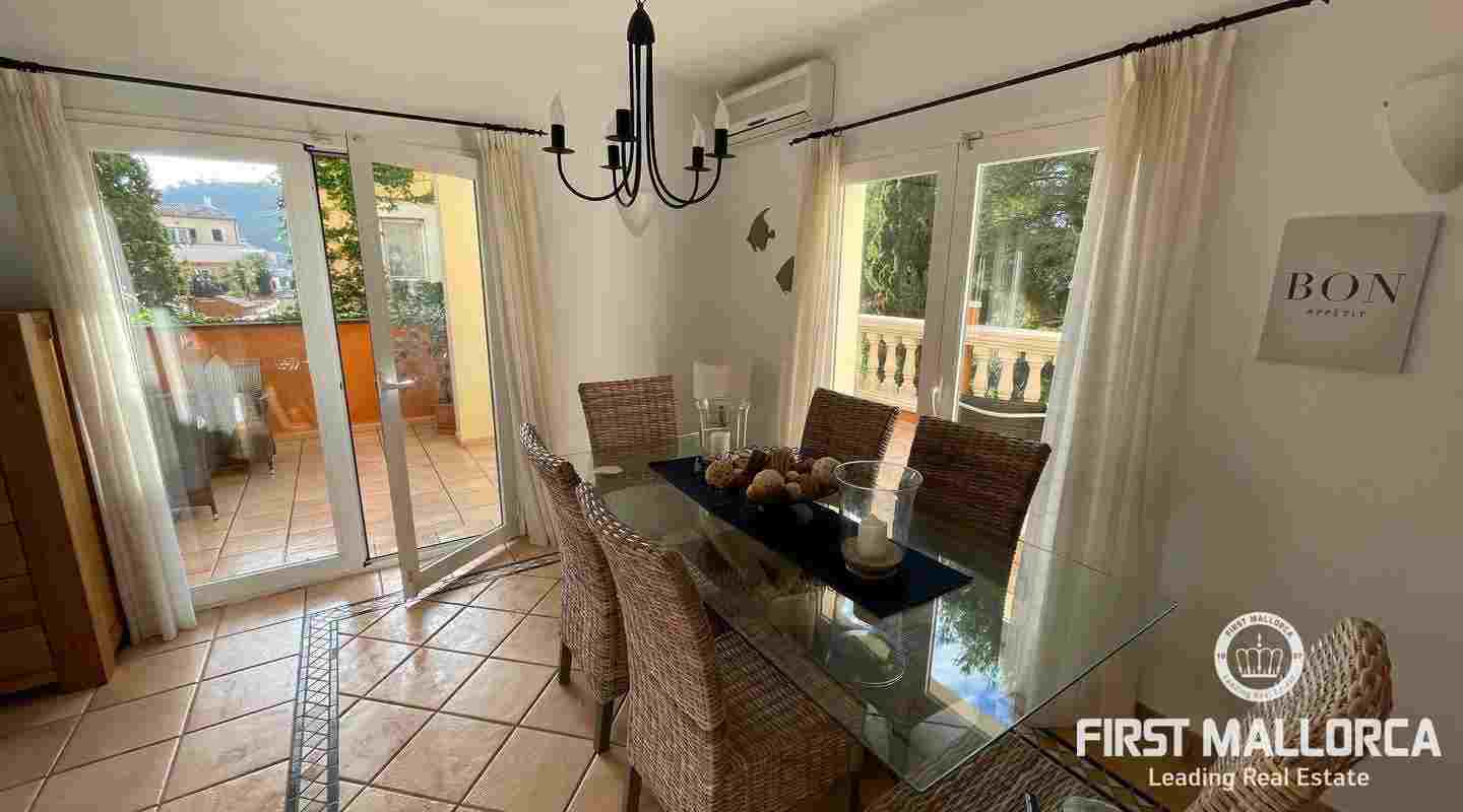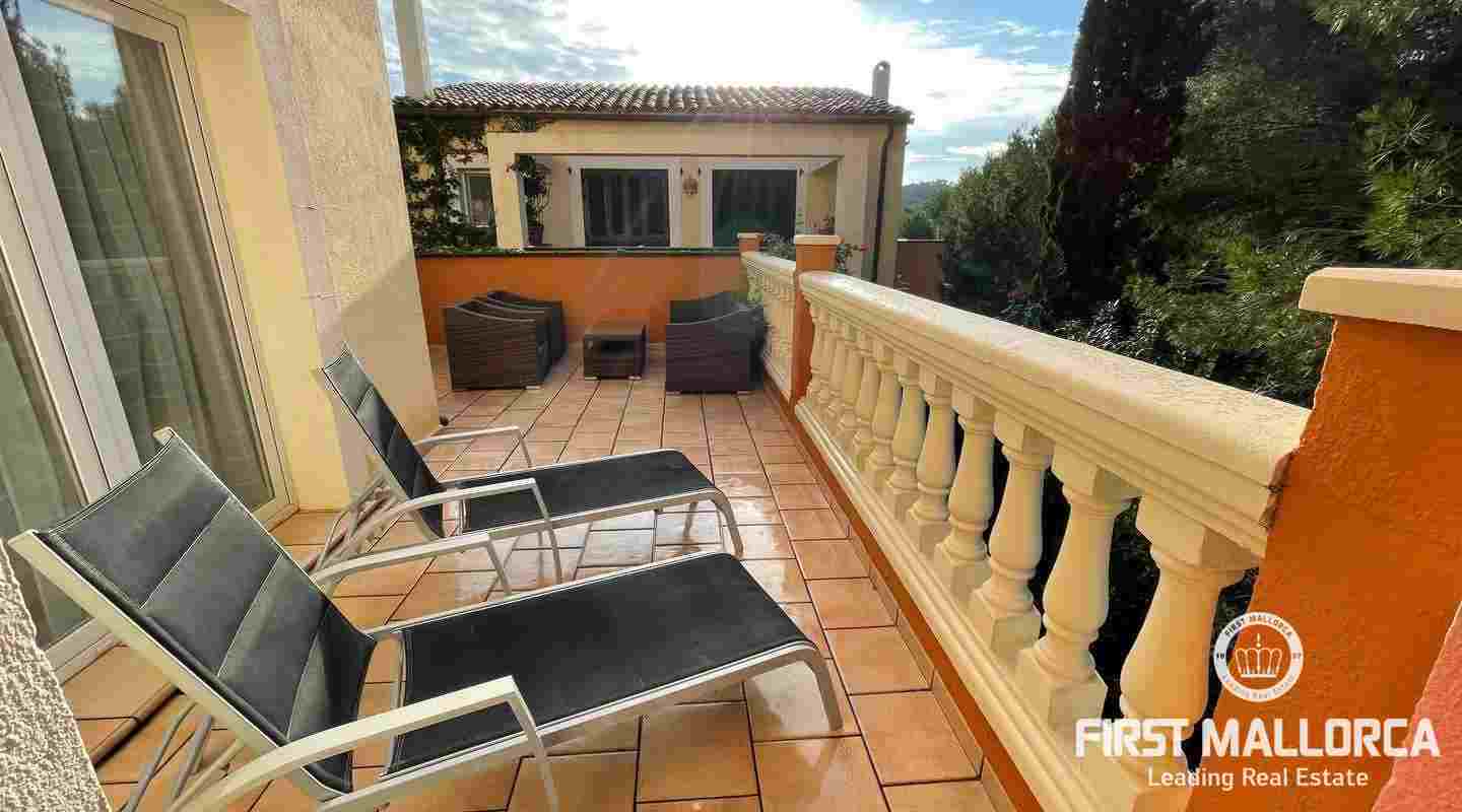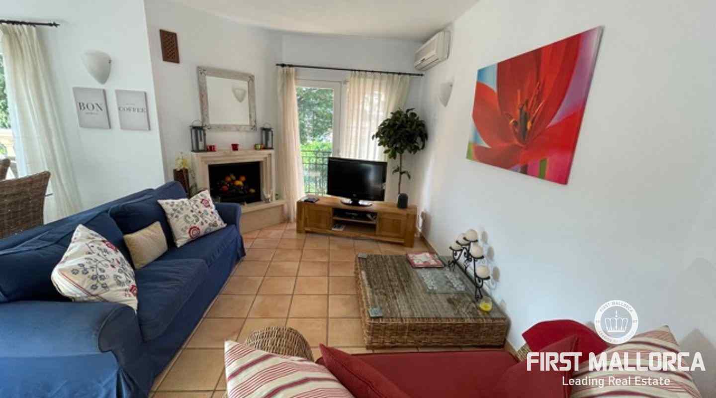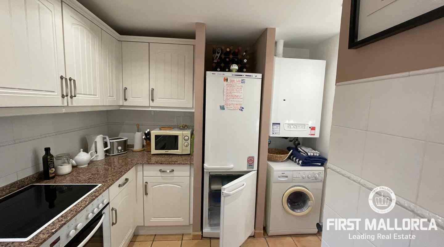 Very well kept beautiful and sunny 2 bedroom house just a few minutes walk to the blue azure mediterranean sea and golden sandy beach at Camp de Mar! This terraced house is located in a gated community with 3 community swimming pools. On the ground floor you have a guest toilet, kitchen, open plan lounge/dining room with fireplace which leads out to the spacious live out terrace area. There is also a large storage room on this level. On the second floor there are 2 spacious bedrooms with high ceilings with beams both of which have an ensuite bathroom and private terrace space! Further features of this property include: airconditioning hot/cold, underfloor heating, alarm system, aluminium shutters, double glazed windows and allocated exterior parking space. Camp de Mar has a good selection of restaurants, cafés and shops and is just a short drive to both Puerto de Andratx, Paguera and Cala Fornells.