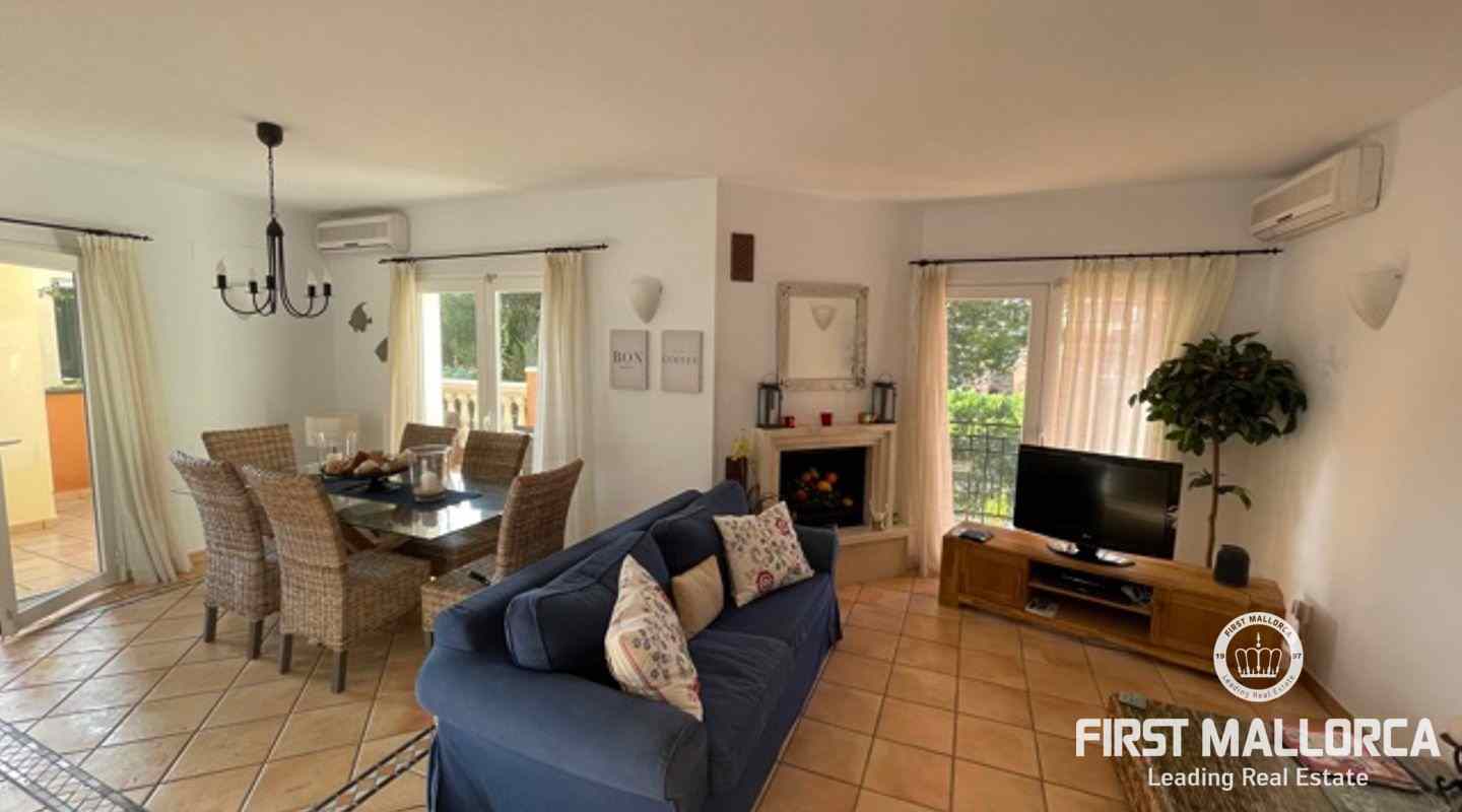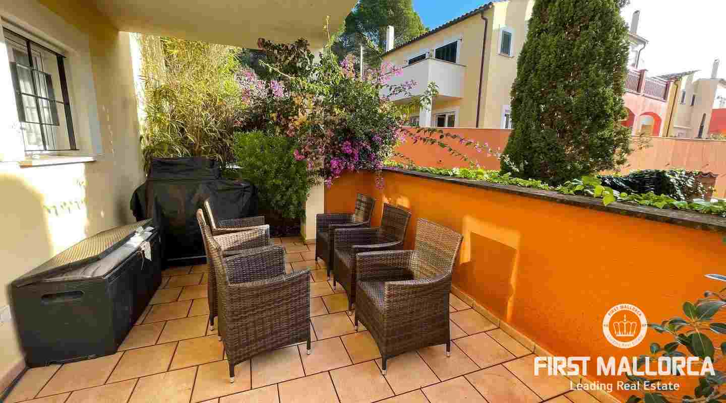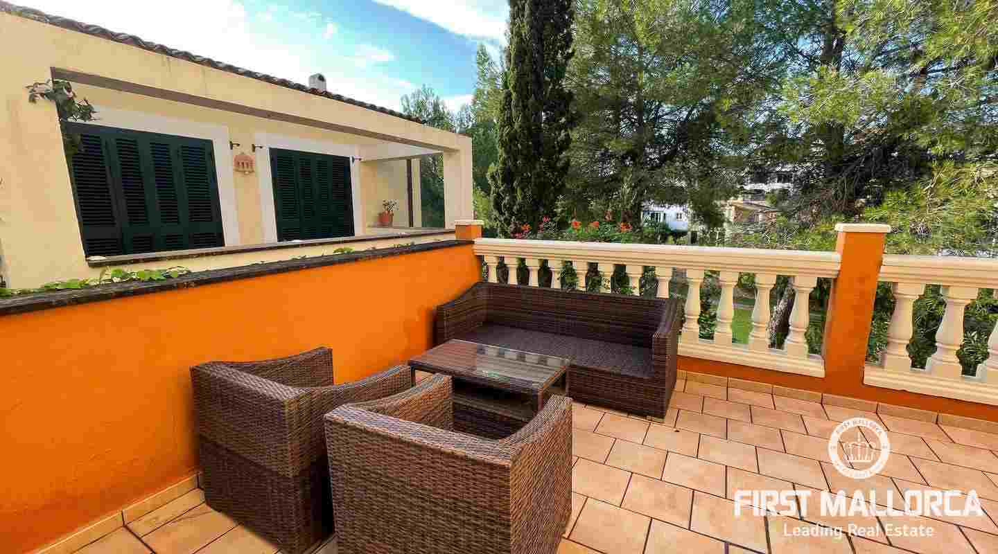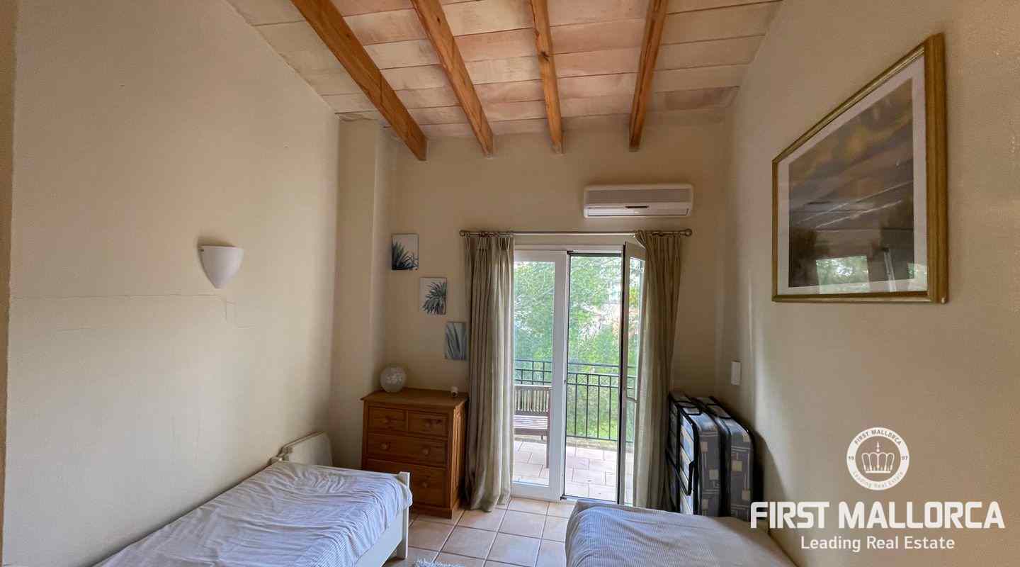 Very well kept beautiful and sunny 2 bedroom house just a few minutes walk to the blue azure mediterranean sea and golden sandy beach at Camp de Mar! This terraced house is located in a gated community with 3 community swimming pools. On the ground floor you have a guest toilet, kitchen, open plan lounge/dining room with fireplace which leads out to the spacious live out terrace area. There is also a large storage room on this level. On the second floor there are 2 spacious bedrooms with high ceilings with beams both of which have an ensuite bathroom and private terrace space! Further features of this property include: airconditioning hot/cold, underfloor heating, alarm system, aluminium shutters, double glazed windows and allocated exterior parking space. Camp de Mar has a good selection of restaurants, cafés and shops and is just a short drive to both Puerto de Andratx, Paguera and Cala Fornells.