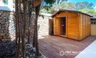 The southwest orientation ensures plenty of natural light throughout the day. The home is arranged over two floors plus a basement level, which includes underground parking and storage space. On the main floor, a bright open-concept living and dining area connects seamlessly with a modern fitted kitchen. High-quality natural stone flooring and direct access to the outdoor areas enhance the sense of space and flow. Outside, a private patio with seating and a separate sauna house, along with a landscaped garden and private pool, create an inviting retreat. A covered terrace with a fully equipped outdoor kitchen and underfloor heating allows for year-round use.