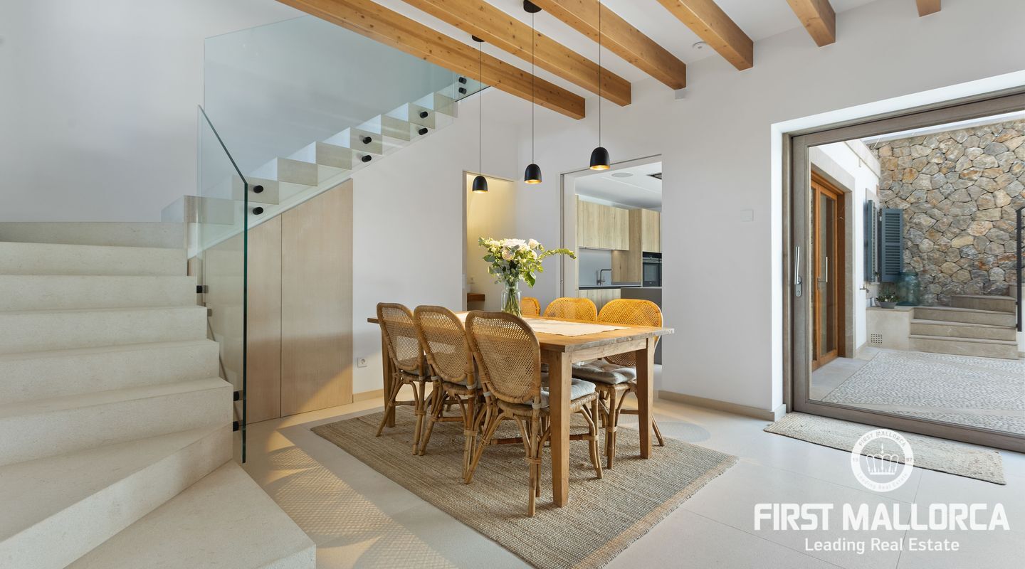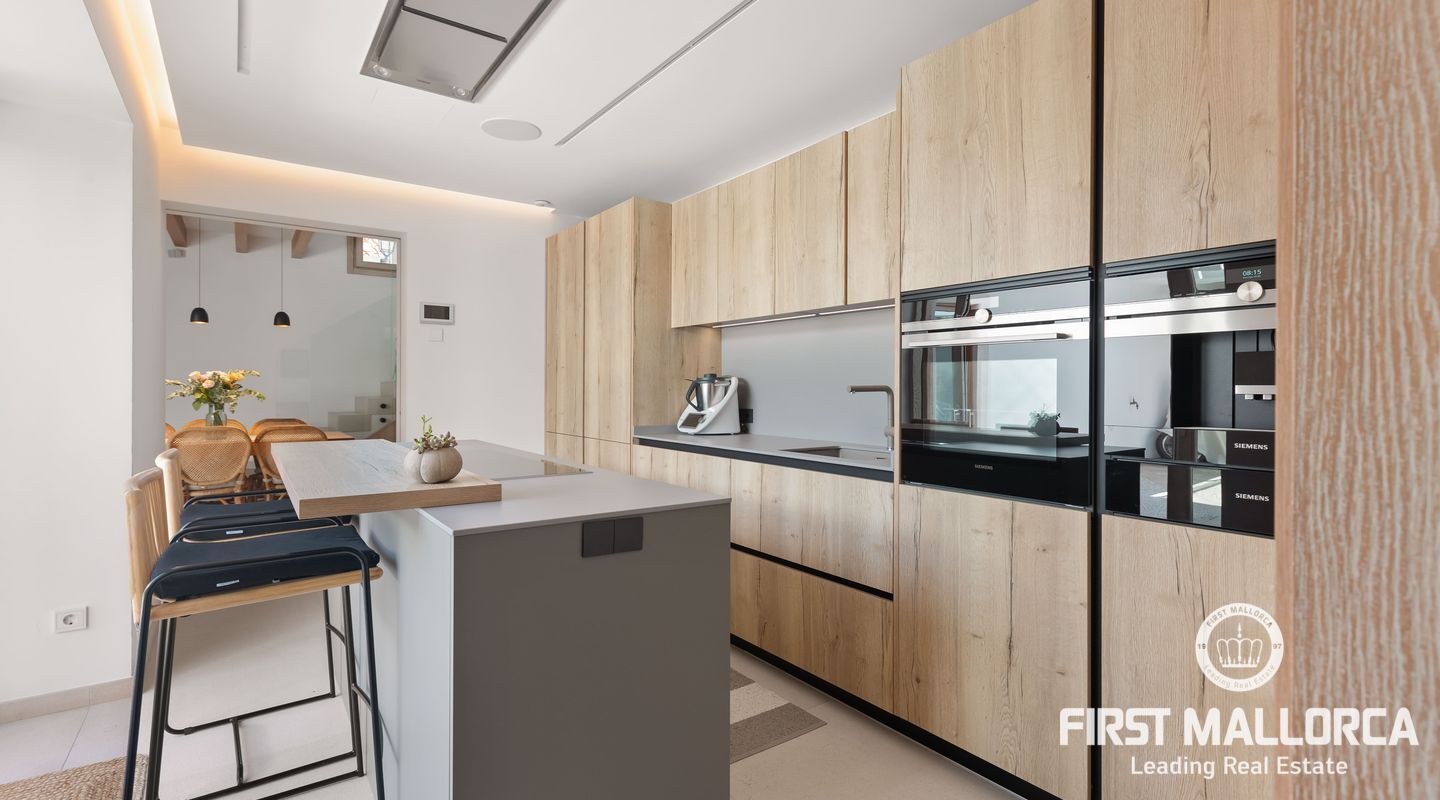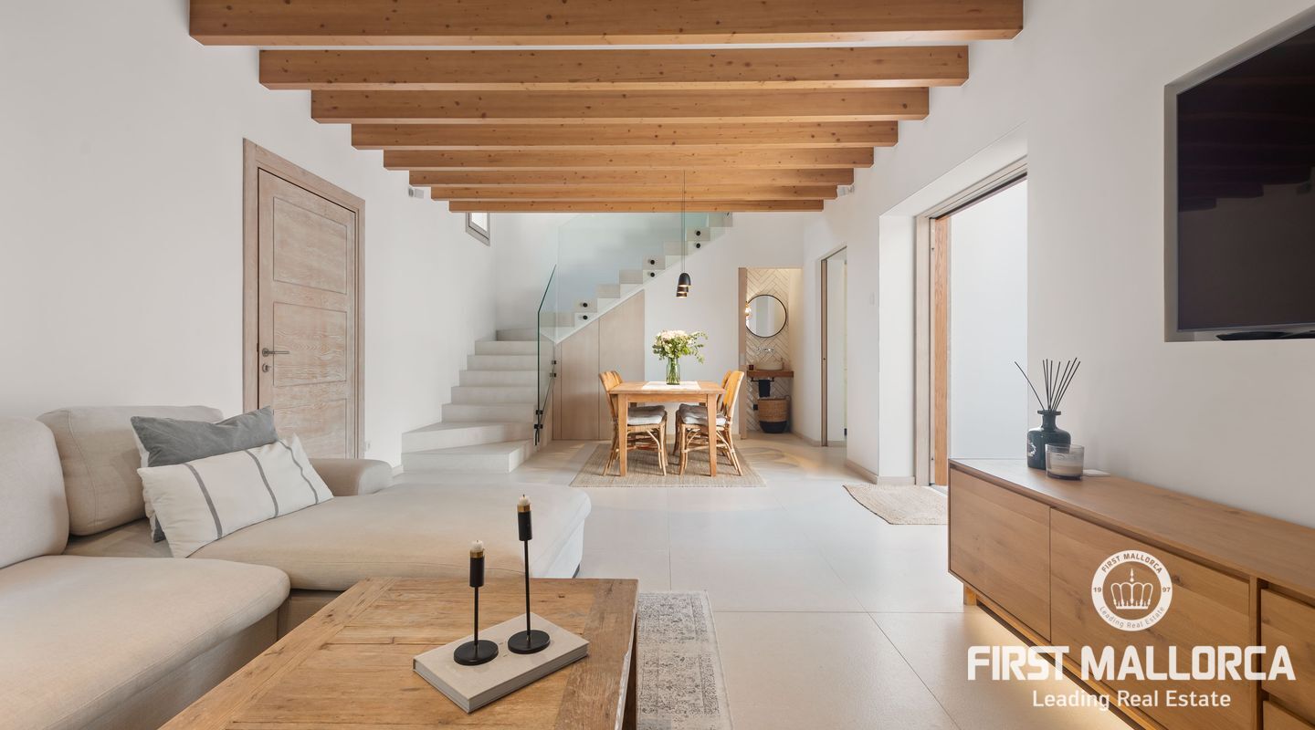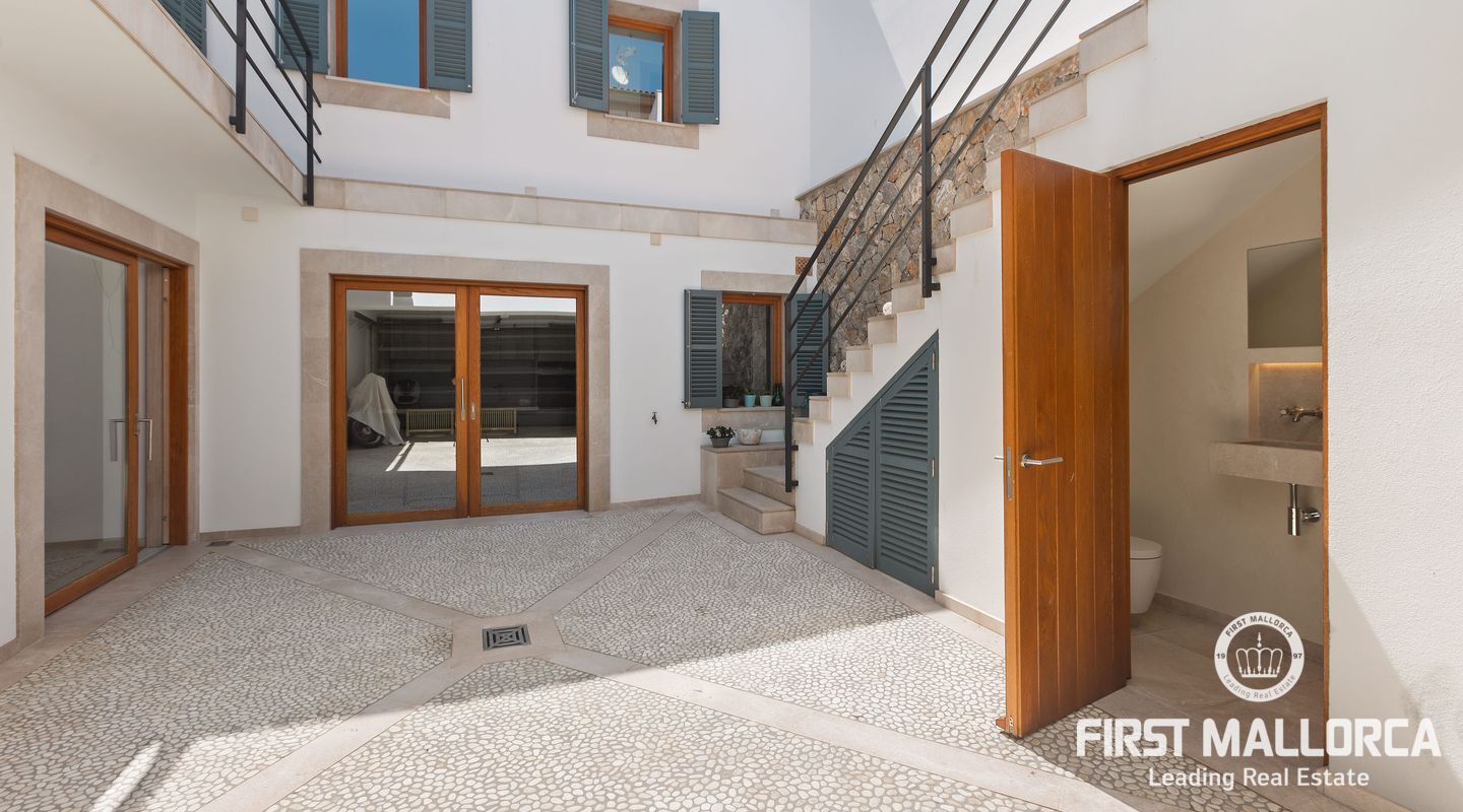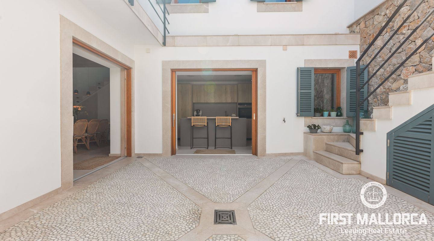 This stylish property has been carefully renovated to the highest standard and is ready for immediate occupation. Situated in a quiet street only a few steps away from the emblematic village square with its weekly local markets and lively restaurants. Filled with natural light flowing through the property, the interior design flawlessly combines the contemporary style with Mallorcan elements, such as wood beams, custom made carpentry, a designer kitchen with top-end appliances as well as a private central courtyard, perfect for entertaining and dining al-fresco. The modern Mediterranean atmosphere continues upstairs, where the 3 well appointed bedrooms and bathrooms invite to relax in a peaceful setting. Several generous outside spaces, such as the patio and the large sun lounge terrace with its own BBQ fulfill all your Mallorcan dreams. The practicality of this house is enhanced by a secure private double garage, well appointed and discreet laundry room, as well as a cozy wood burner, complementing a throughout under floor heating and hot and cold air conditioning system.