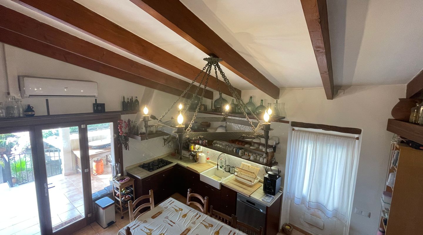 You enter through large wooden doors into a comfortable living area with a wood-burning stove. To the left are a guest bathroom and double bedroom with built-in wardrobes, while to the right the open-plan kitchen and dining area lead to a back terrace and patio garden. A wood and steel staircase connects both floors. The home is well maintained, featuring air conditioning in the kitchen and bedrooms for comfort throughout the seasons.