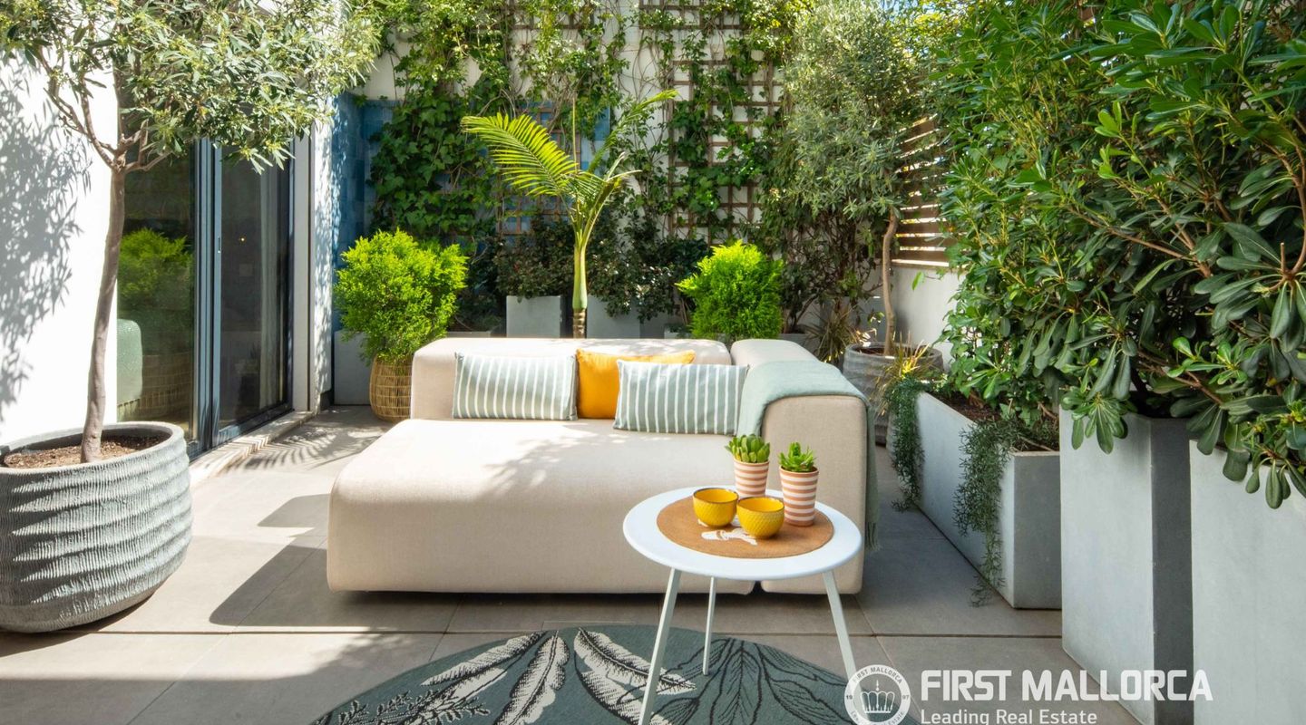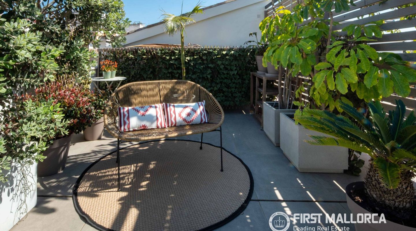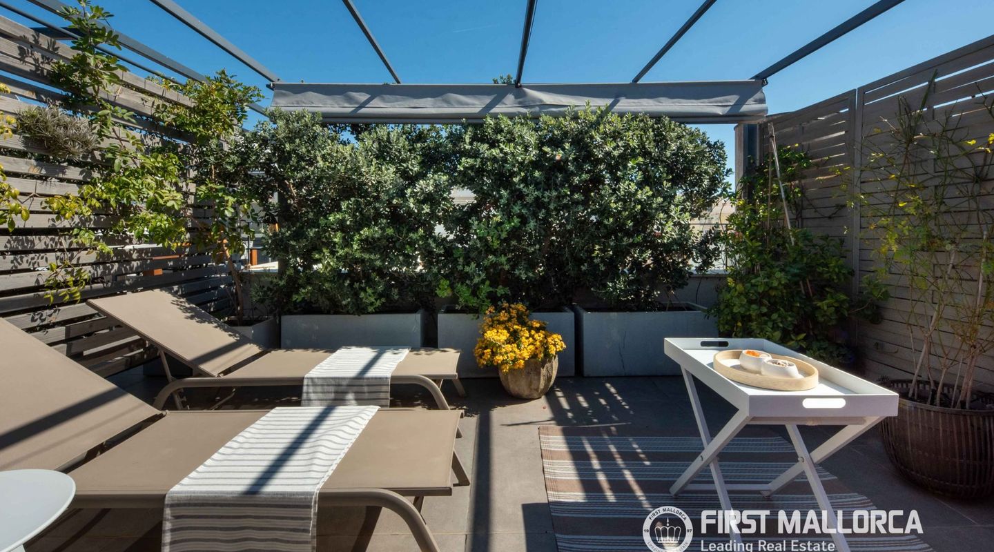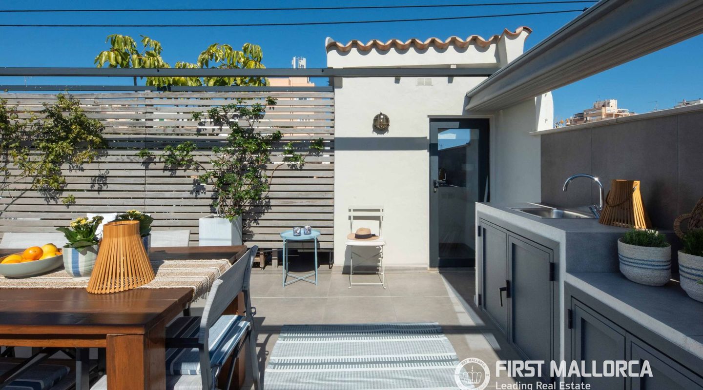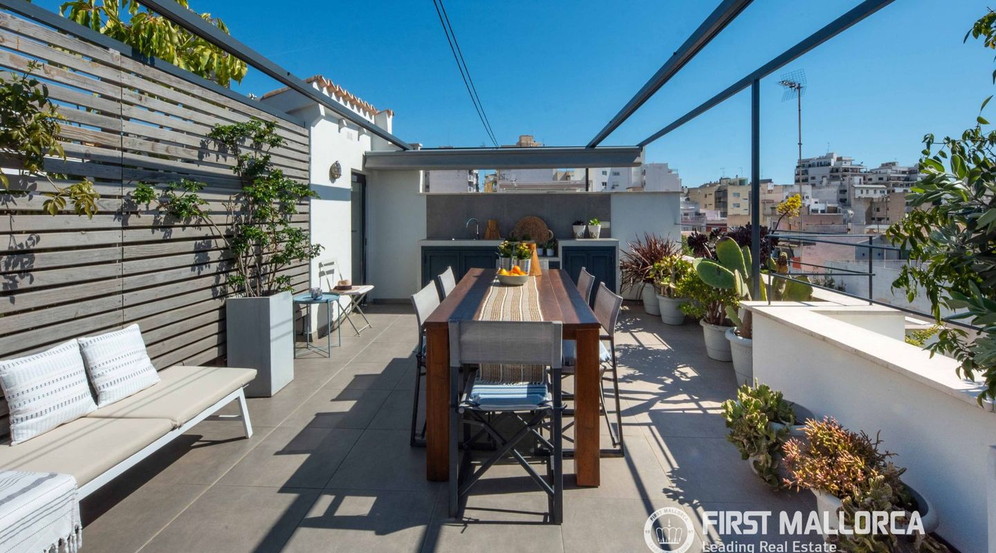 The approximately 150 m² rooftop terrace is a highlight: equipped with an outdoor kitchen, dining area, chill-out zones, and lounge spaces, it offers breathtaking panoramic views over the city and invites you to enjoy relaxed hours under the Mallorcan sun.