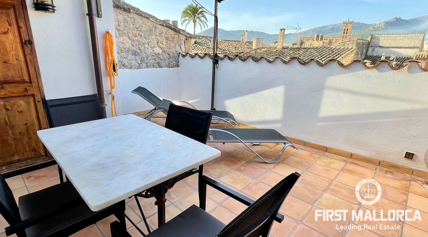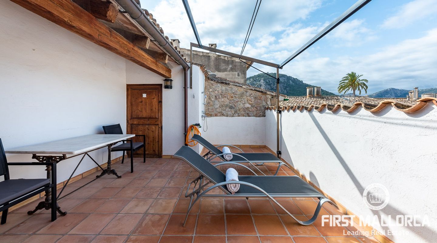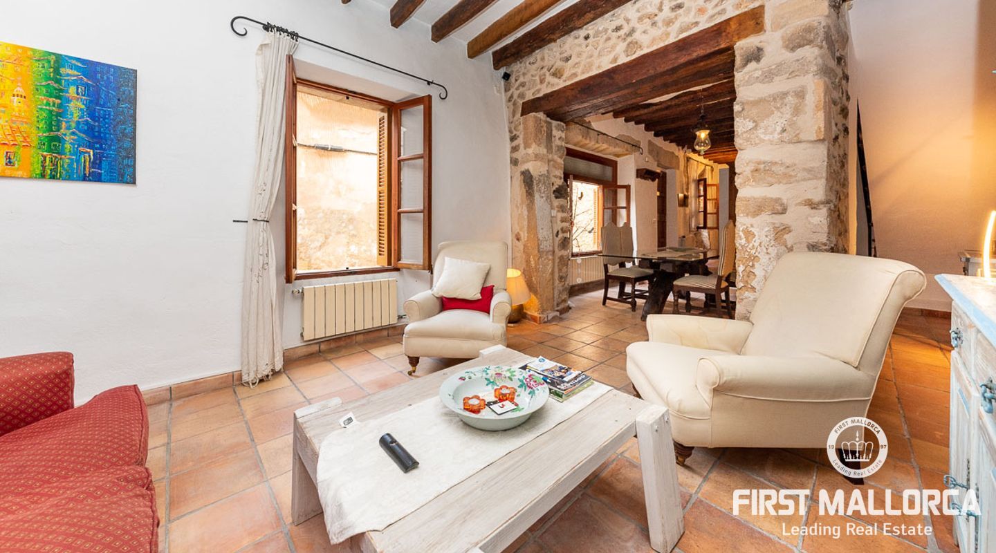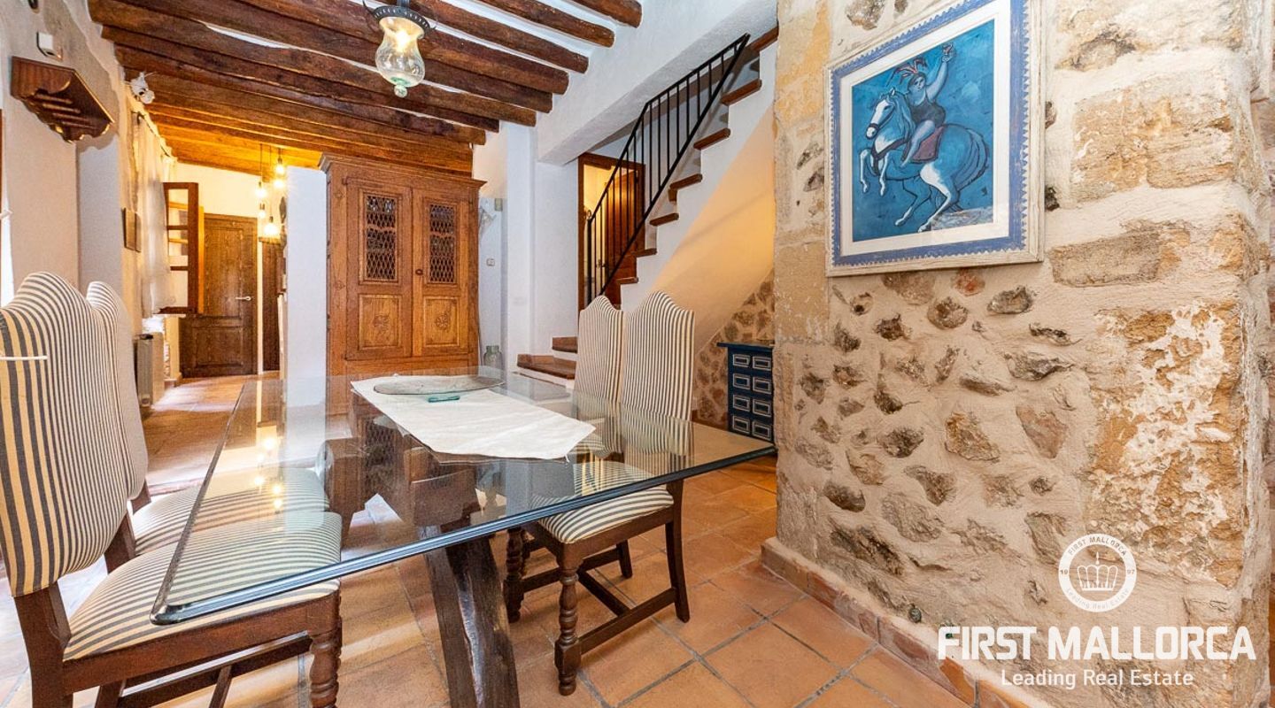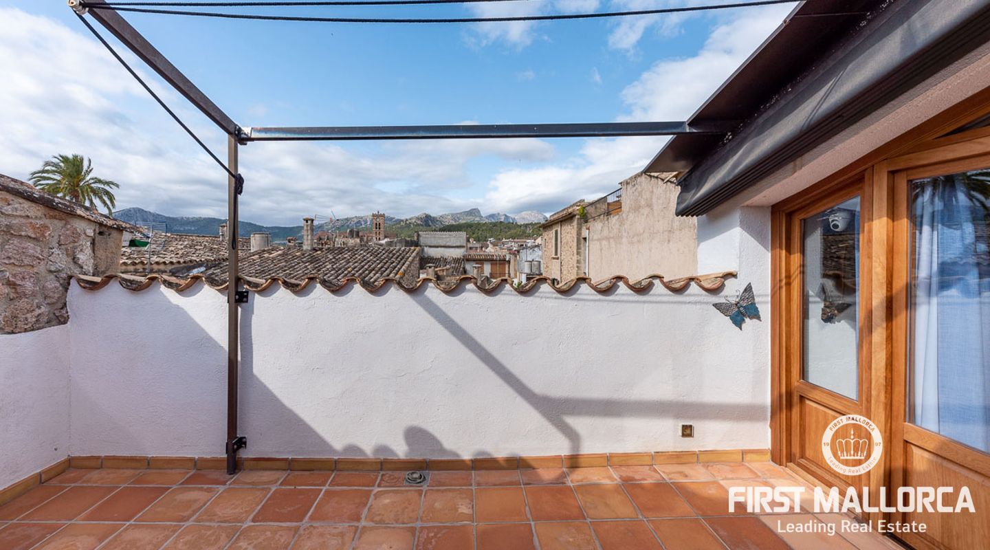 This charming townhouse, located in the historic centre of the village of Pollença, stands out in particular for its authentic original features such as the stone façade that retains the Mallorcan rustic style. The premises have a total plot size of 82m2 and constructed area of 248m2 is distributed over three floors. On the ground floor of the property we can find an open plan living room and dining room which is complemented by beautiful interior stone walls and wooden beams, you can also find the guest toilet and a fully fitted kitchen. On the second floor of the property, we are presented with two bedrooms, both of which are ensuite and a living area, which offers enough space to convert the area into a room that suits your needs. The highlight of this property is the top floor, where you find the master suite which opens out onto a terrace 17m2, that offers spectacular views of the mountains and village of Pollença. As well as being surrounded by the history and culture of this beautiful northern town, this perfect location also ensures access to all amenities and essential services. Do not hesitate to contact our FIRST MALLORCA team for more information and to arrange a viewing.