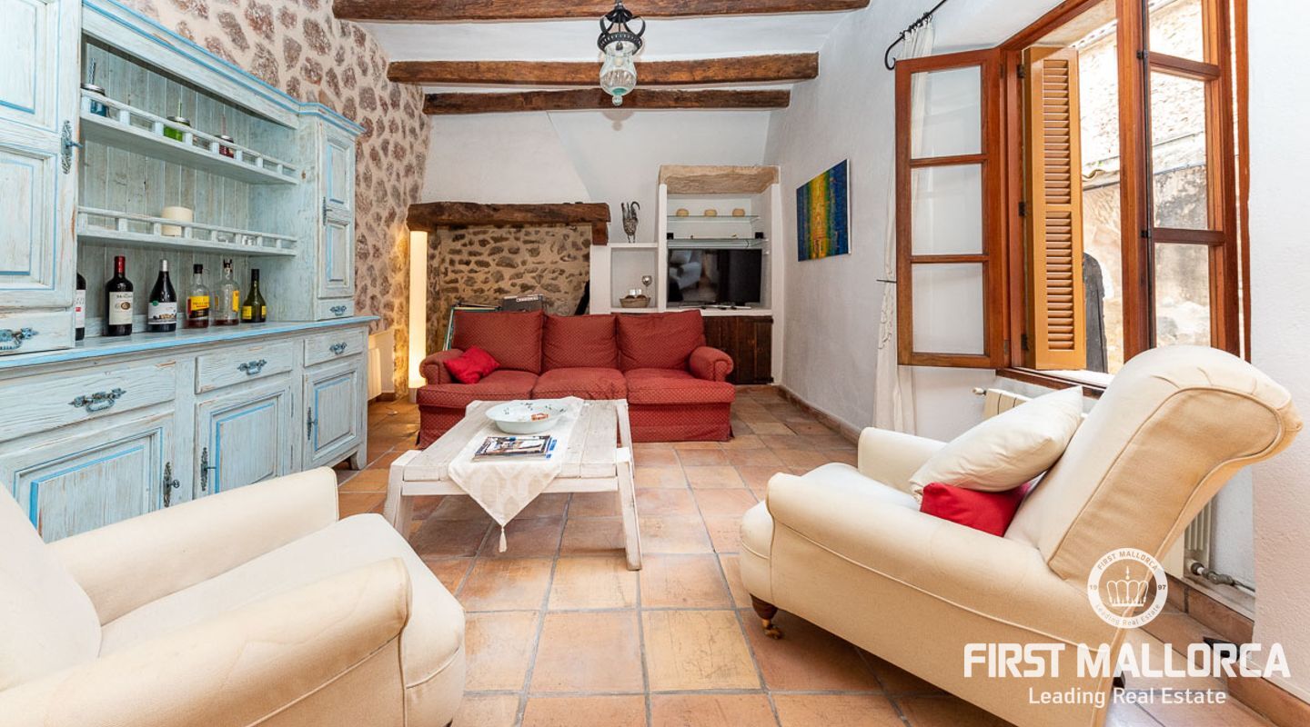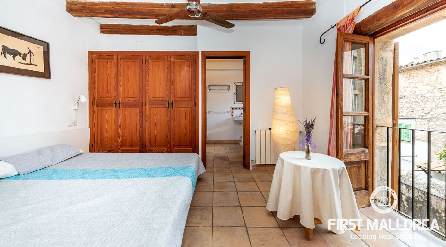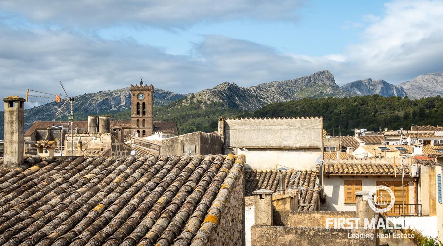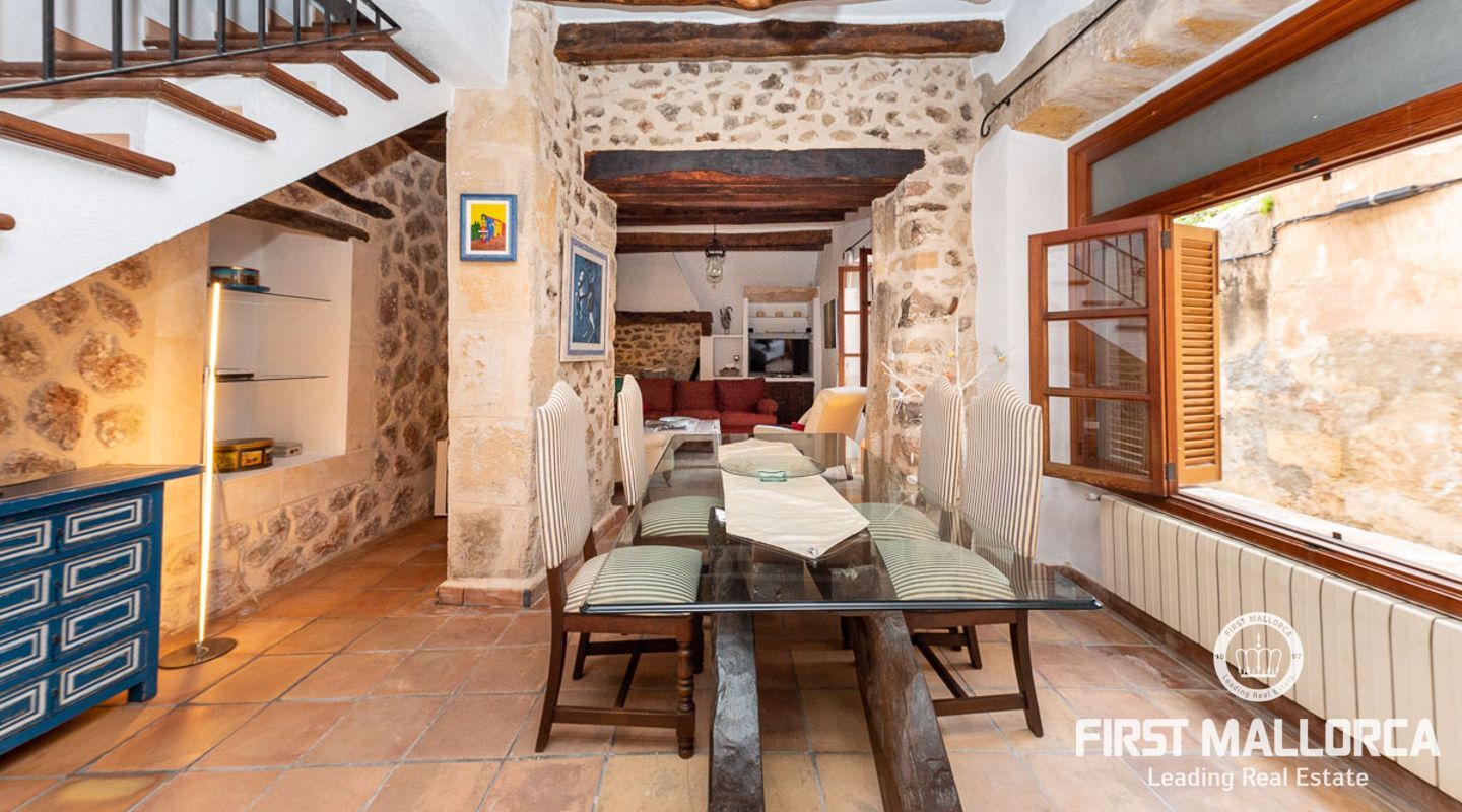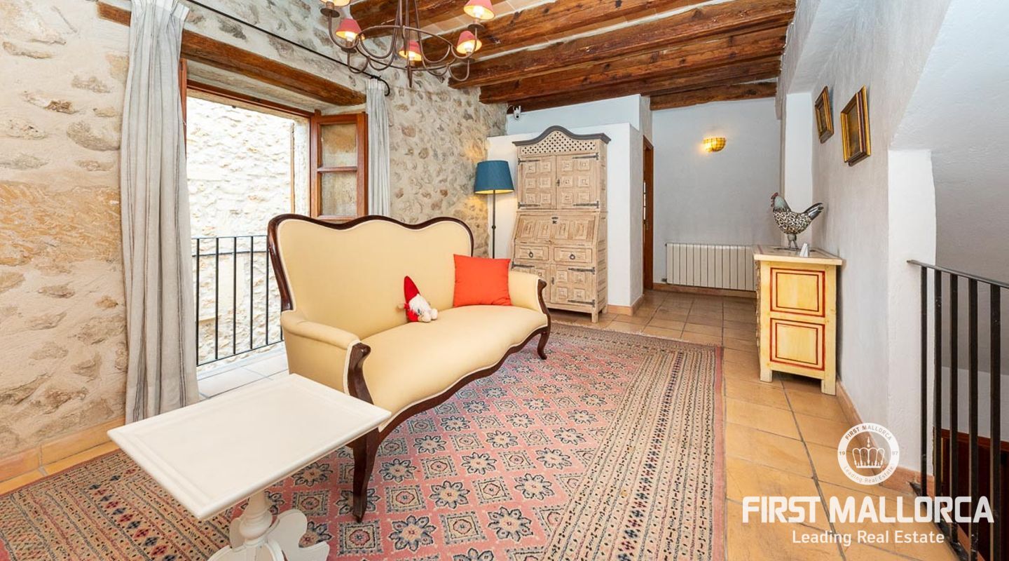 This charming townhouse, located in the historic centre of the village of Pollença, stands out in particular for its authentic original features such as the stone façade that retains the Mallorcan rustic style. The premises have a total plot size of 82m2 and constructed area of 248m2 is distributed over three floors. On the ground floor of the property we can find an open plan living room and dining room which is complemented by beautiful interior stone walls and wooden beams, you can also find the guest toilet and a fully fitted kitchen. On the second floor of the property, we are presented with two bedrooms, both of which are ensuite and a living area, which offers enough space to convert the area into a room that suits your needs. The highlight of this property is the top floor, where you find the master suite which opens out onto a terrace 17m2, that offers spectacular views of the mountains and village of Pollença. As well as being surrounded by the history and culture of this beautiful northern town, this perfect location also ensures access to all amenities and essential services. Do not hesitate to contact our FIRST MALLORCA team for more information and to arrange a viewing.