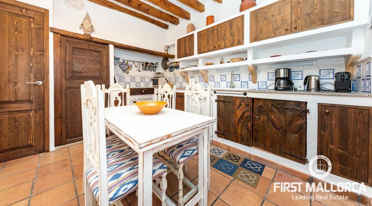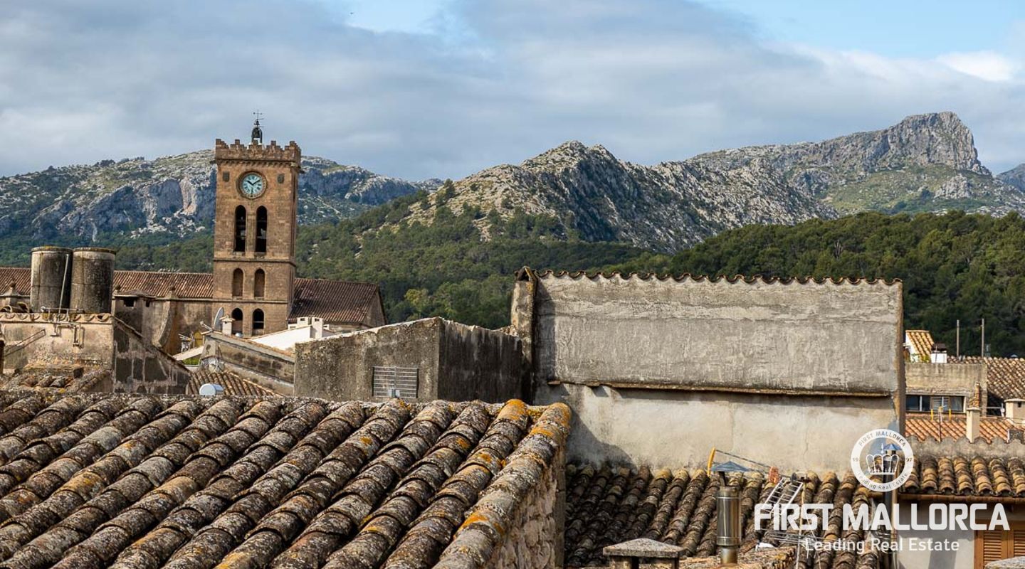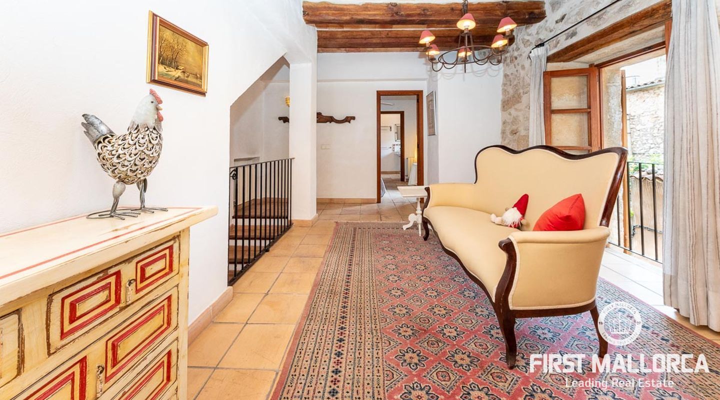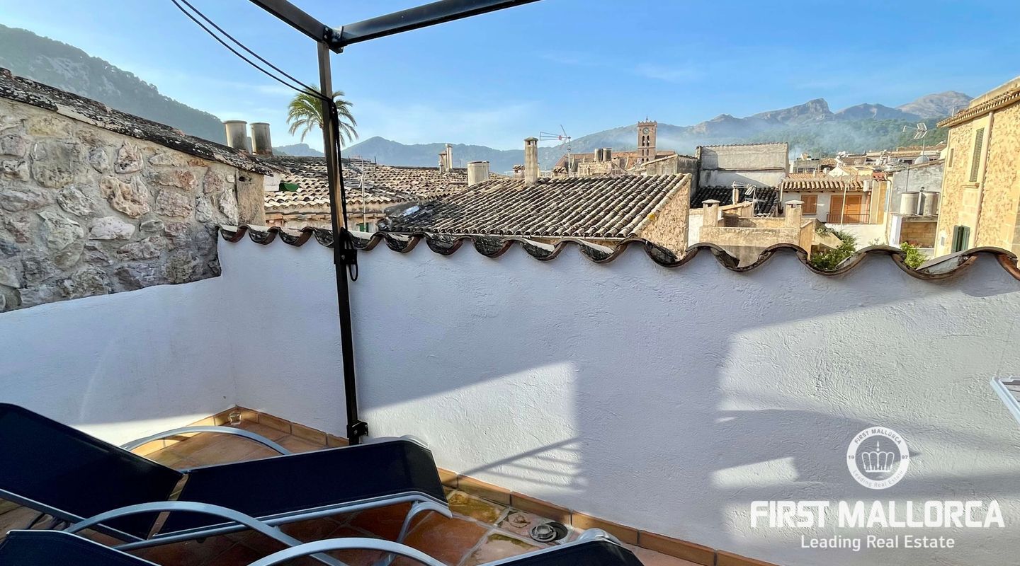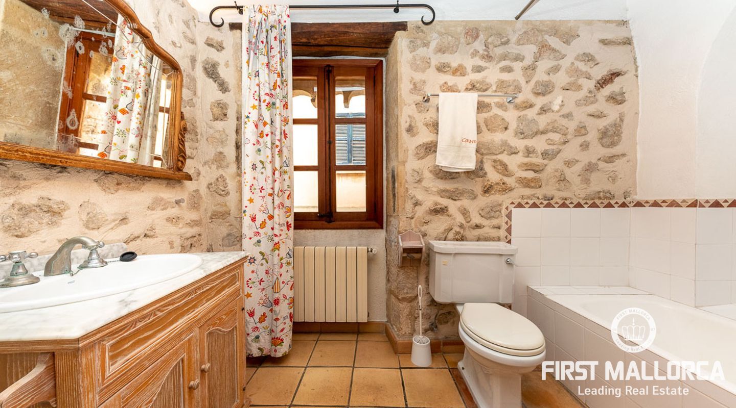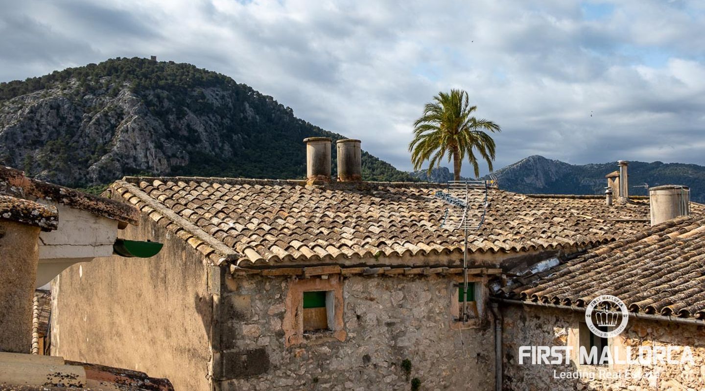 This charming townhouse, located in the historic centre of the village of Pollença, stands out in particular for its authentic original features such as the stone façade that retains the Mallorcan rustic style. The premises have a total plot size of 82m2 and constructed area of 248m2 is distributed over three floors. On the ground floor of the property we can find an open plan living room and dining room which is complemented by beautiful interior stone walls and wooden beams, you can also find the guest toilet and a fully fitted kitchen. On the second floor of the property, we are presented with two bedrooms, both of which are ensuite and a living area, which offers enough space to convert the area into a room that suits your needs. The highlight of this property is the top floor, where you find the master suite which opens out onto a terrace 17m2, that offers spectacular views of the mountains and village of Pollença. As well as being surrounded by the history and culture of this beautiful northern town, this perfect location also ensures access to all amenities and essential services. Do not hesitate to contact our FIRST MALLORCA team for more information and to arrange a viewing.