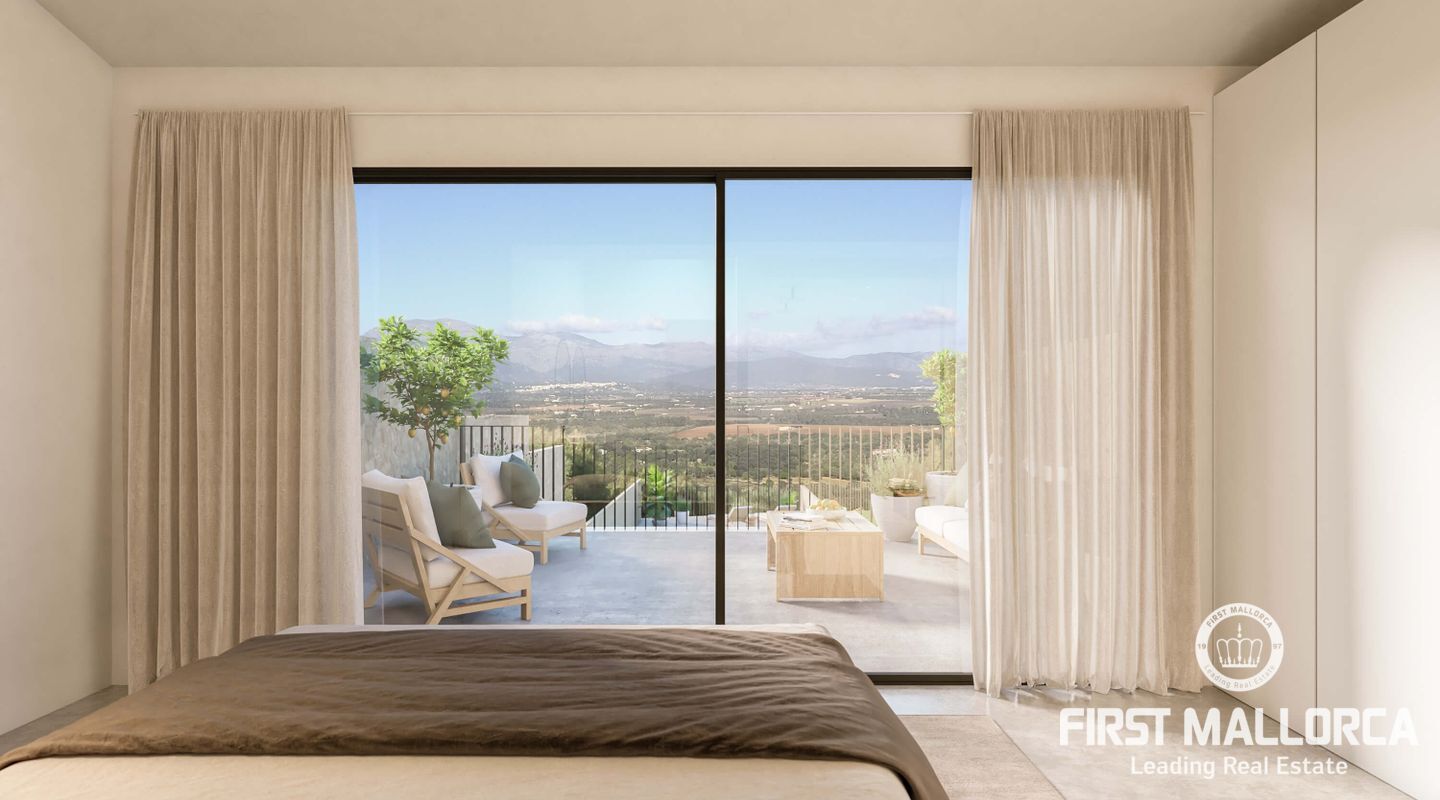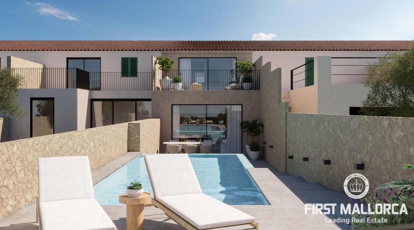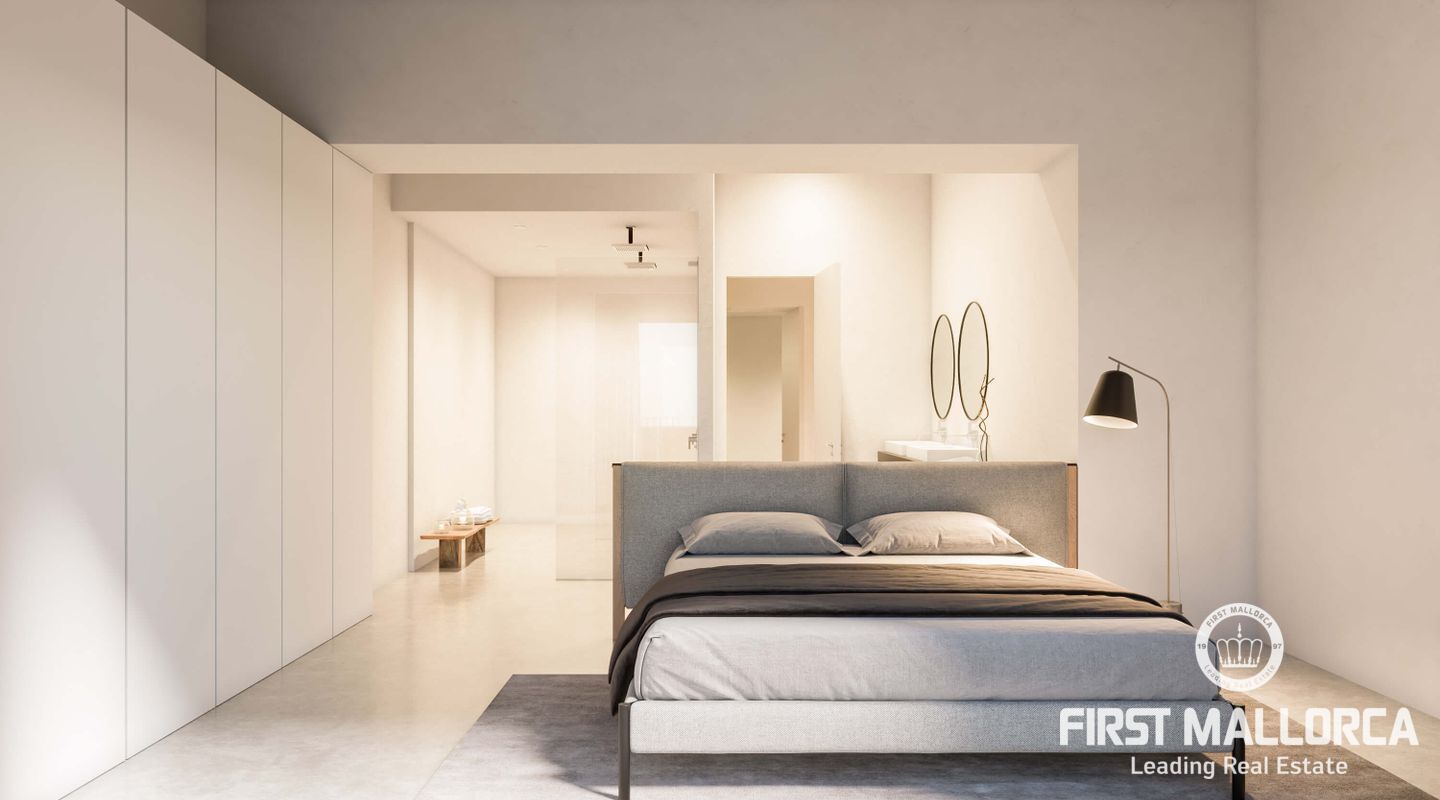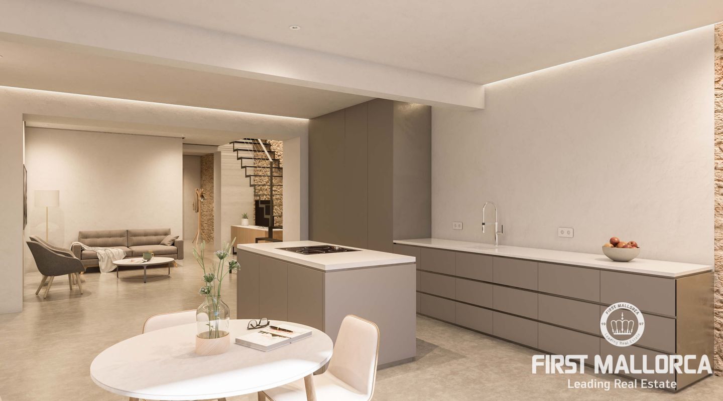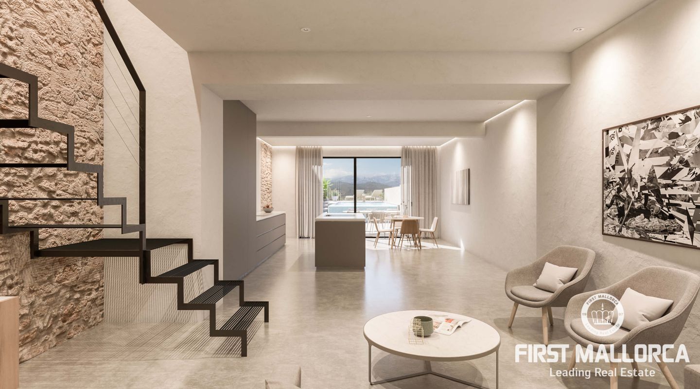 This village house, built in 1900, is being completely renovated and extended while preserving some of the original elements. On the ground floor there is the open plan living, dining and kitchen area with big windows overlooking the pool, as well as a bedroom and a bathroom. On the upper floor are the other two bedrooms and two further bedrooms. From the various terraces and the pool you have a fantastic view over the landscape and to the Tramuntana mountains. Details are polished concrete floors and micro cement, iron staircase, double glazing, air conditioning hot/cold and underfloor heating. The completion of this wonderful village house is planned for spring 2023.