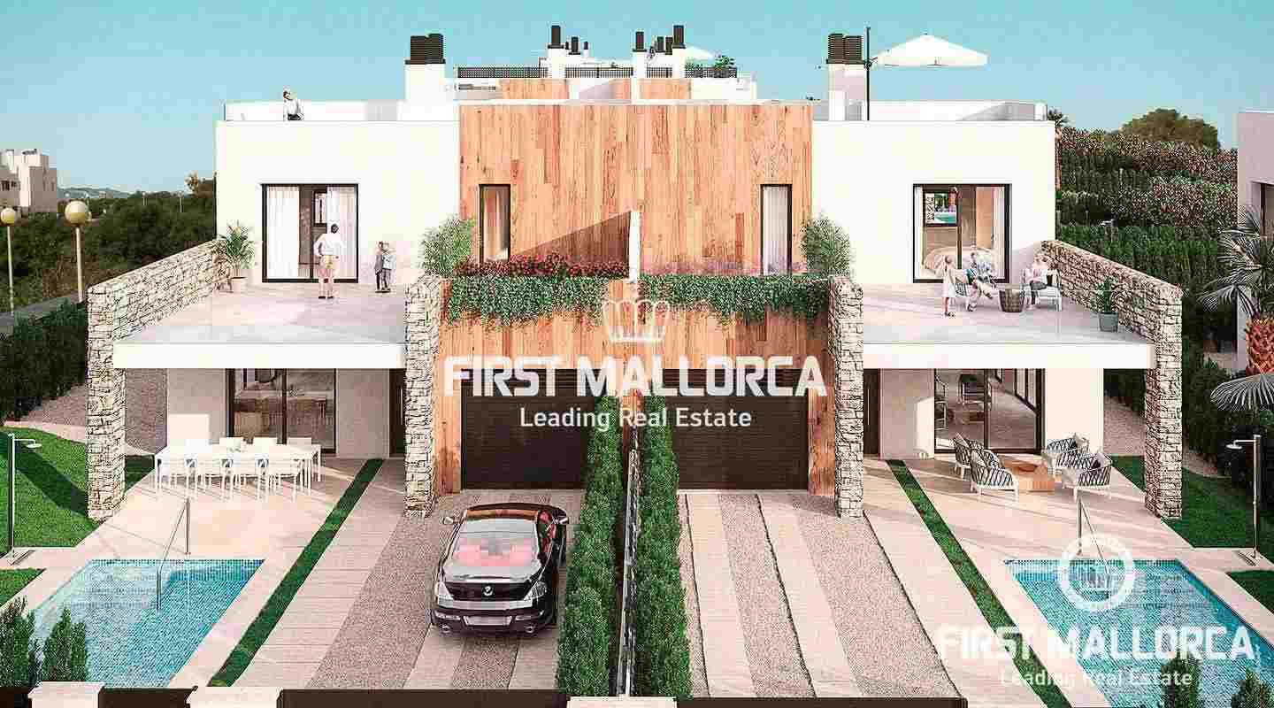 On the ground floor there is an open living/dining area with kitchen. Floor-to-ceiling windows allow direct access to the garden, which is the perfect place to relax and cool down thanks to the pool. On this floor there is also a bedroom, a bathroom and a utility room. Upstairs there are 2 more bedrooms, each with en-suite bathroom and access to a private terrace where you can enjoy the Majorcan sun. Furthermore, each property has a garage.