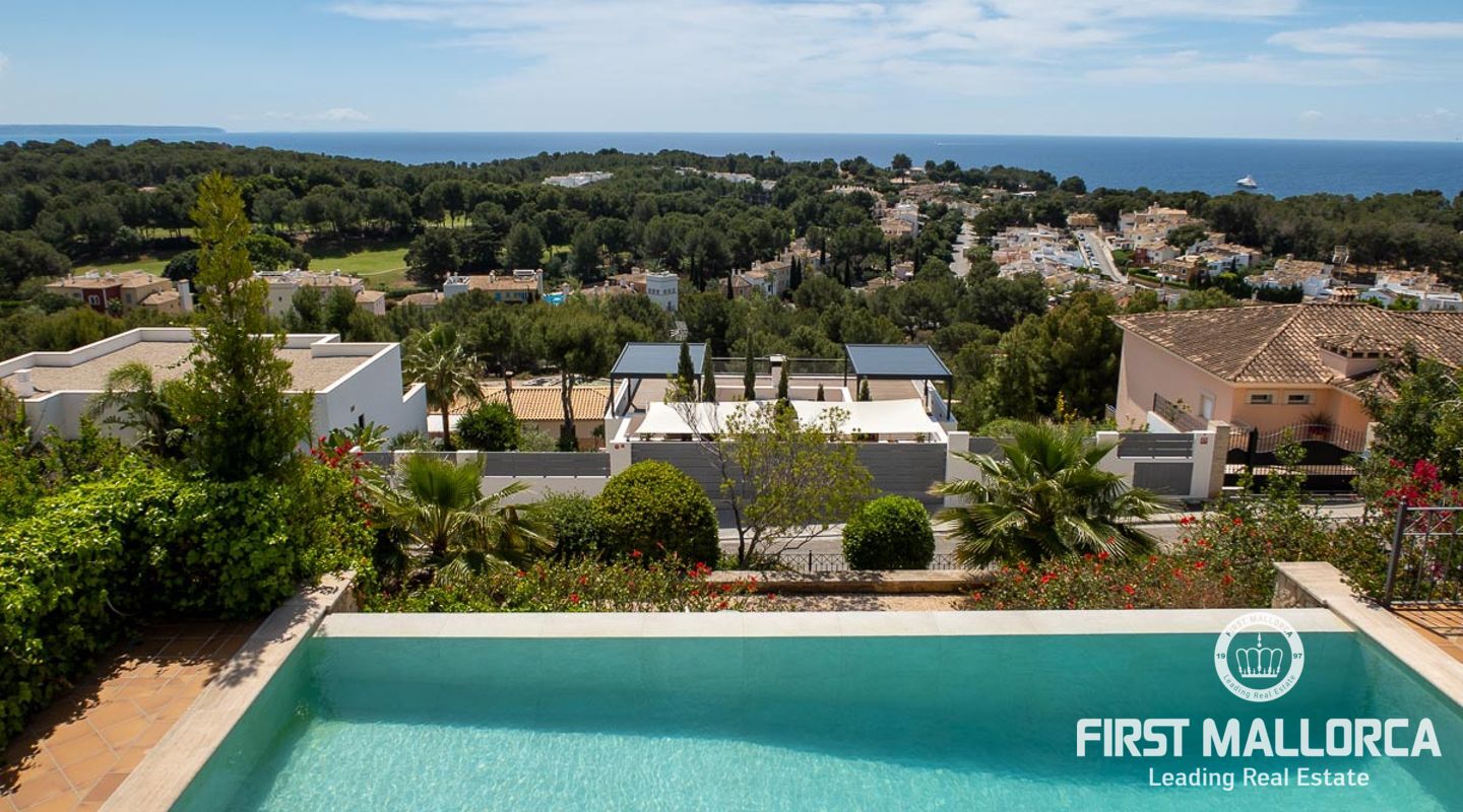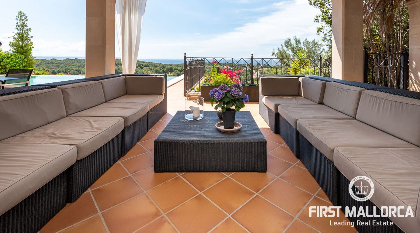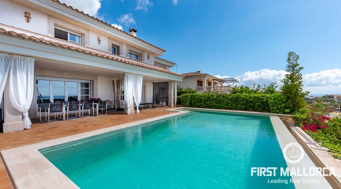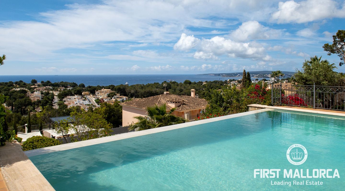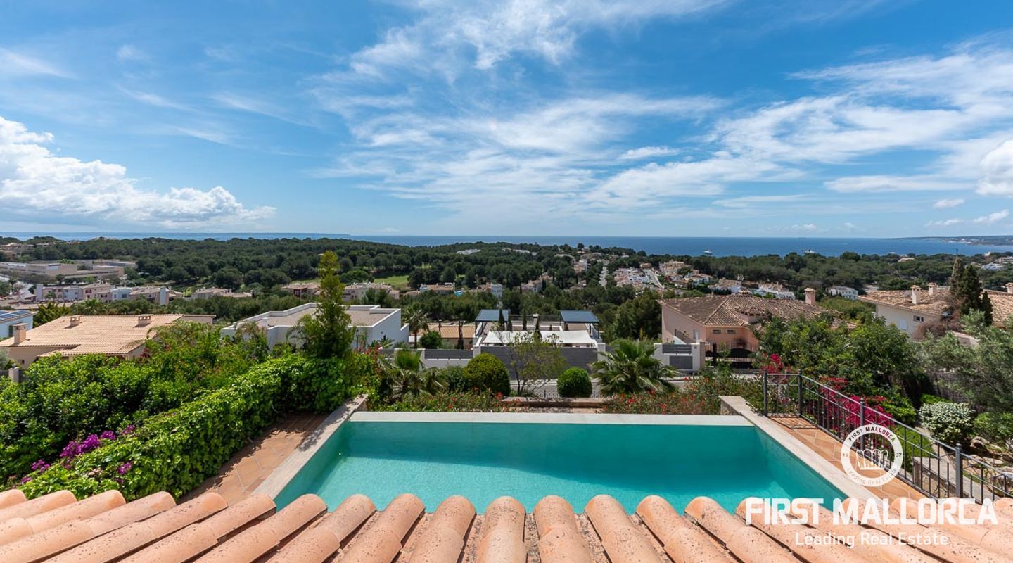 We are proud to present this sophisticated villa offering panoramic sea and golf views from its elevated position in the upmarket residential area of Anchorage Hill. It is easy to feel at home here immediately thanks to its spacious and bright interior which is totally connected to the generous covered and open terraces, allowing one to enjoy to the fullest the essence of Mediterranean living. Great care has been taken to create a comfortable and practical but yet very elegant family home which is also prepared for entertaining with family and friends at its highest level. Unqiue features of this fine piece of Mallorca real estate include: hot & cold AC, marble flooring, lift, barbecue, extensive storage and private garaging for 4 vehicles. The extensive sea views and enjoyed from all rooms and bedrooms as well as from the stunning pool area. Anchorage Hill in Bendinat is one of the island's absolut top residential areas, allowing easy access to virtually everything - the elegent Marina of Puerto Portals, the Royal Bendinat Golf Course, the extraordinary beaches of the southwest coast and still only 10 minutes into the city centre of Palma de Mallorca.