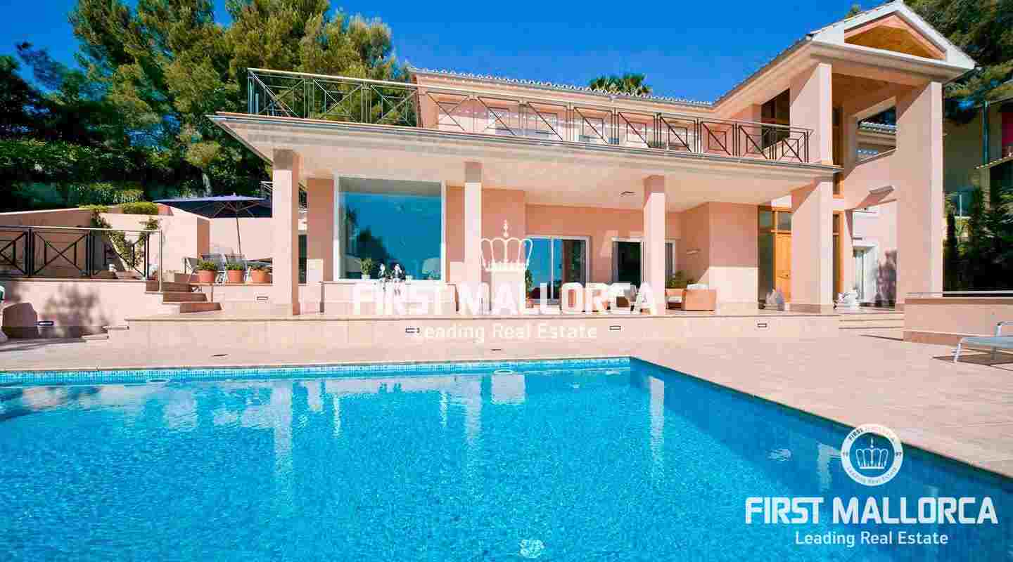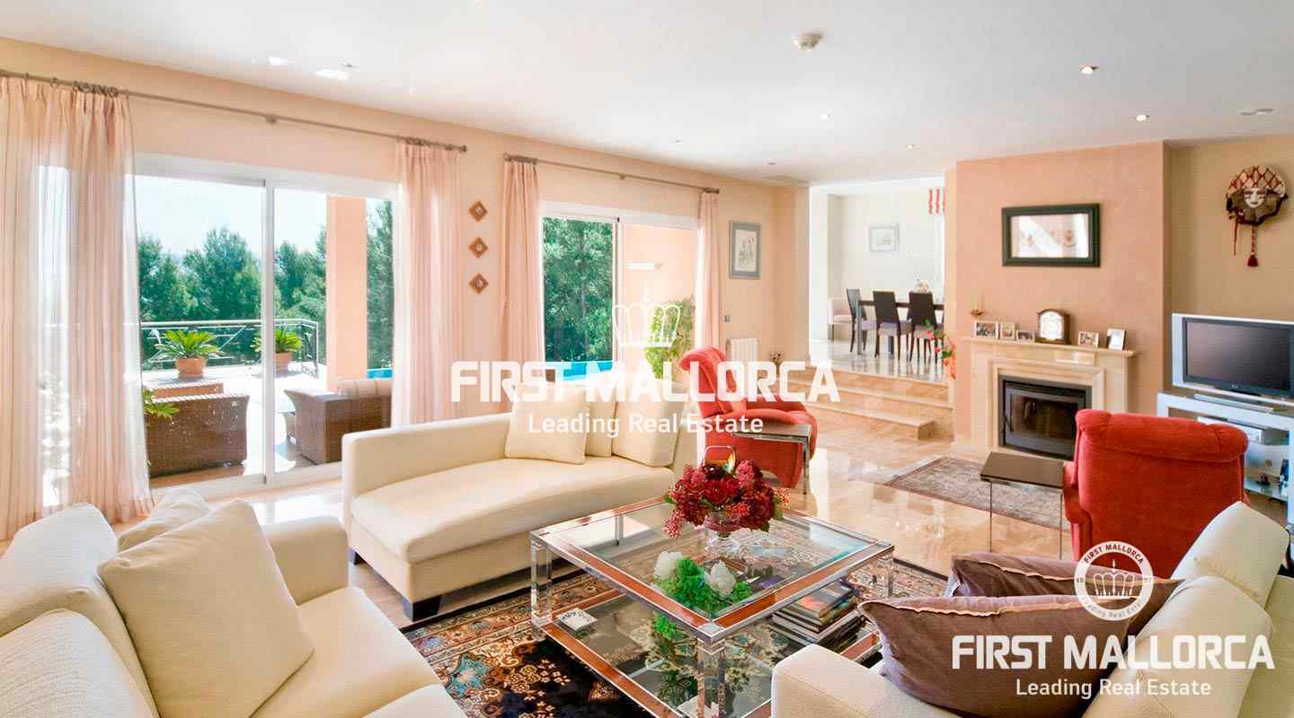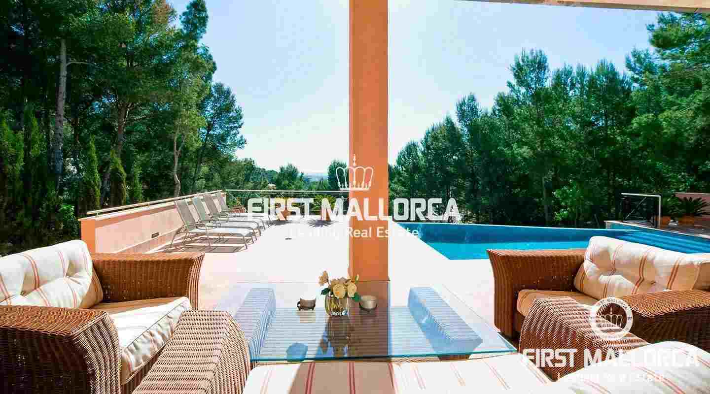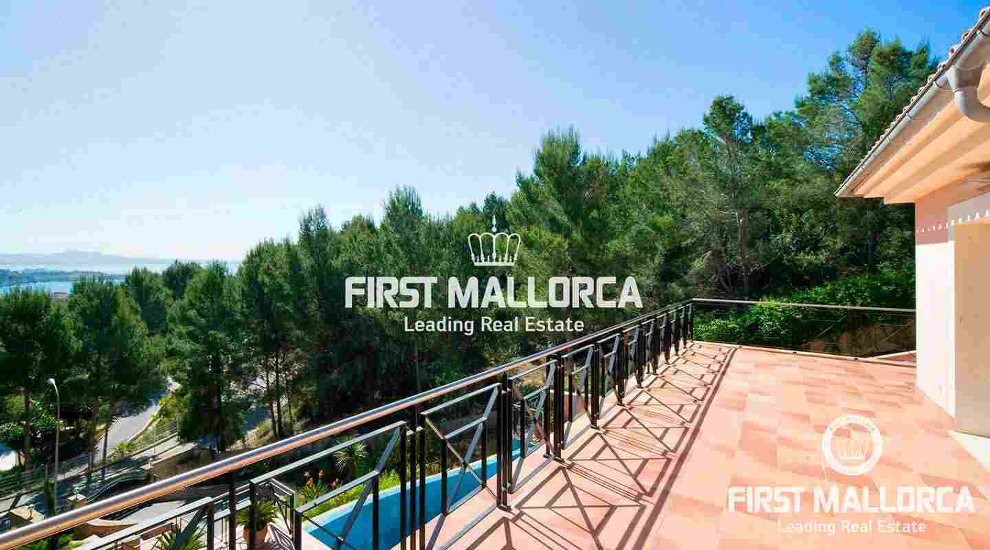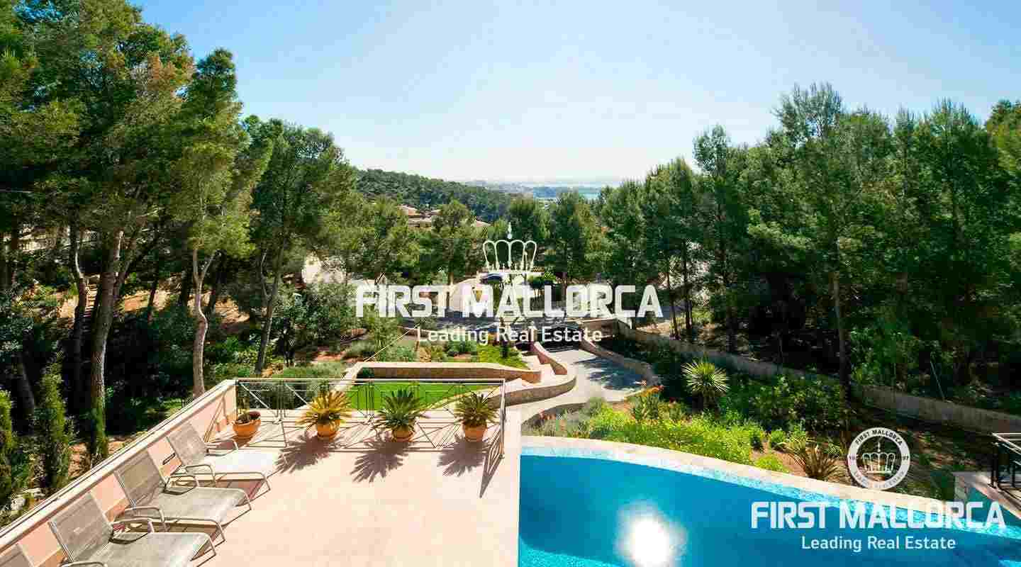 This pristine, bright and sunny villa situated in the exclusive residential area of Bendinat enjoys extensive views towards the bay of Palma. The property has a landscaped Mediterranean garden and is adjacent to a green zone ensuring privacy. On the ground floor, the villa has a double height ceiling entrance hall, a spacious living room with fireplace, a dining room and a live-in kitchen. There is also a laundry room, an interior garden patio, a guest bedroom suite and a guest-WC on the same floor. A marble staircase leads up to the first floor, where one finds the master bedroom with bathroom en suite and dressing room, as well as 2 other bedrooms sharing an interconnecting bathroom. Further features of the property include central heating, air conditioning h/c, parquet and marble flooring, double garage with lift access to the living level and a private swimming pool. Bendinat is undoubtedly one of Mallorca's top addresses thanks to its peaceful residential neighbourhoods and still easy access to the centre of Palma in 10 minutes by car. The international airport can be reached in less than 20 minutes.