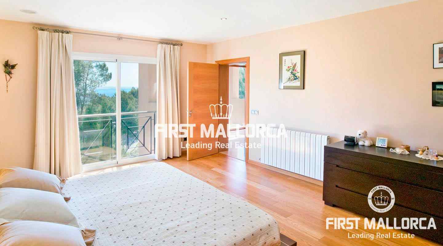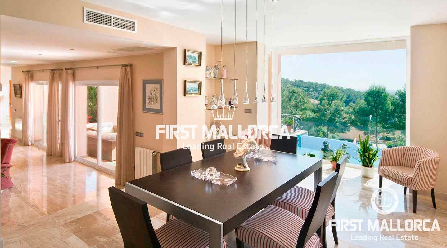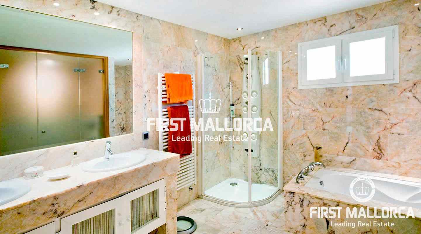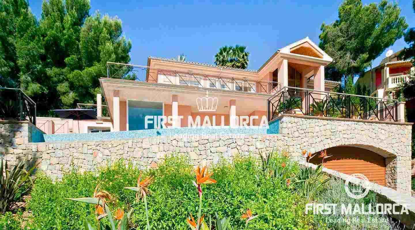 This pristine, bright and sunny villa situated in the exclusive residential area of Bendinat enjoys extensive views towards the bay of Palma. The property has a landscaped Mediterranean garden and is adjacent to a green zone ensuring privacy. On the ground floor, the villa has a double height ceiling entrance hall, a spacious living room with fireplace, a dining room and a live-in kitchen. There is also a laundry room, an interior garden patio, a guest bedroom suite and a guest-WC on the same floor. A marble staircase leads up to the first floor, where one finds the master bedroom with bathroom en suite and dressing room, as well as 2 other bedrooms sharing an interconnecting bathroom. Further features of the property include central heating, air conditioning h/c, parquet and marble flooring, double garage with lift access to the living level and a private swimming pool. Bendinat is undoubtedly one of Mallorca's top addresses thanks to its peaceful residential neighbourhoods and still easy access to the centre of Palma in 10 minutes by car. The international airport can be reached in less than 20 minutes.