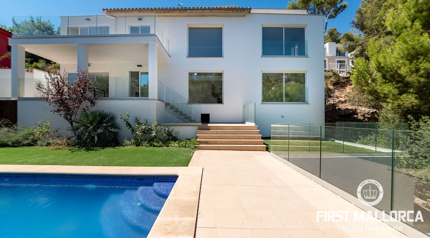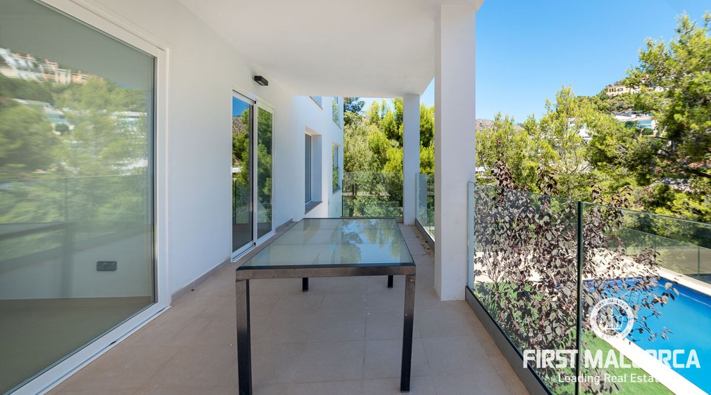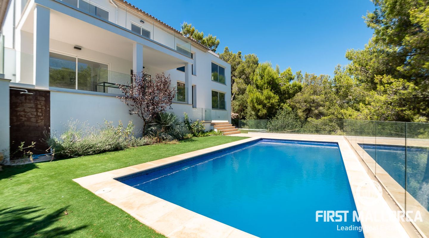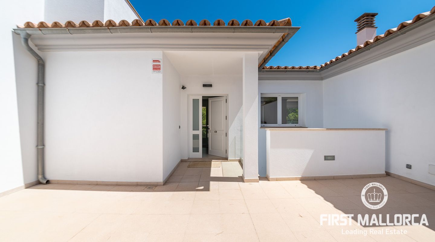This villa is located just a few minutes from the exclusive Puerto Portals and is ideal for families with children. The surroundings are quiet and the plot with a high level of privacy offers a large heated pool surrounded by terraces and lawns. The well-kept property will impress you with an open living concept with a flowing distribution has 4 bedrooms, 3 bathrooms and a modern kitchen with dining area, which is adjacent to a covered terrace. The living area has high ceilings and large windows and is flooded with light.