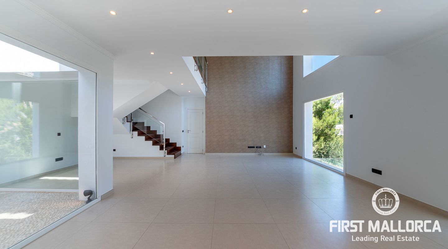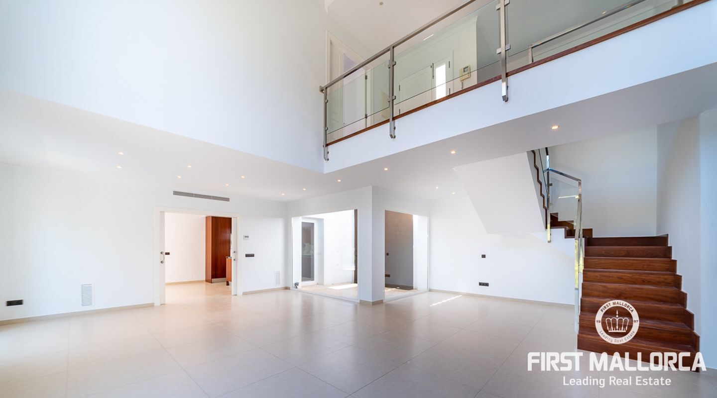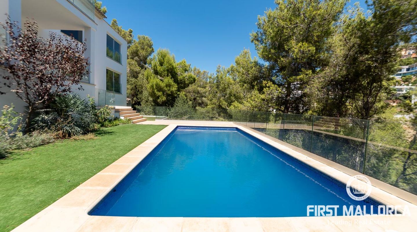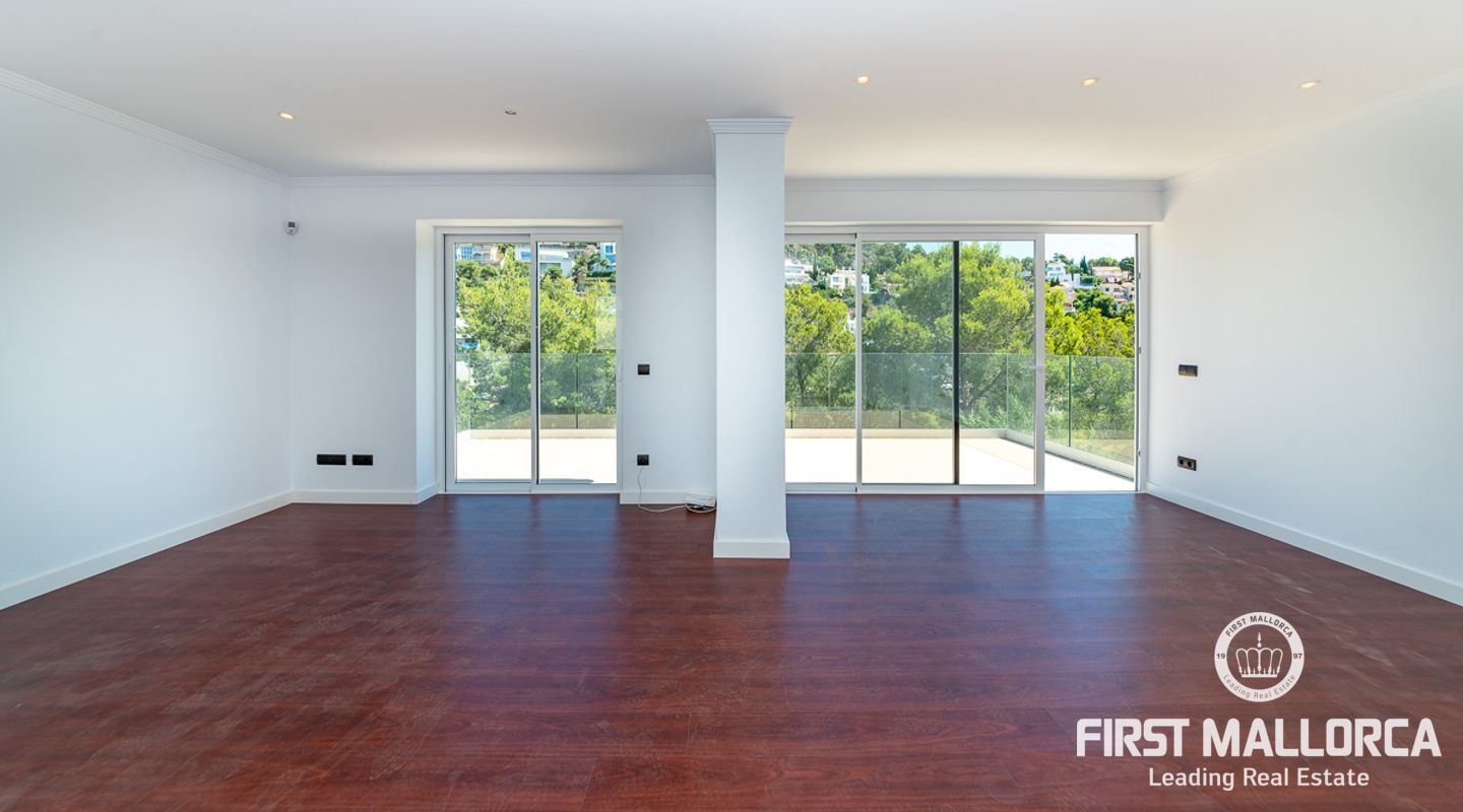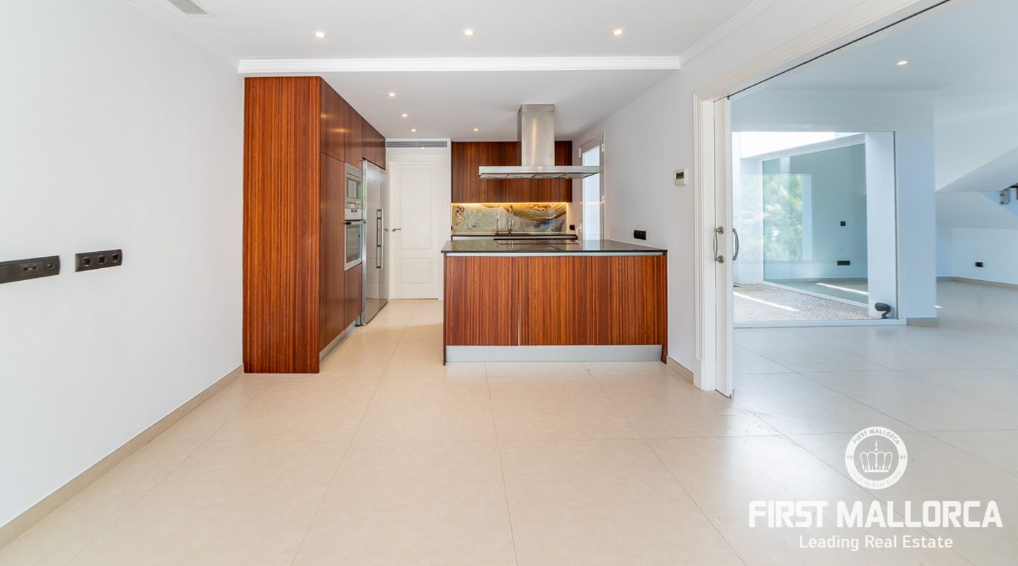 This villa is located just a few minutes from the exclusive Puerto Portals and is ideal for families with children. The surroundings are quiet and the plot with a high level of privacy offers a large heated pool surrounded by terraces and lawns. The well-kept property will impress you with an open living concept with a flowing distribution has 4 bedrooms, 3 bathrooms and a modern kitchen with dining area, which is adjacent to a covered terrace. The living area has high ceilings and large windows and is flooded with light.