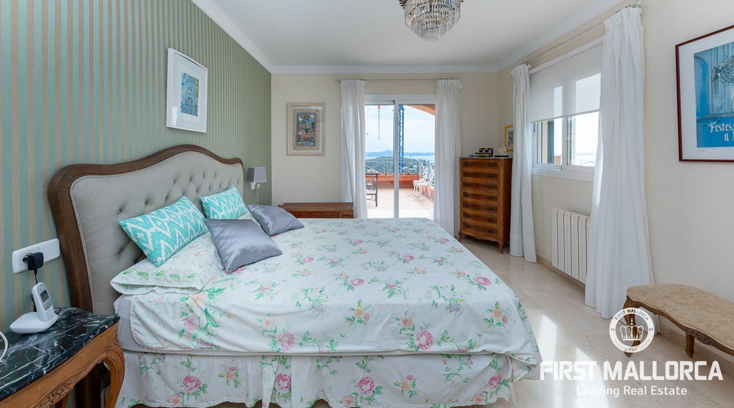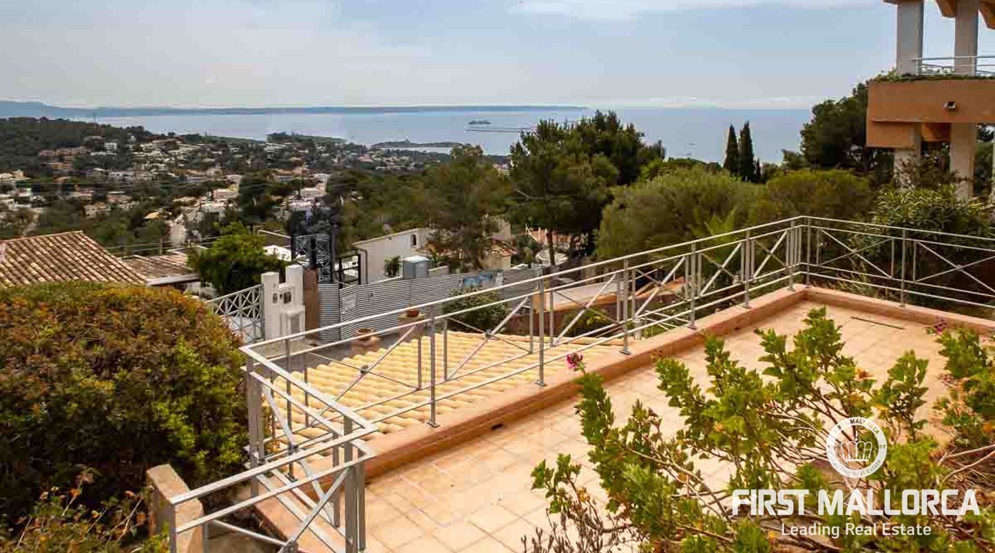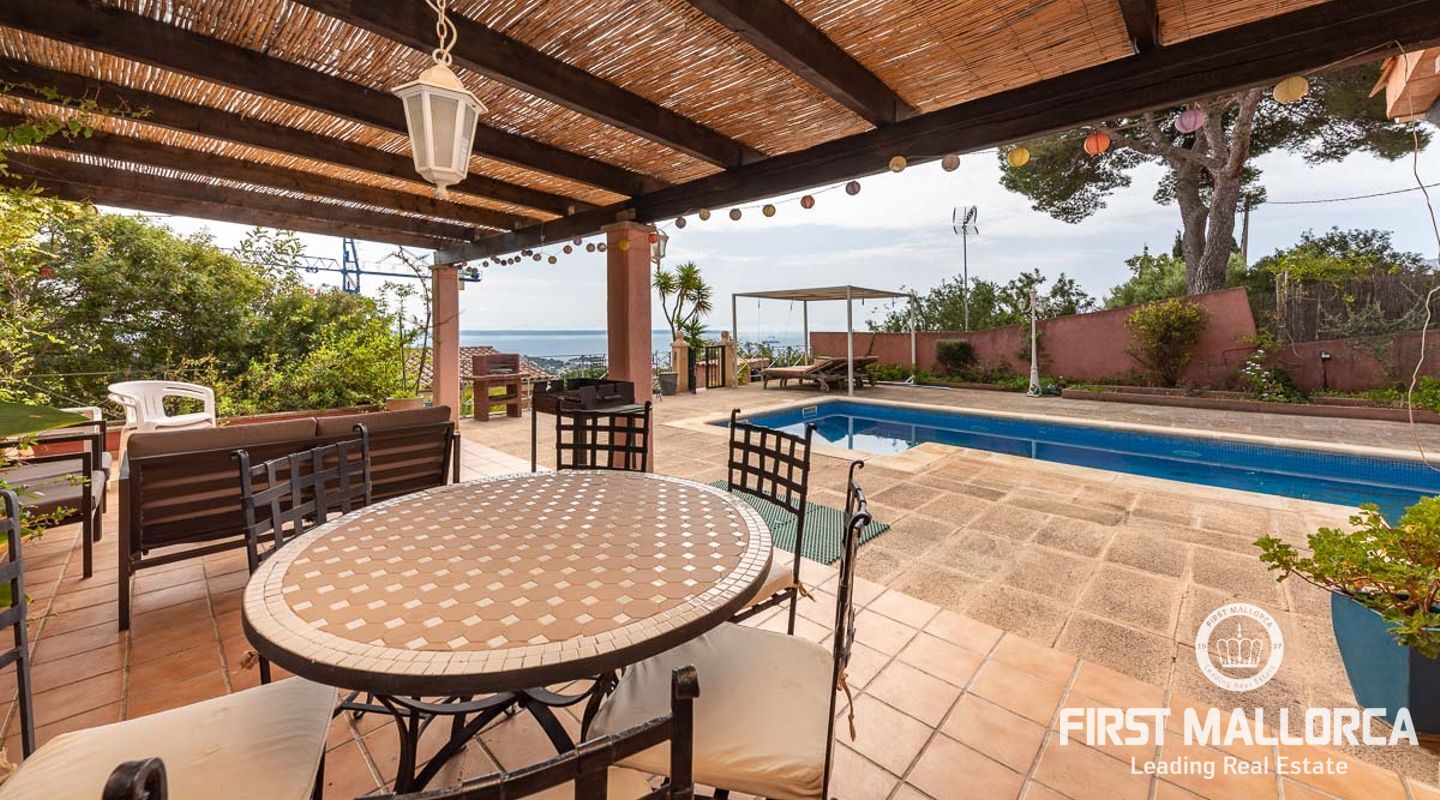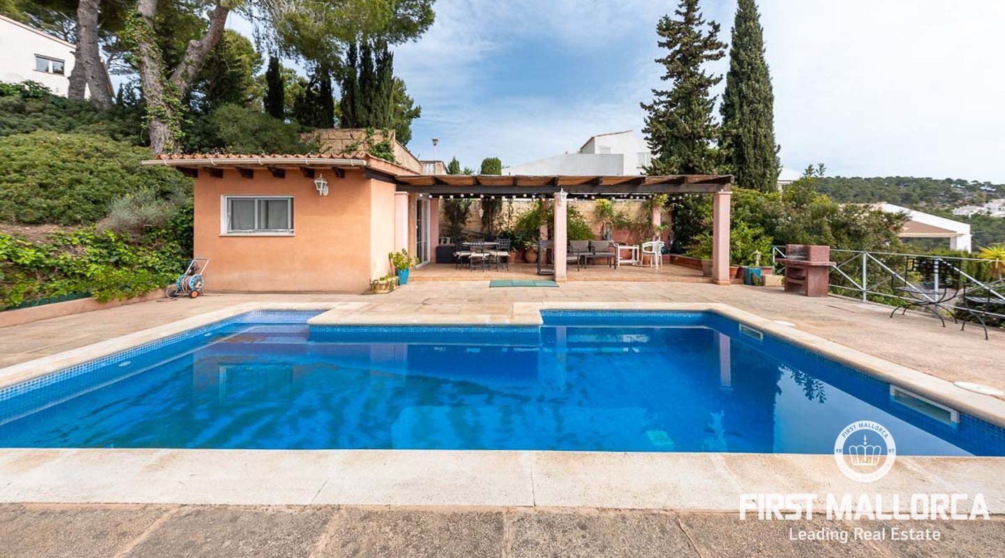 This Mediterranean-style villa with impressive sea views and holiday rental licence is located in a quiet area of Costa d'en Blanes and is ideal for families. On the ground floor, the property impresses with an open-plan living and dining area with high ceilings. The connection to the spacious terrace is flowing. From here you have an impressive view over the area, mountains and all the way to the bay of Palma. In the main house, the property has a total of 4 bedrooms and 2 bathrooms. Another highlight is the elevated and sheltered outdoor area behind the property with pool, covered terrace and separate guest house. This level offers stunning sea views and invites you to enjoy the sun of Mallorca and the Mediterranean outdoor lifestyle.