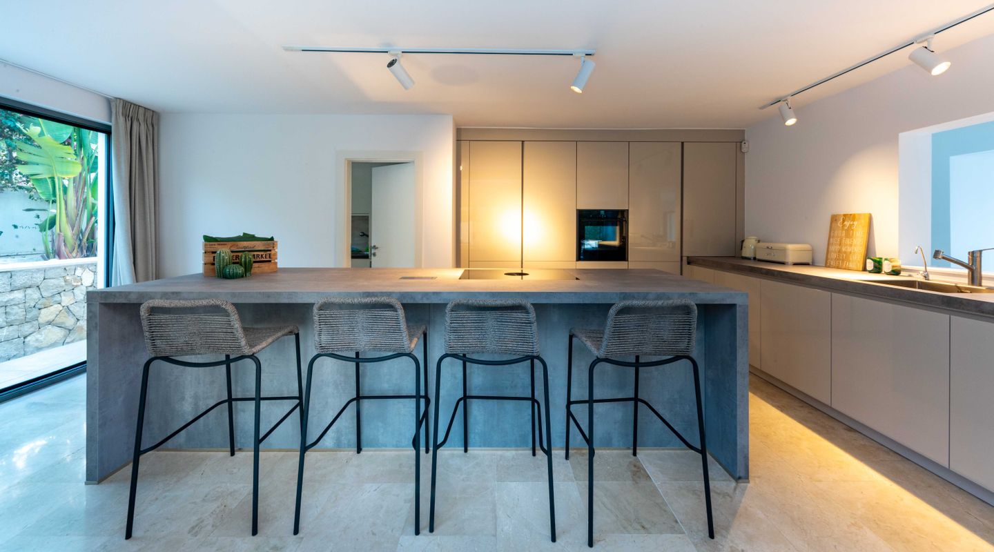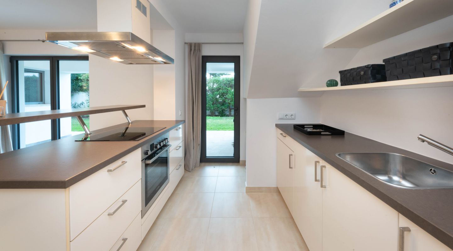 Outside, the property impresses with generous terraces, a saltwater swimming pool, and a beautifully maintained, low-maintenance garden with lawns. A pre-installed summer kitchen by the pool invites long, relaxed evenings under the Mallorcan sky.