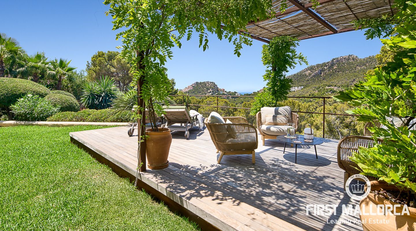 In front of the house there is a decked terrace area surrounded by a leveled lawn.