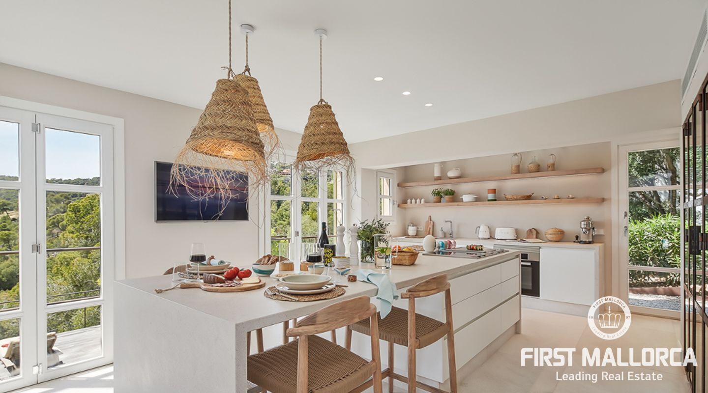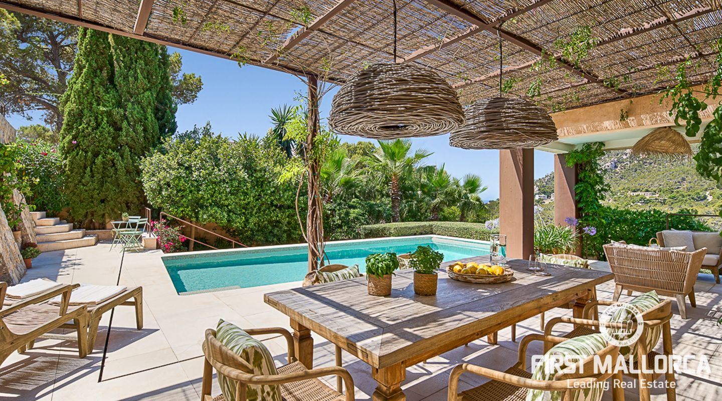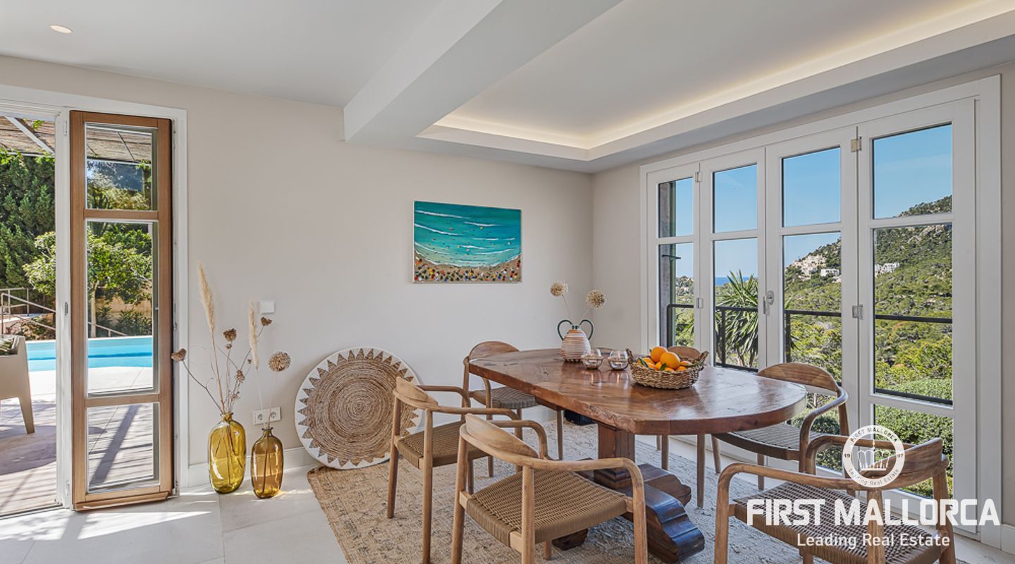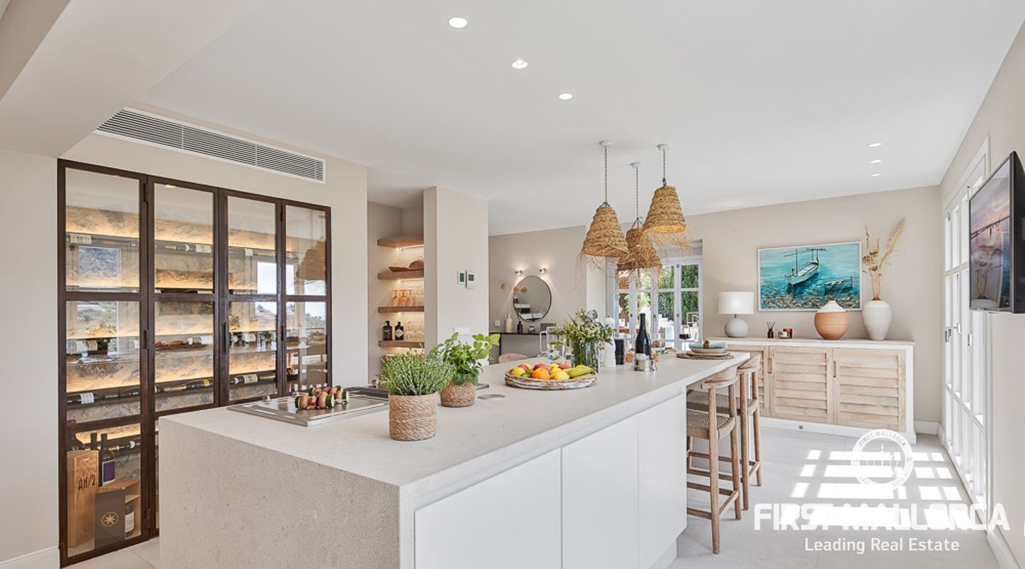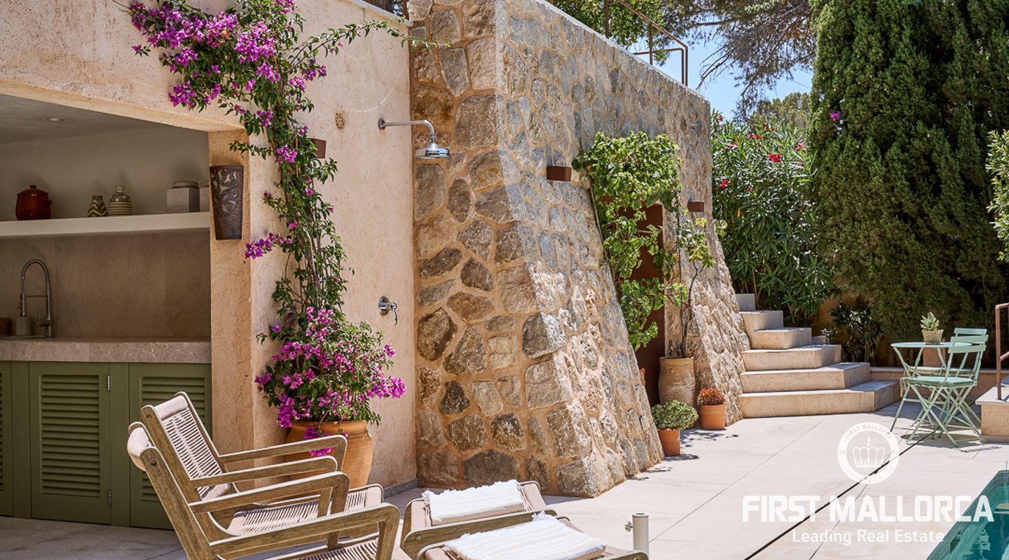 On the lower level is the open plan living area, indoor dining area, kitchen, guest toilet and wine cellar. From this space you walk out to the terraced areas and swimming pool. There is a barbecue area with an outside covered dining space next to the salt water pool.