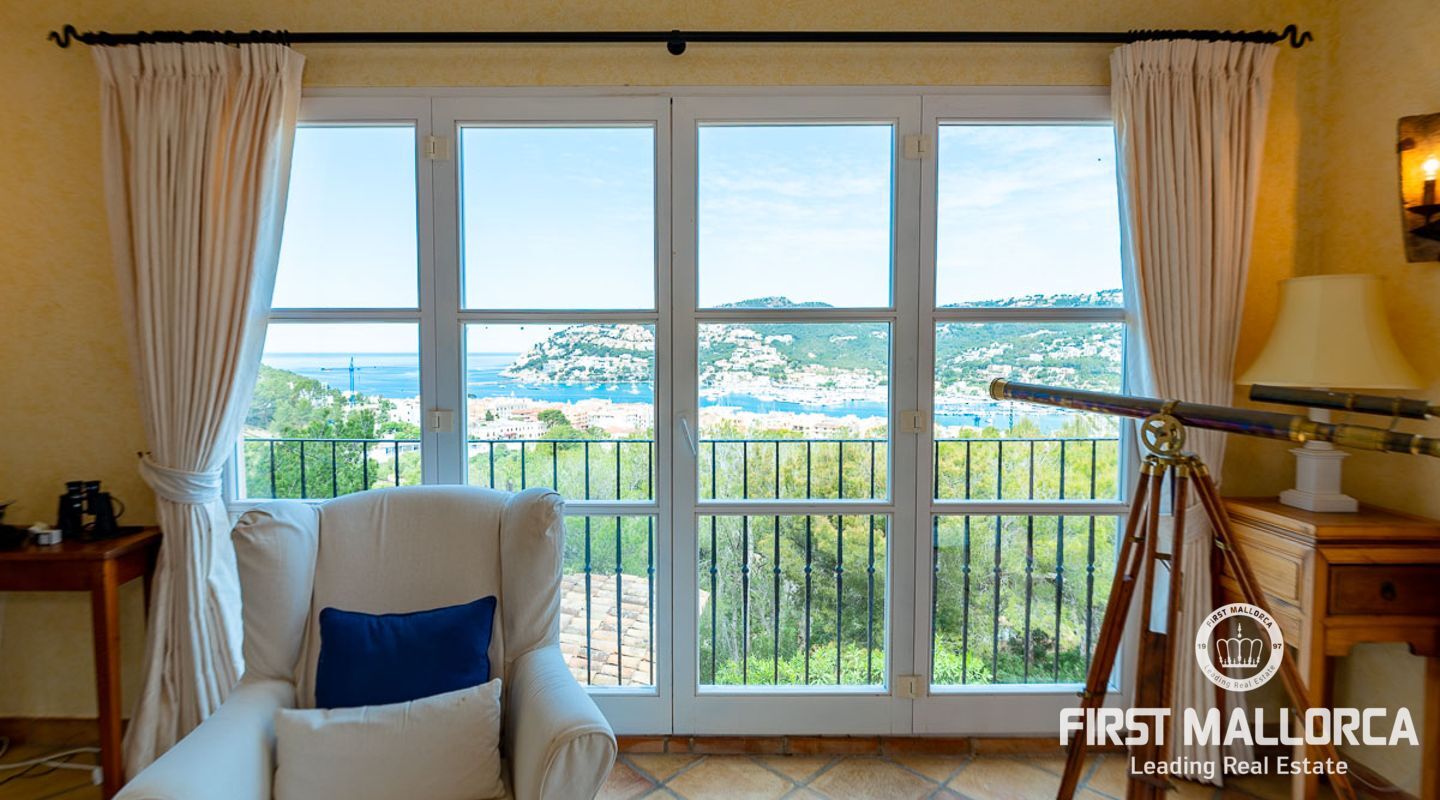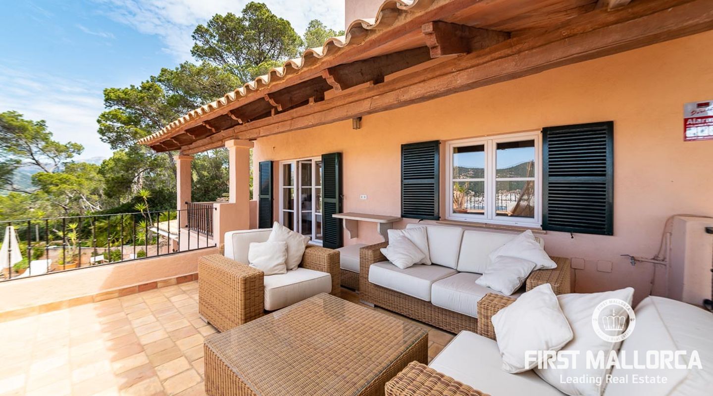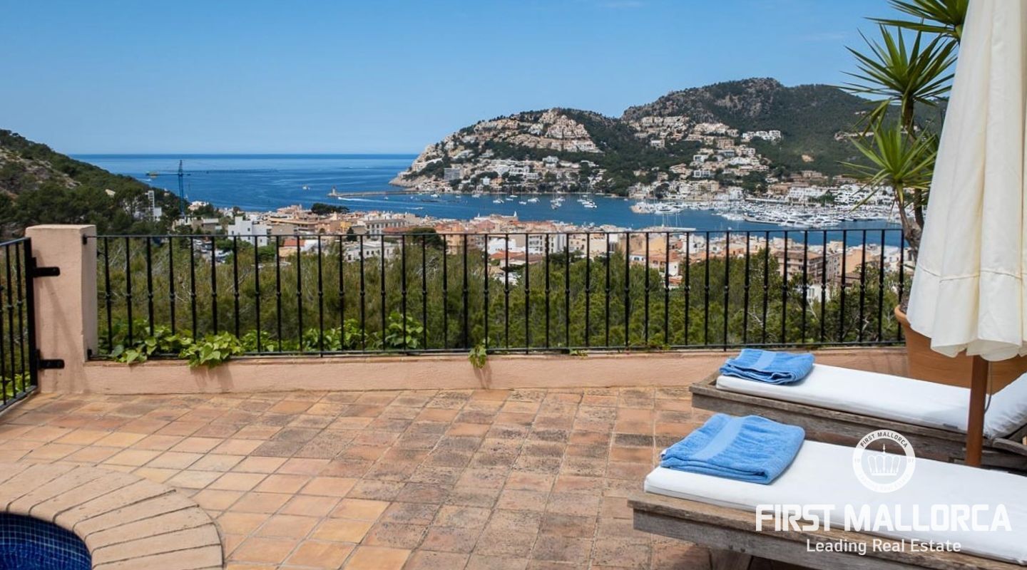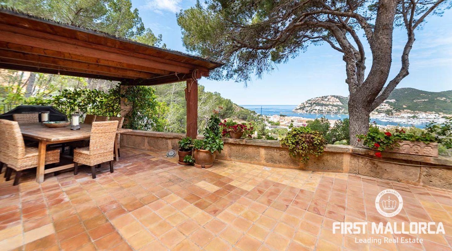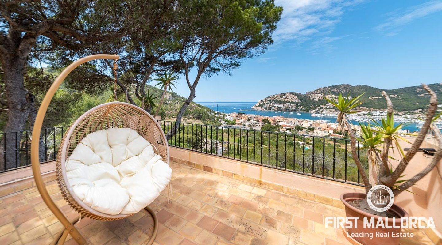 Puerto de Andratx: Spacious sea view house within walking distance to all the amenities that Puerto de Andratx has to offer! Charming, finca style house with 5 bedrooms with ensuite bathrooms in total. 2 bedrooms on the ground floor, 2 bedrooms on the first floor and 1 bedroom with ensuite bathroom with a seperate entrance. Private barbeque with dining area, bar area, Additional features include: Large swimming pool, gas central heating, aircon hot/cold; garage, covered porch area, parking in total for up to 5 cars.
