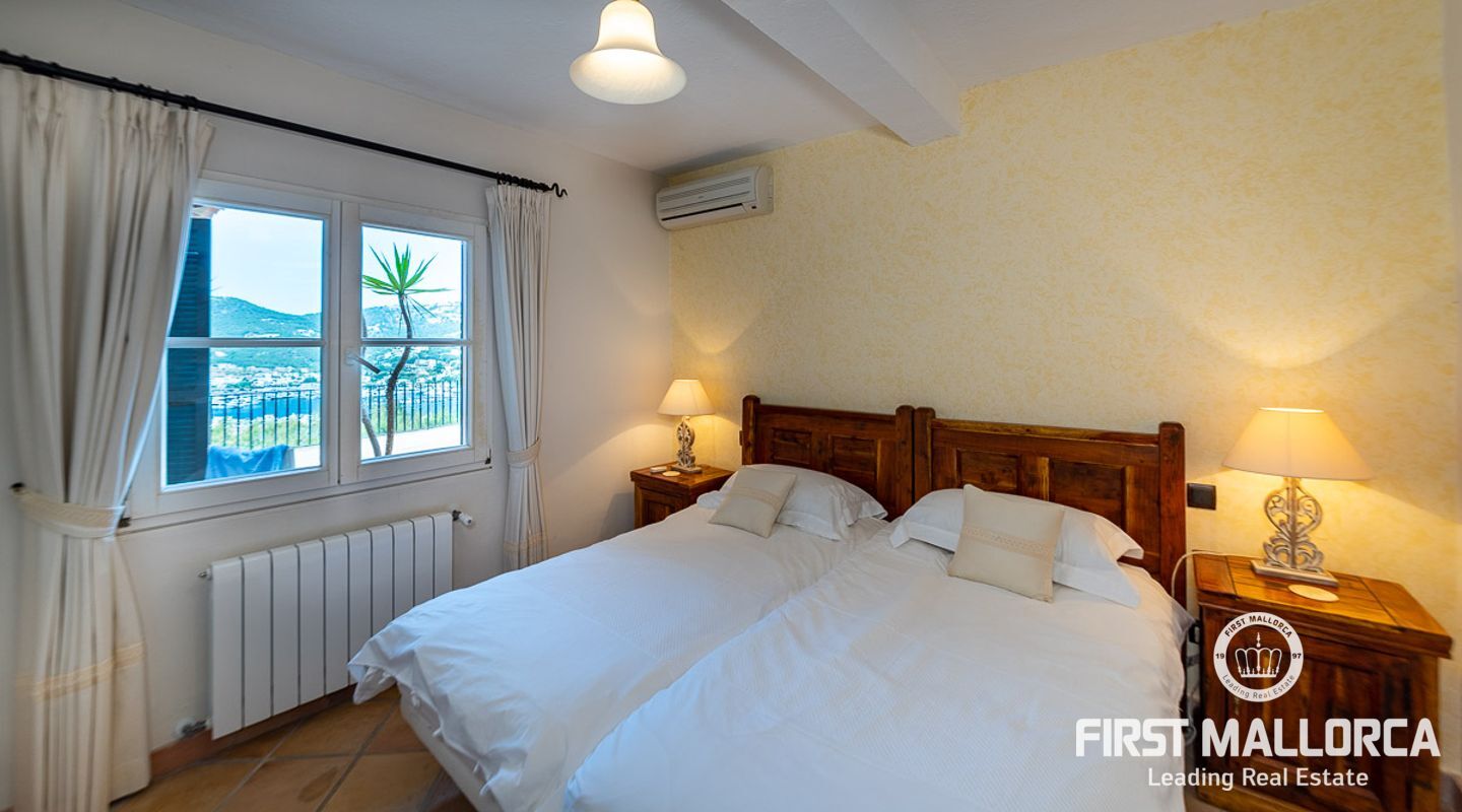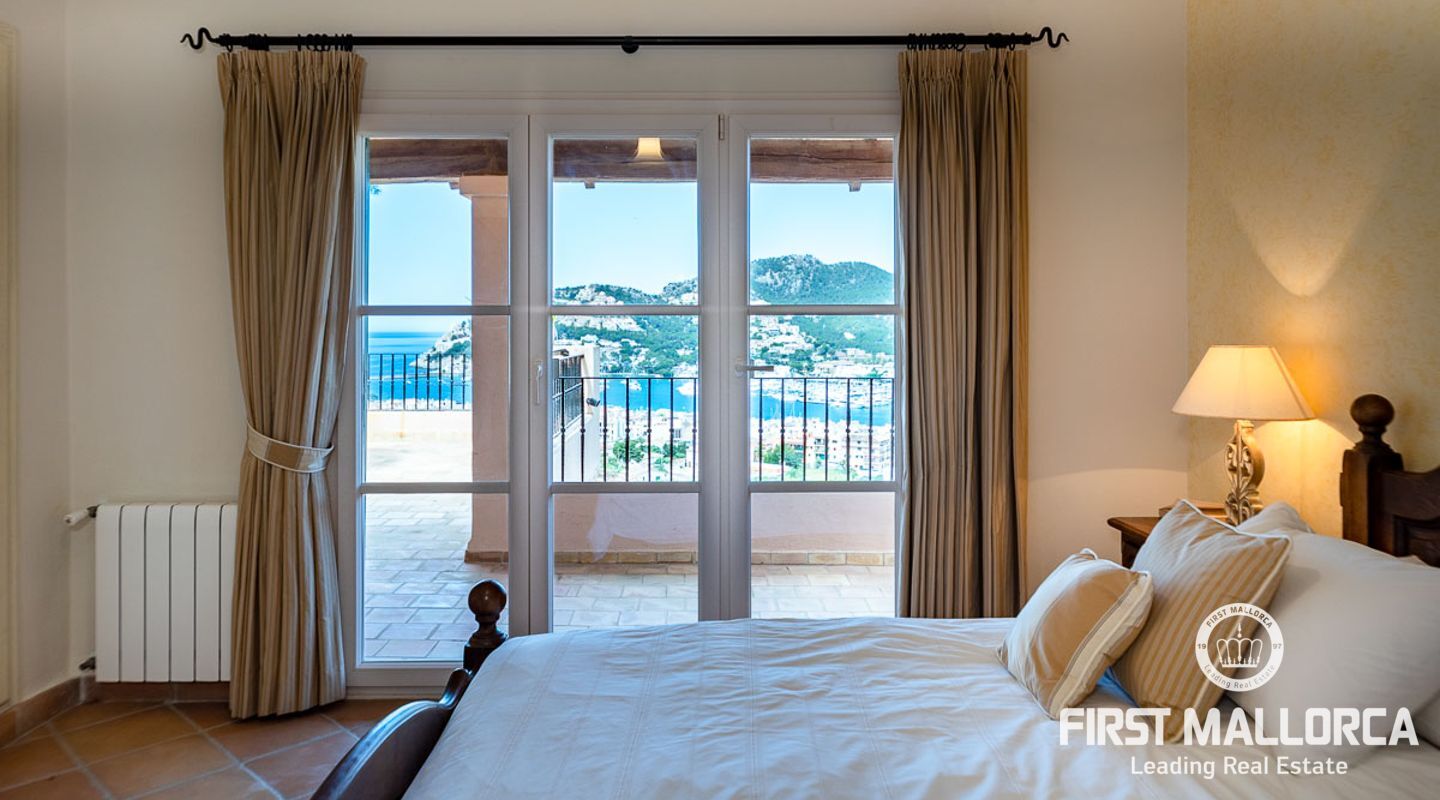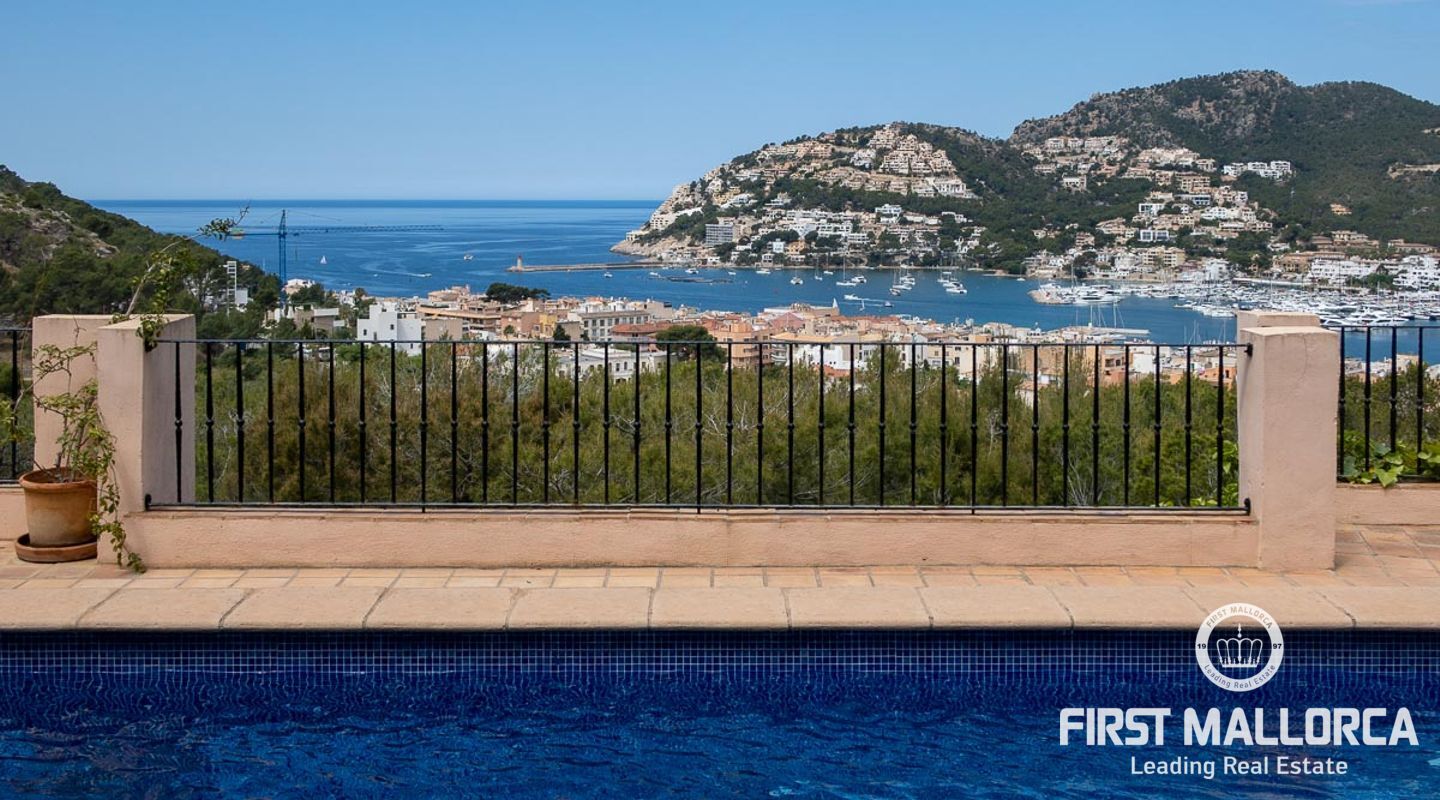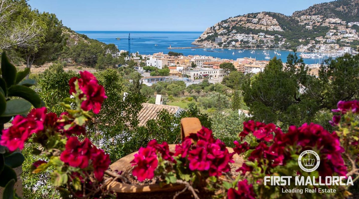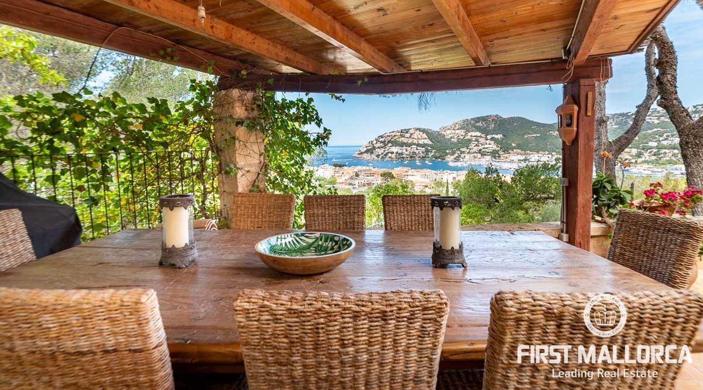 Puerto de Andratx: Spacious sea view house within walking distance to all the amenities that Puerto de Andratx has to offer! Charming, finca style house with 5 bedrooms with ensuite bathrooms in total. 2 bedrooms on the ground floor, 2 bedrooms on the first floor and 1 bedroom with ensuite bathroom with a seperate entrance. Private barbeque with dining area, bar area, Additional features include: Large swimming pool, gas central heating, aircon hot/cold; garage, covered porch area, parking in total for up to 5 cars.
