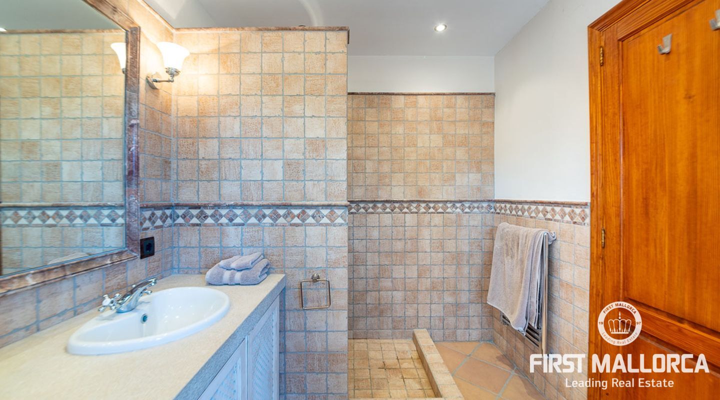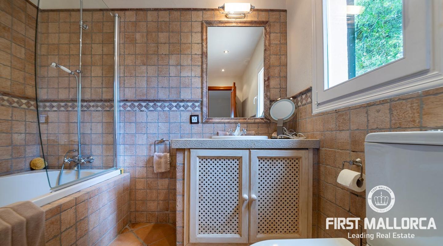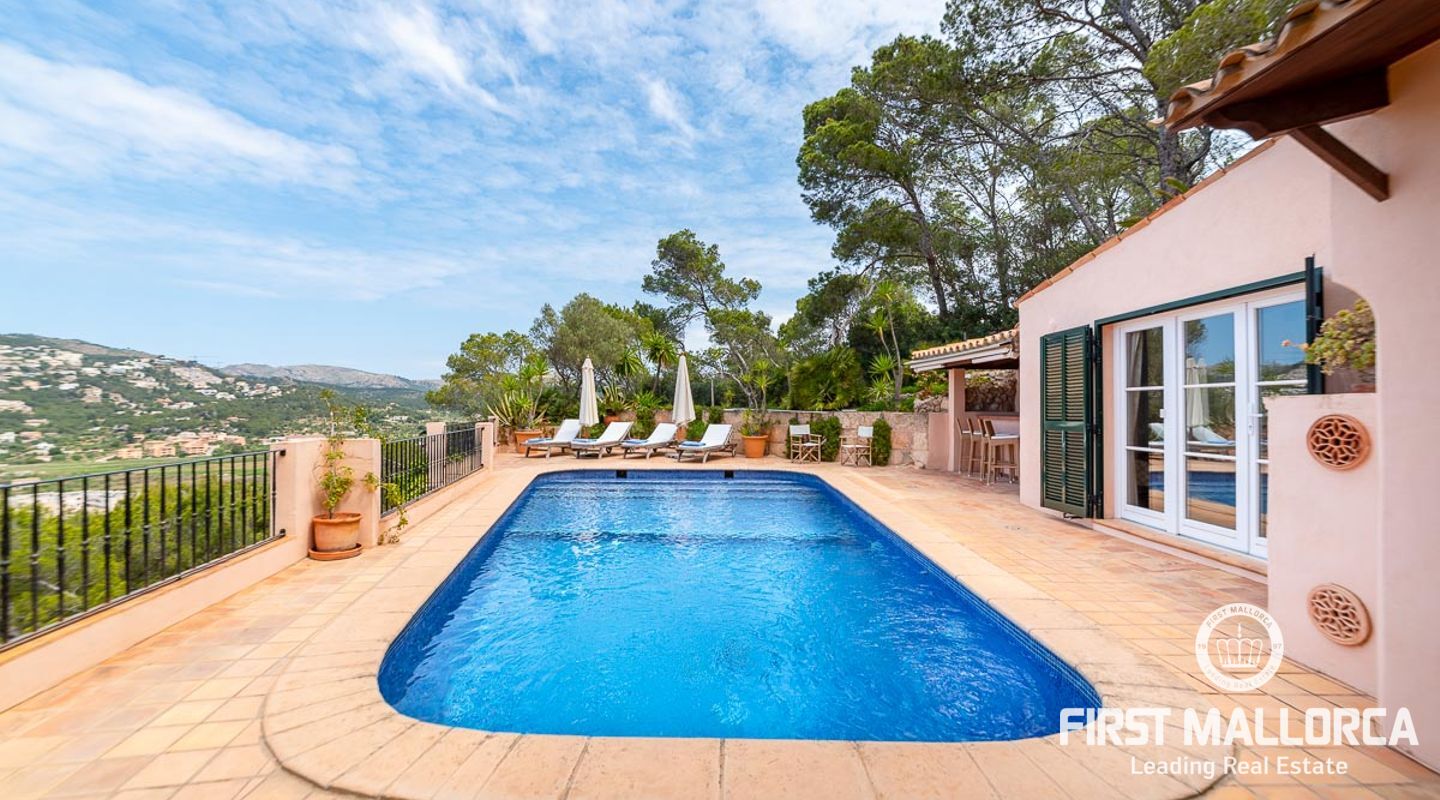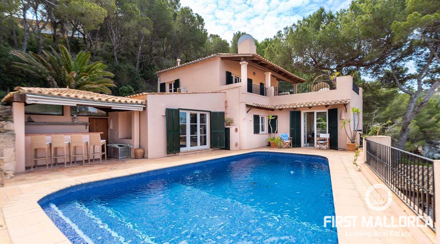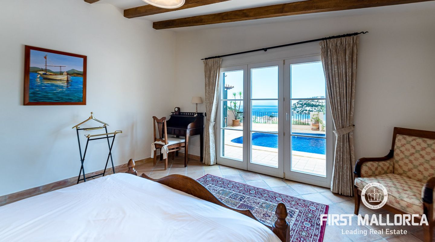 Puerto de Andratx: Spacious sea view house within walking distance to all the amenities that Puerto de Andratx has to offer! Charming, finca style house with 5 bedrooms with ensuite bathrooms in total. 2 bedrooms on the ground floor, 2 bedrooms on the first floor and 1 bedroom with ensuite bathroom with a seperate entrance. Private barbeque with dining area, bar area, Additional features include: Large swimming pool, gas central heating, aircon hot/cold; garage, covered porch area, parking in total for up to 5 cars.