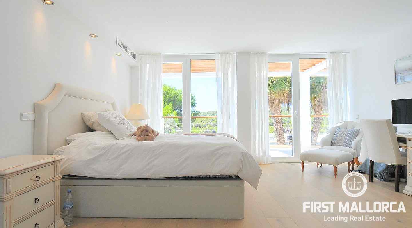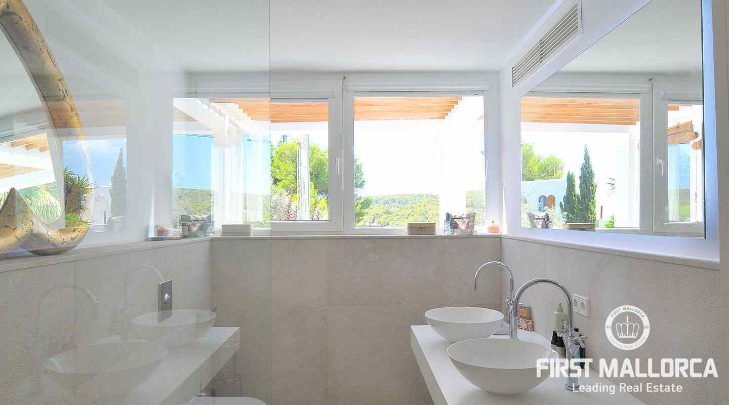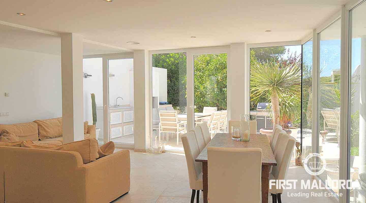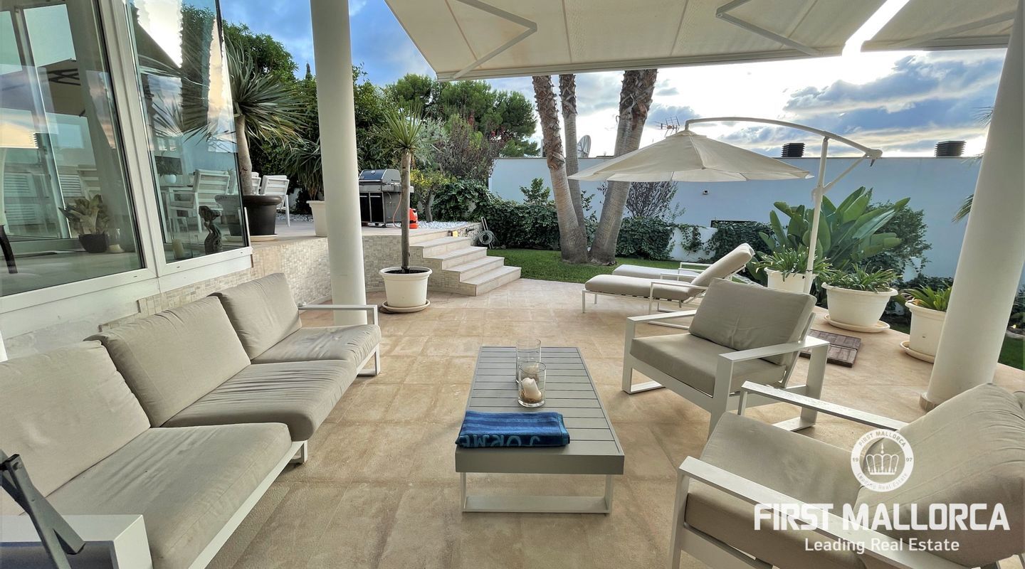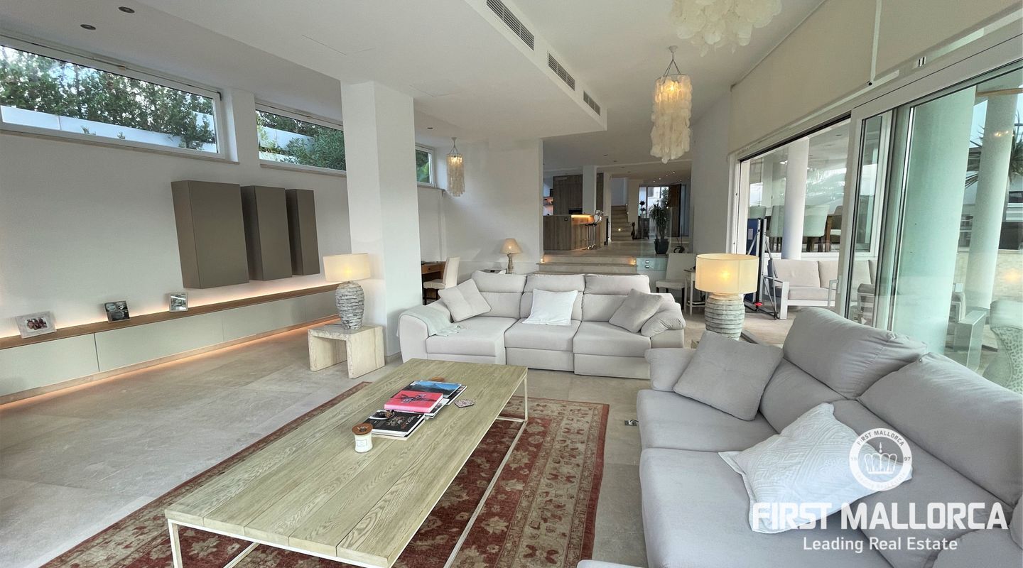 An attractive and spacious contemporary design villa in a peaceful residential area of Sol de Mallorca. The exclusive property is located only a few minutes by car from the fashionable marina of Port Adriano with its cafés, restaurants and boutiques. The 4 bedroom, 4 bathroom villa sits in a garden plot of 1,310 m2. It has a constructed area of 426 m2 including approximately 20 m2 of covered terraces. In addition there are 100 m2 of open terraces and a roof terrace of approximately 85 m2 with excellent views to the sea, the landscape and the mountains. Additional features include an open fireplace, a bar, high quality materials and a storeroom. Within a few minutes walking one finds some of the island's most spectacular beaches as well as a vast protected natural reserve, ideal for hiking.