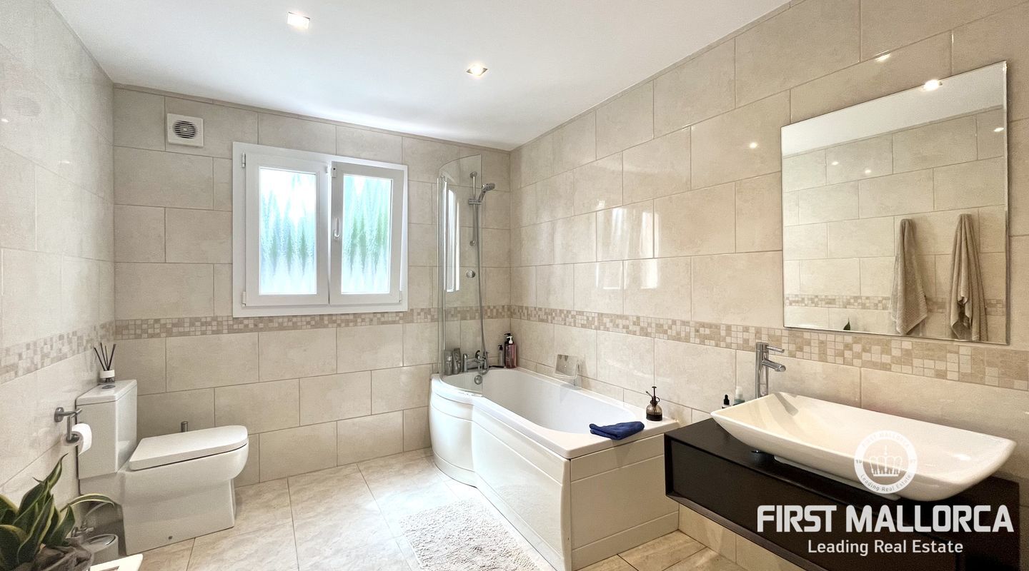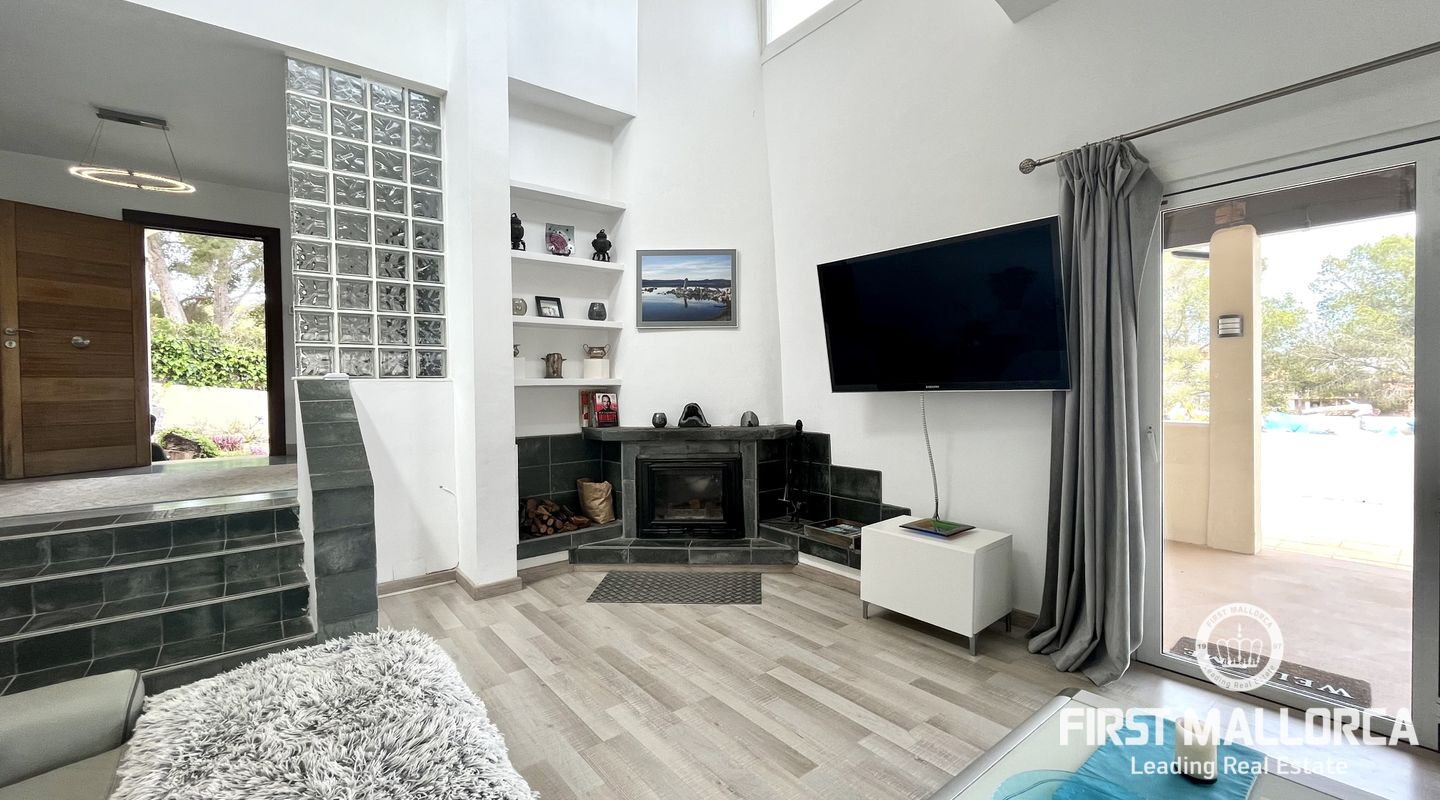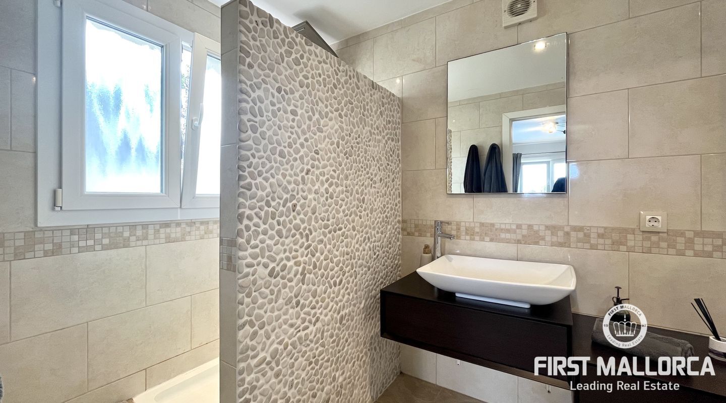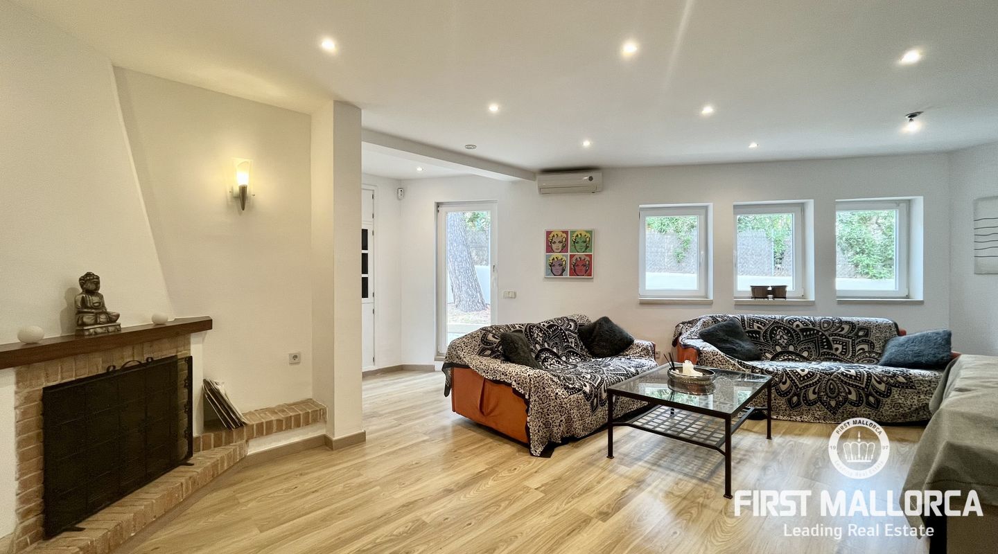The house was built in 1980 ad has a surface of 300m2 on a 1362m2 plot. The ground floor is distributed over a spacious living room with fire place and exit to the invinting pool area and terrace. On the left side there is the spacious open plan kitchen, with island, and another passage to the terrace. Several rooms with en suite bathrooms are on the right side and there is also a second living room with office which could be turned into a separated guest apartment. This property has plenty of space for big families and many friends! The masterbedroom is on the upper floor, with its ensuite bathroom and two terraces, one of them as big as almost the entire house. This wonderful space, with views towards the sea and the eastern coast of Majorca, is currently used for activites and sports, but can also be used to host events.