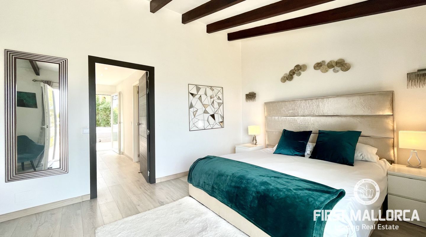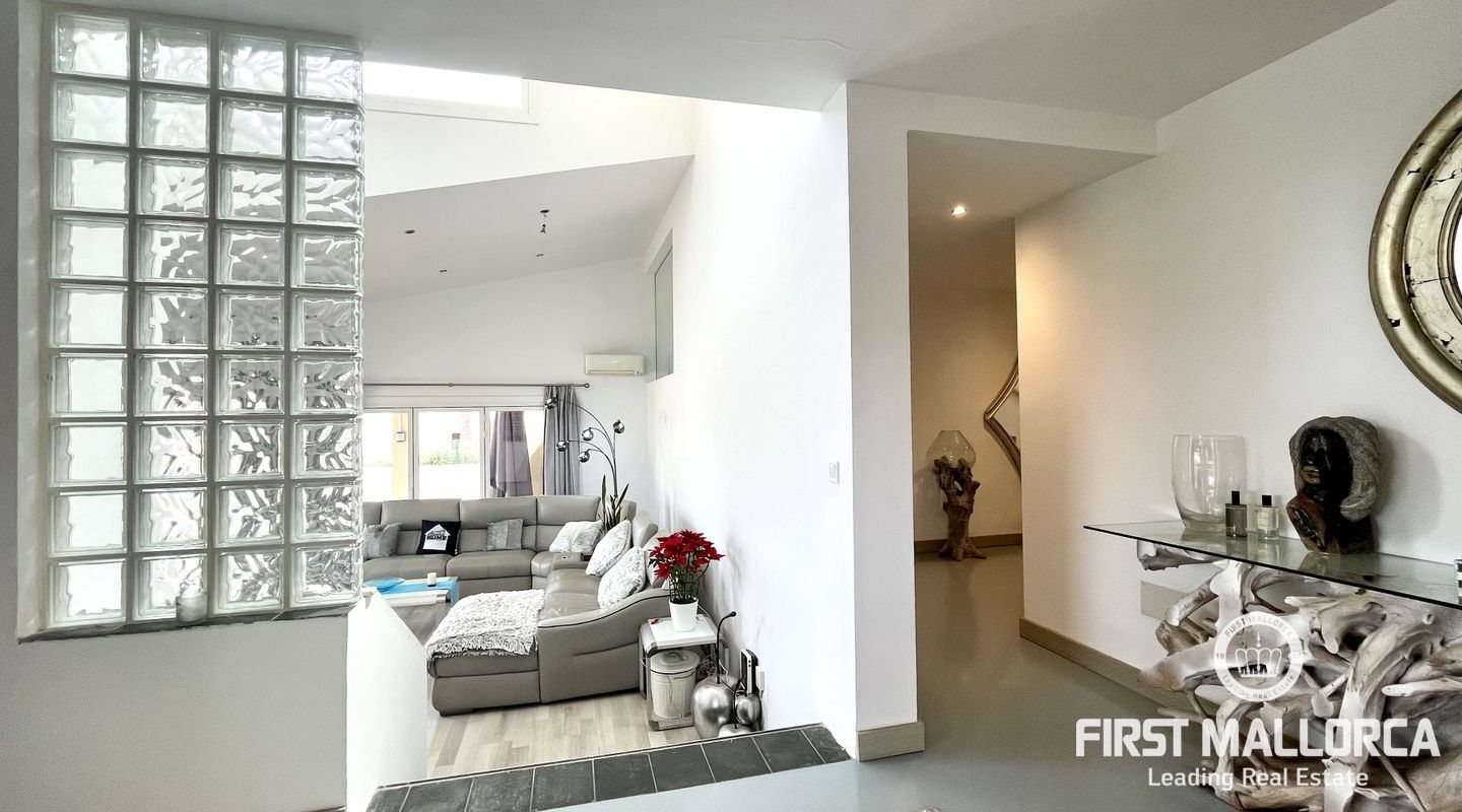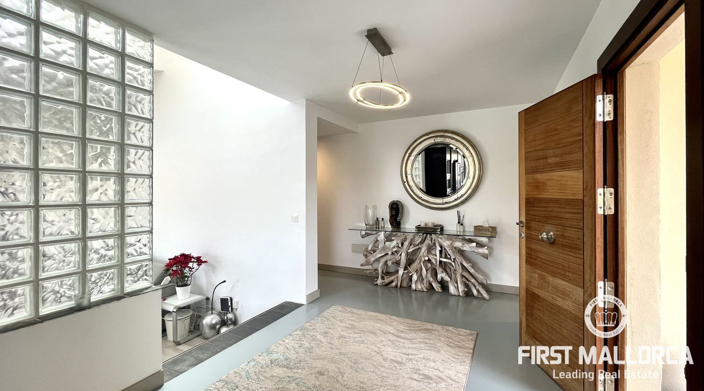The house was built in 1980 ad has a surface of 300m2 on a 1362m2 plot. The ground floor is distributed over a spacious living room with fire place and exit to the invinting pool area and terrace. On the left side there is the spacious open plan kitchen, with island, and another passage to the terrace. Several rooms with en suite bathrooms are on the right side and there is also a second living room with office which could be turned into a separated guest apartment. This property has plenty of space for big families and many friends! The masterbedroom is on the upper floor, with its ensuite bathroom and two terraces, one of them as big as almost the entire house. This wonderful space, with views towards the sea and the eastern coast of Majorca, is currently used for activites and sports, but can also be used to host events.