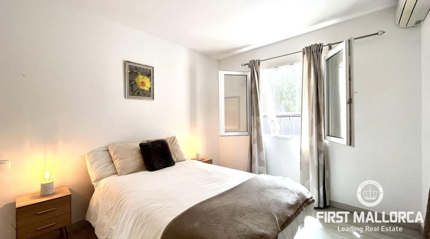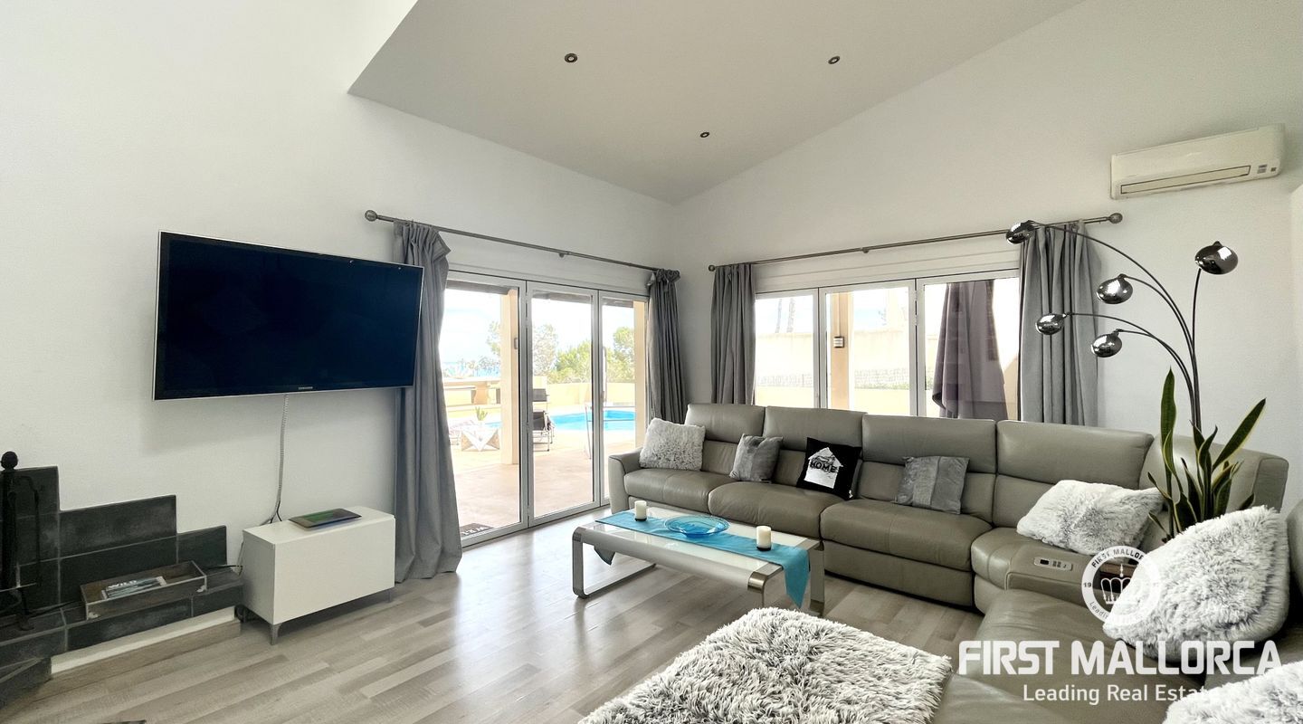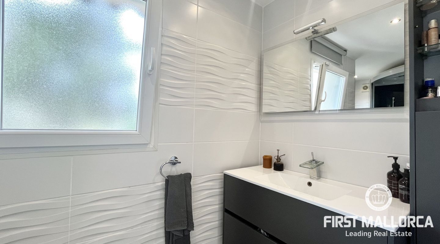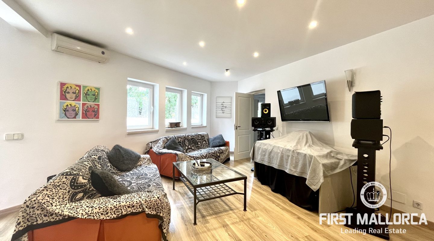 The house was built in 1980 ad has a surface of 300m2 on a 1362m2 plot. The ground floor is distributed over a spacious living room with fire place and exit to the invinting pool area and terrace. On the left side there is the spacious open plan kitchen, with island, and another passage to the terrace. Several rooms with en suite bathrooms are on the right side and there is also a second living room with office which could be turned into a separated guest apartment. This property has plenty of space for big families and many friends! The masterbedroom is on the upper floor, with its ensuite bathroom and two terraces, one of them as big as almost the entire house. This wonderful space, with views towards the sea and the eastern coast of Majorca, is currently used for activites and sports, but can also be used to host events.