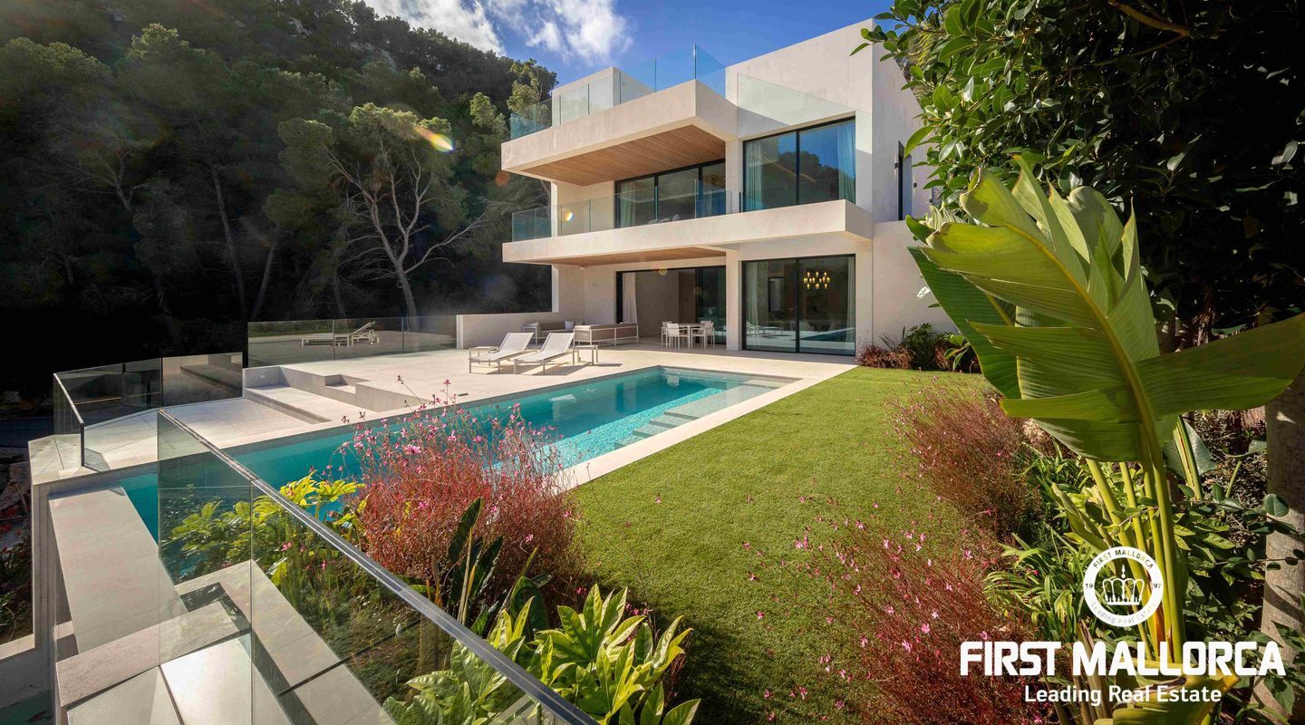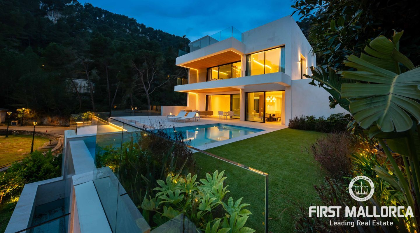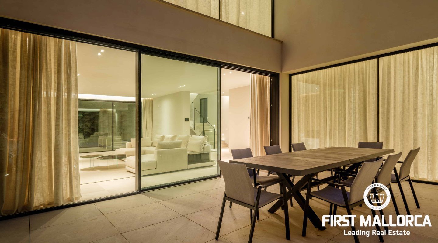 The property was completed a few months ago and is located in the most exclusive and luxurious residential area of the island. The constructed area of approx. 650m2 is distributed over several levels: On the ground floor, a living-dining room with direct access to the large partially covered terrace, a fully equipped open-plan kitchen, a utility room, a guest toilet, a bedroom with en suite bathroom and direct access to the terrace. On the upper floor there is the master bedroom with dressing area and bathroom en suite as well as two further bedrooms, each with its own bathroom. In the basement there is a spacious garage with space for several cars, a bedroom with en suite bathroom for service, a storage room and a technical room. The equipment is of high quality and includes large floor-to-ceiling double-glazed French doors, fully equipped Miele kitchen, lift, Smarthome system, underfloor heating with heat pump, bio-ethanol fireplace, air conditioning h/c and a roof terrace.