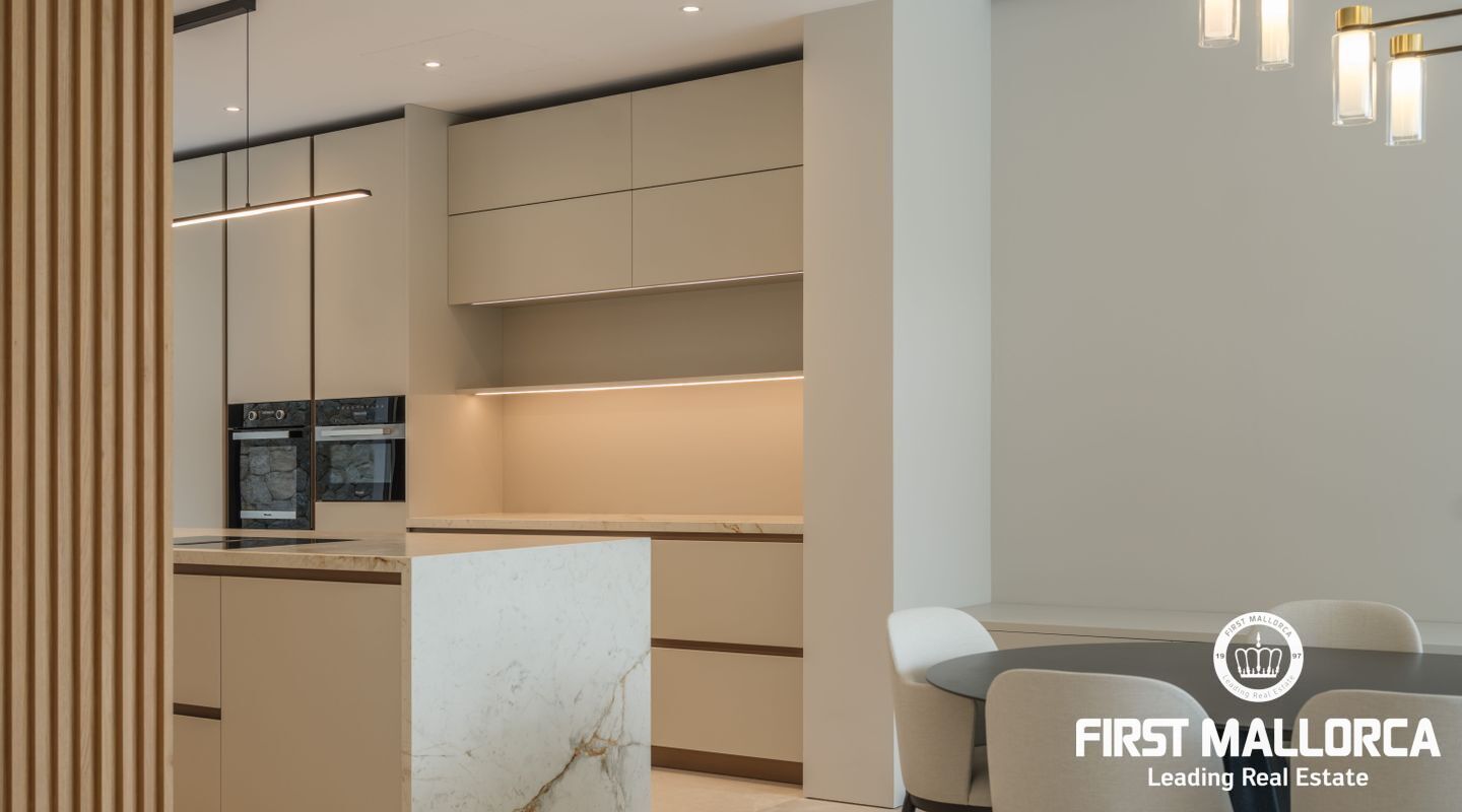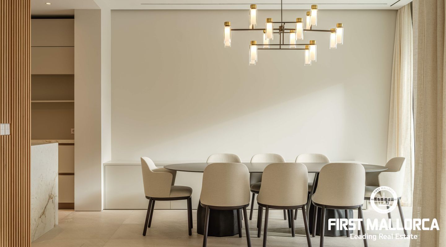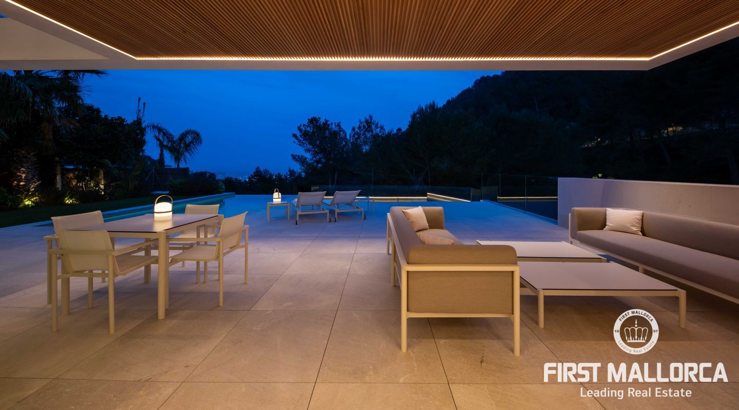 The property was completed a few months ago and is located in the most exclusive and luxurious residential area of the island. The constructed area of approx. 650m2 is distributed over several levels: On the ground floor, a living-dining room with direct access to the large partially covered terrace, a fully equipped open-plan kitchen, a utility room, a guest toilet, a bedroom with en suite bathroom and direct access to the terrace. On the upper floor there is the master bedroom with dressing area and bathroom en suite as well as two further bedrooms, each with its own bathroom. In the basement there is a spacious garage with space for several cars, a bedroom with en suite bathroom for service, a storage room and a technical room. The equipment is of high quality and includes large floor-to-ceiling double-glazed French doors, fully equipped Miele kitchen, lift, Smarthome system, underfloor heating with heat pump, bio-ethanol fireplace, air conditioning h/c and a roof terrace.