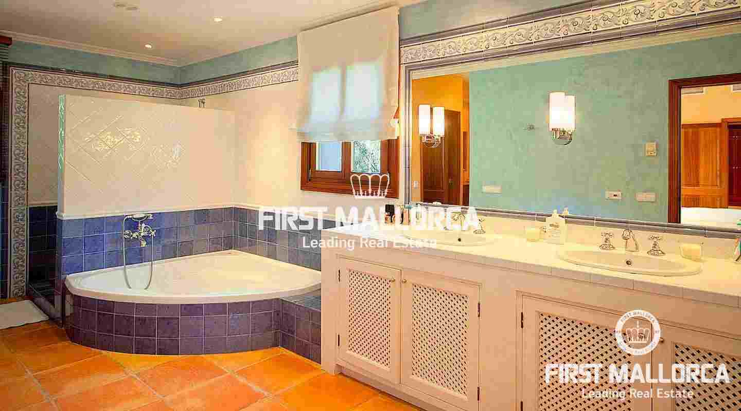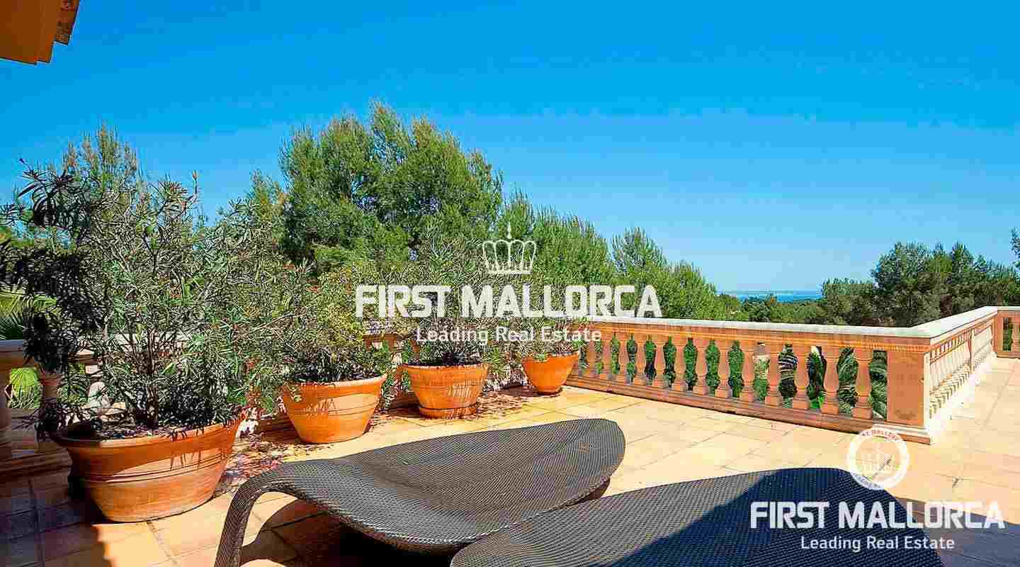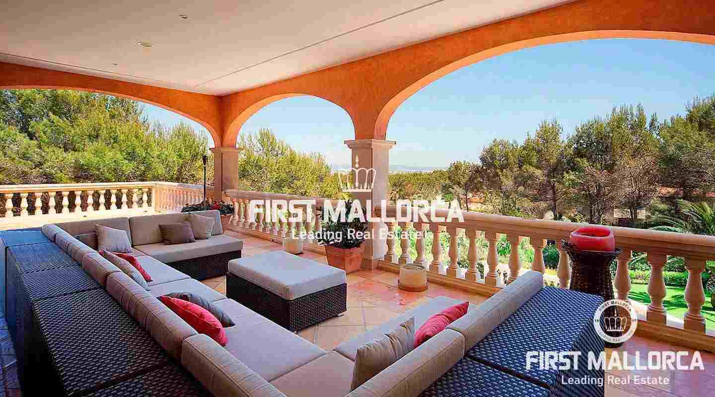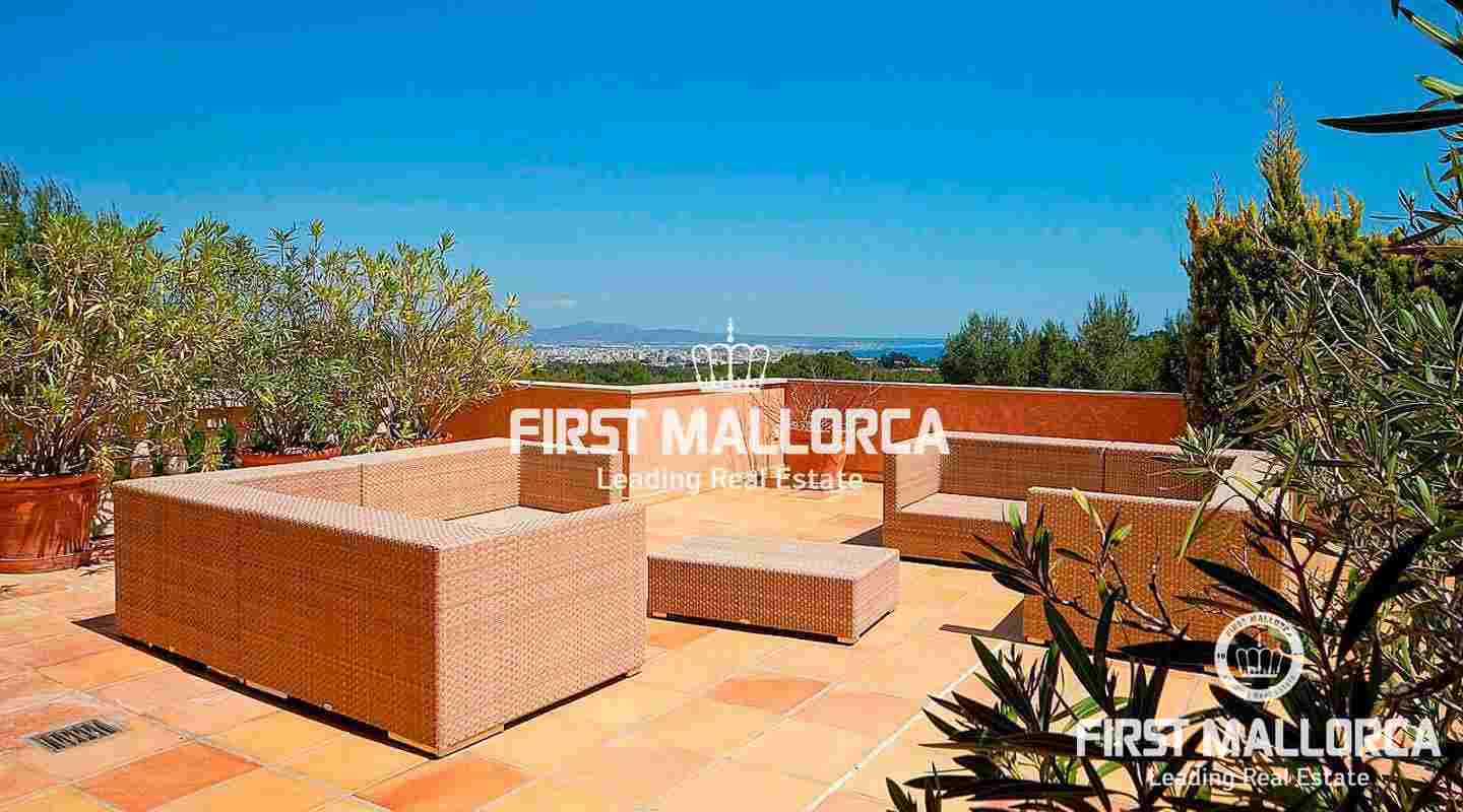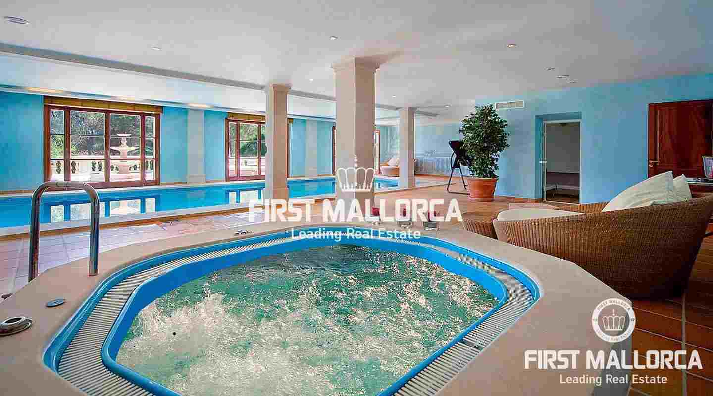 An impressive luxury villa in the exclusive residential area of Son Vida. The South facing property enjoys delightful views over the bay of Palma. The villa with 4 bedrooms and 4 bathrooms, including a separate guest house, is set on a wonderful garden plot of 6,556 m2. It has a constructed area of 727 m2 including 95 m2 of covered terraces plus 163 m2 of open terraces. Additional features include a fireplace, a sophisticated air-conditioned wine cellar with tasting area, terracotta floors, central music equipment, precious wood works, osmotic plant for the total water supply, automatic irrigation system and a workshop. The Spa features a long indoor pool with natural chlorine produced by a salt electrolysis system, whirlpool, sauna and a steam bath. Son Vida is the oldest urbanization in Mallorca and one of the most prestigious residential areas on the island. Son Vida is centrally located and embedded within 3 superb golf courses, only a couple of minutes away from the city of Palma and various marinas. There are 2 exclusive 5-Star Hotels in the area. The well known Son Vida Hotel belongs to the "Leading Hotels of the World" and has welcomed famous visitors such as Grace Kelly or Aristoteles Onassis.