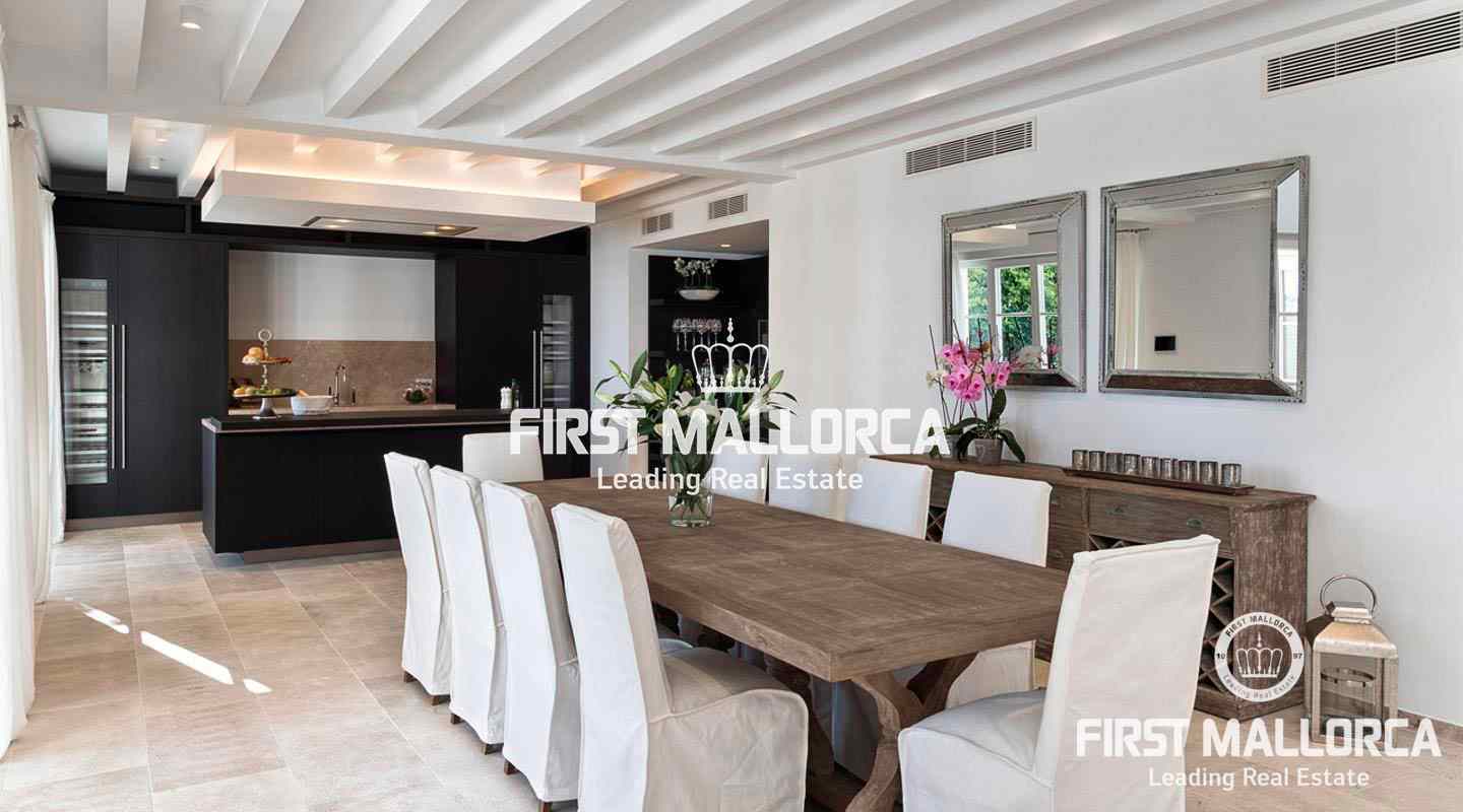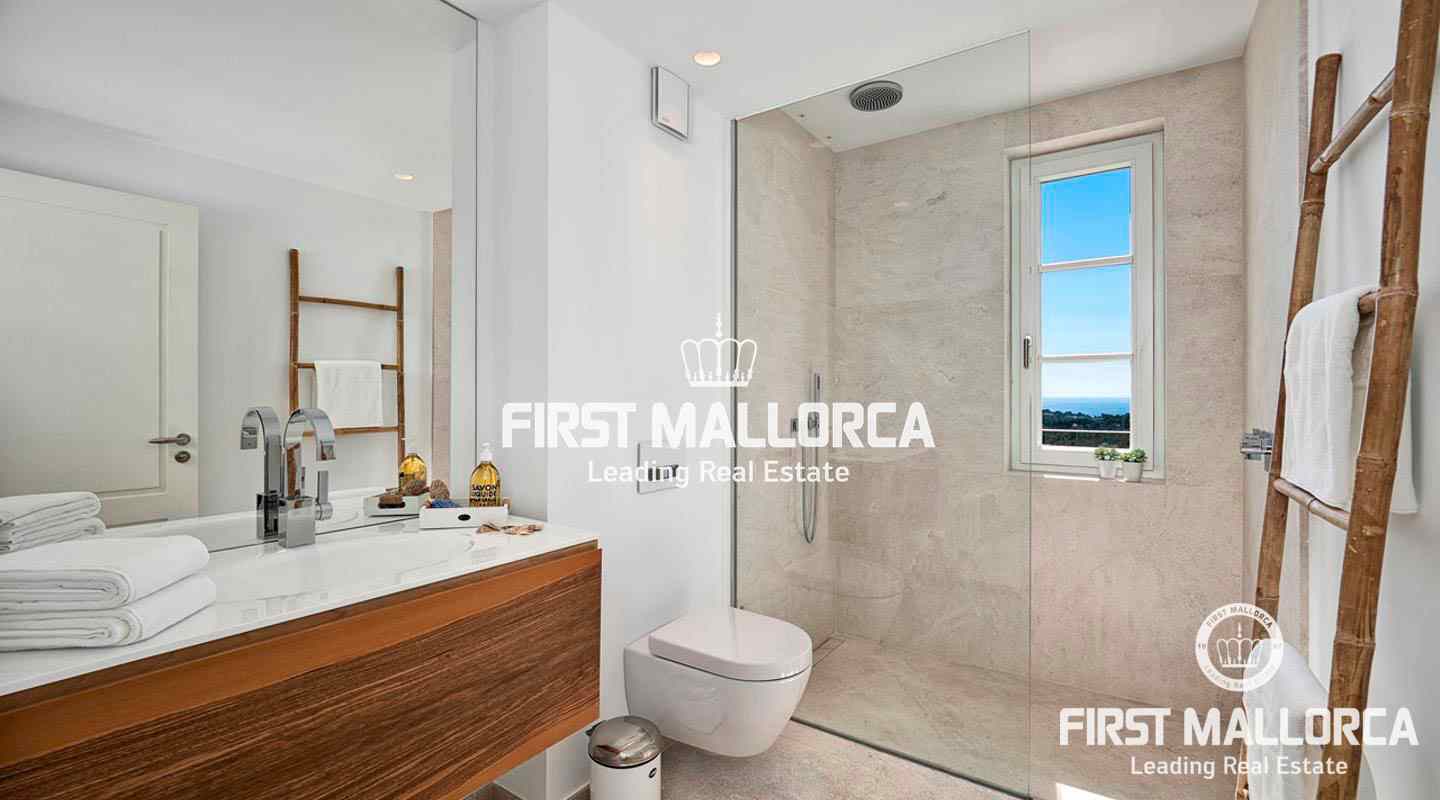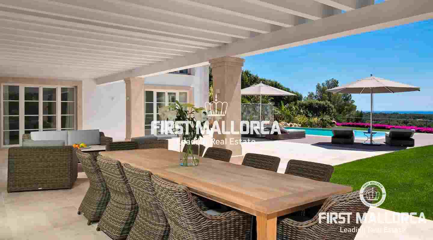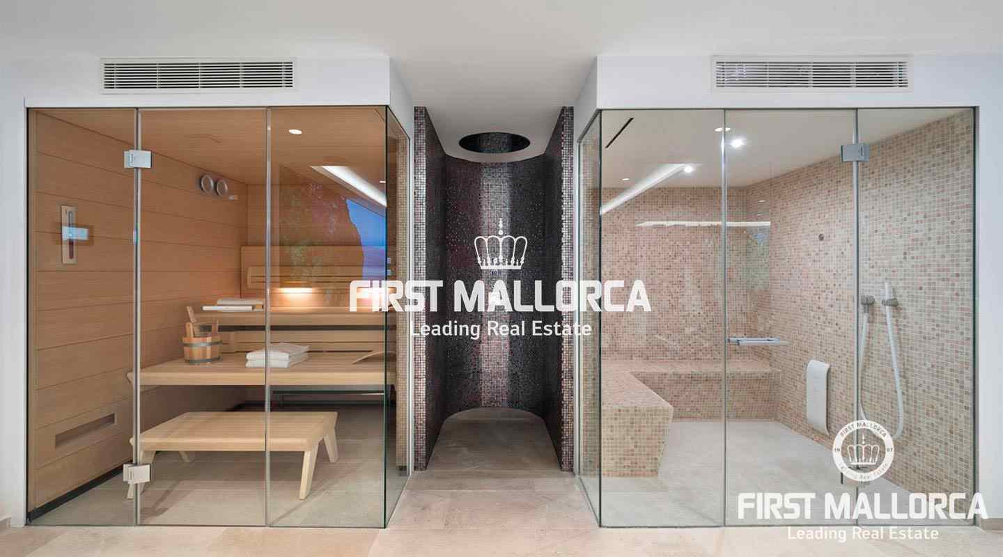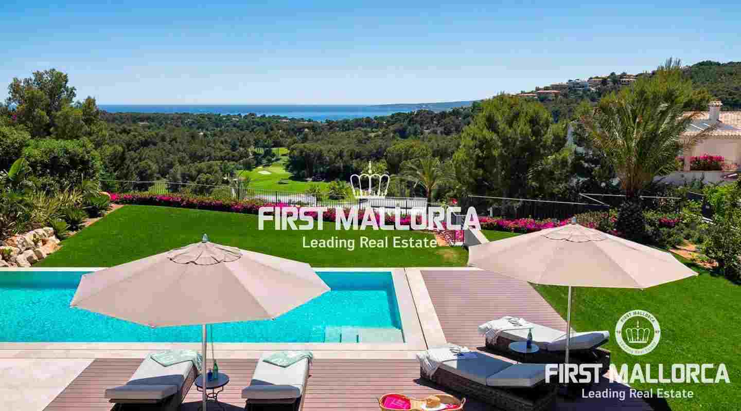 This villa really leaves nothing to be desired: everything was planned down to the smallest detail and only the highest quality materials were used. Mallorcan style and state-of-the-art technology harmonize with each other and the property offers a beautiful Mediterranean garden with salt water pool and a wonderful view of the golf course and the sea. The light-flooded new building with 5 bedrooms is not only the perfect family home, but also features many extras such as an elevator, a fitness area with various saunas, cinema room and a garage for 4 cars. The high quality furnishing is included in the price.