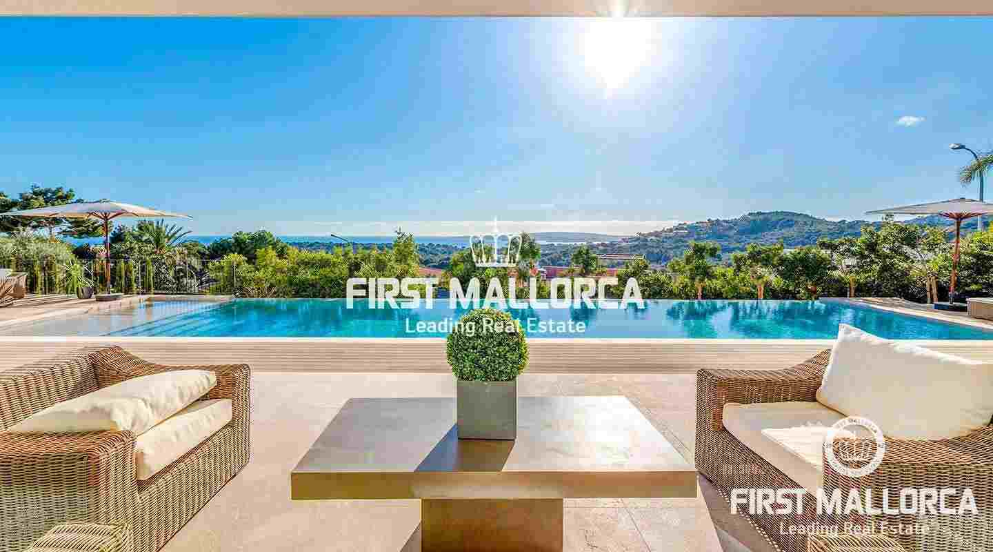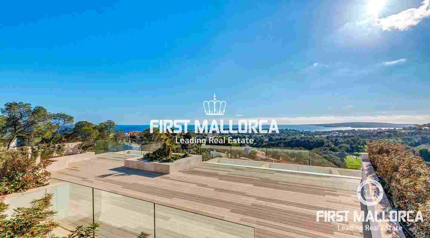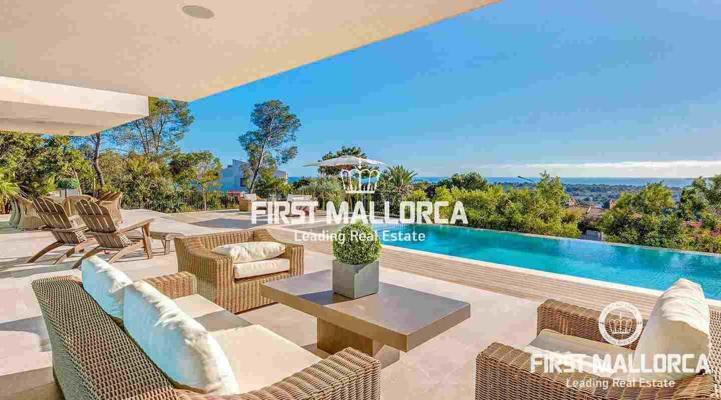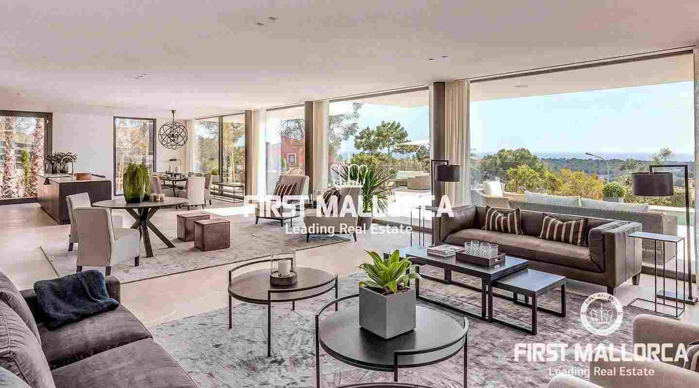 This unique, south-west facing villa in an elevated location in Cas Catalá enjoys superb views of the Bendinat Golf course and the sea.