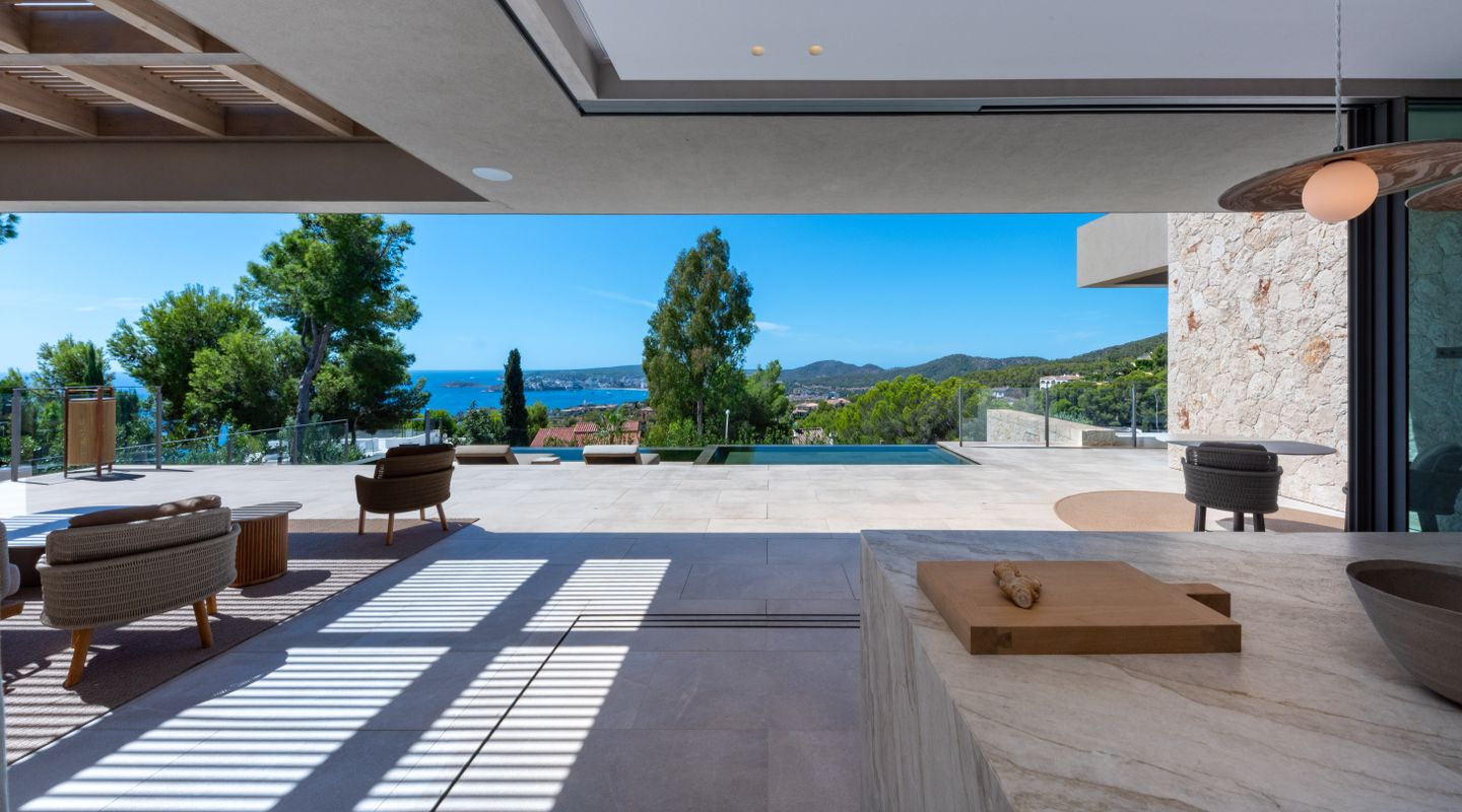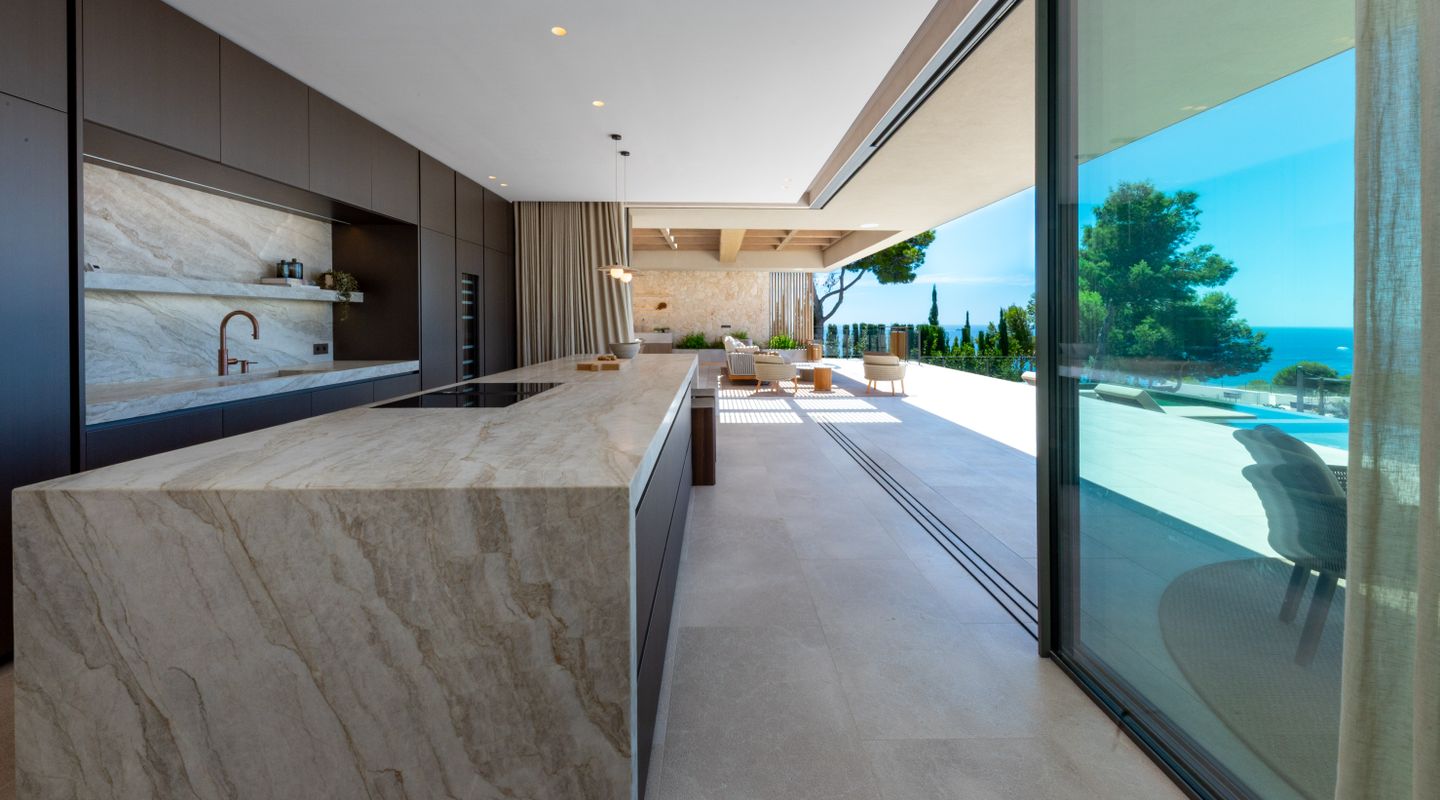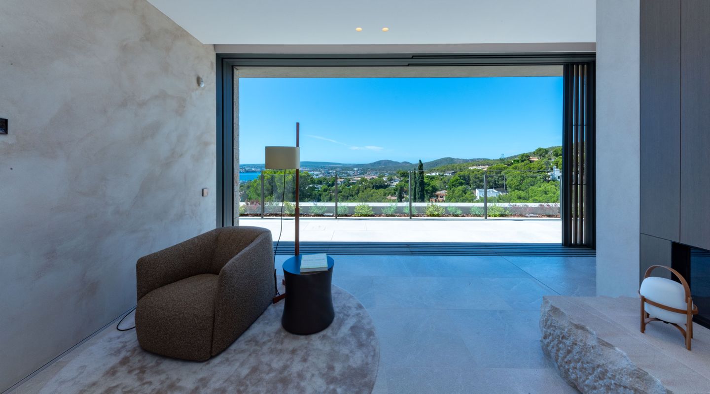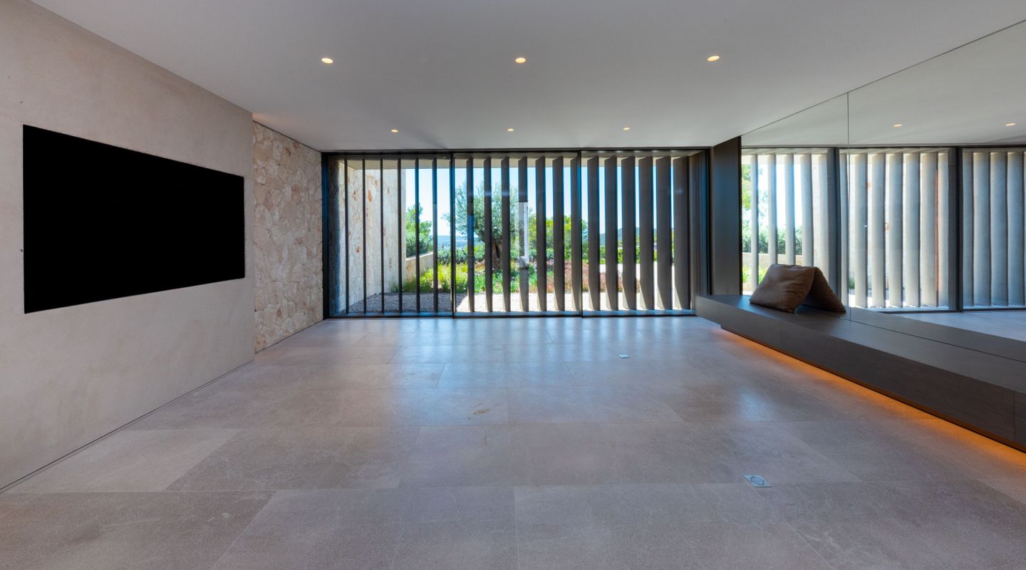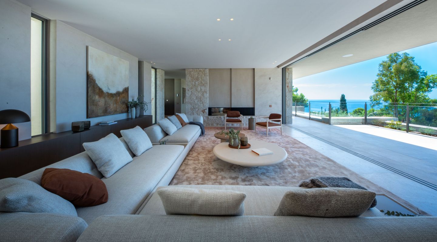 Carefully crafted and constructed by one of the most reputable companies on the island, this property is spread over three levels offering the following distribution: entry by car is a marvellous experience, directly into the 235m2 garage with space for over 6 cars and access via a luxury foyer into the villa. On this same level there is a home cinema, staff bedroom ensuite, generous laundry room, technical room, stairs and a lift to all levels. The next level where the main guest entrance invites into an impressive reception area with a feature staircase leading upstairs, 3 generous ensuite double bedrooms, a master suite with dressing room and a private terrace, a relaxing area, an office, an interior patio and the spa area with gym/yoga room, jacuzzi, sauna and a bathroom, complete this area of the property. Upstairs on the top floor level is the main living room with a double sided fireplace, a dining area, a reading corner and an incredible Poliform kitchen where the doors slide into the walls inviting the sea views and breeze into the villa as it becomes one with the terrace and swimming pool. In addition there is a prep kitchen, a summer kitchen, a beautiful water feature with olive trees, a dining area and relaxing exterior lounge, all enjoying wonderful sea and landscape views across the infinity swimming pool. The main master bedroom suite with an adjoining living room and fireplace, a luxury dressing room, private terrace is well appointed on this level ensuring a very comfortable lifestyle. Beautifully landscaped gardens and level lawns surround the villa creating an oasis of peace and tranquility.